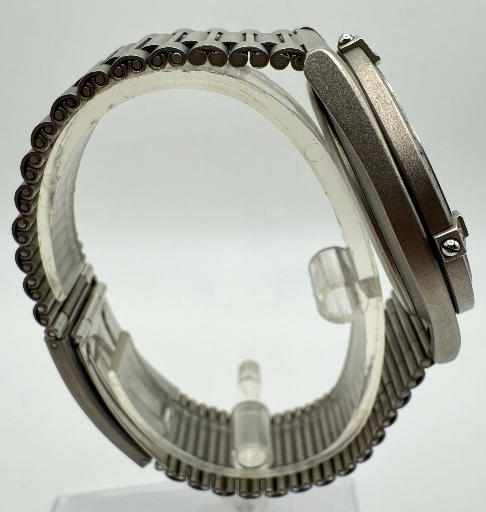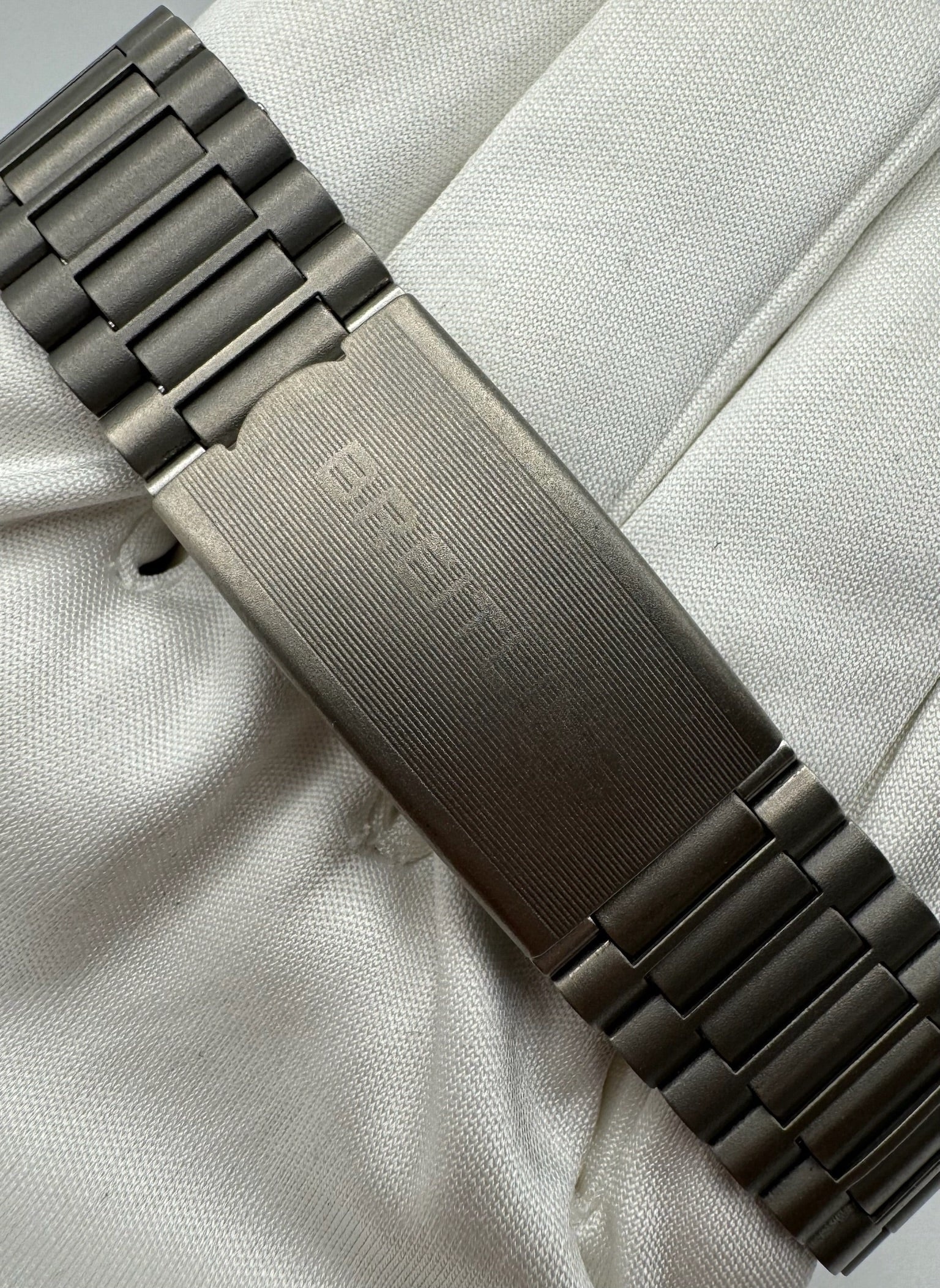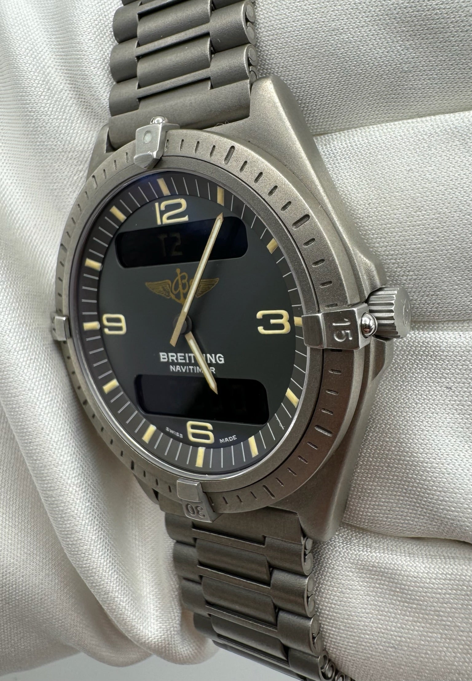 Presenting a spectacular find for collectors and aficionados alike: the Vintage Breitling Aerospace in full titanium, a pristine example of 1990s horological engineering. This timepiece is a rarity, still in its new old stock condition with an untouched bracelet that has never been resized.