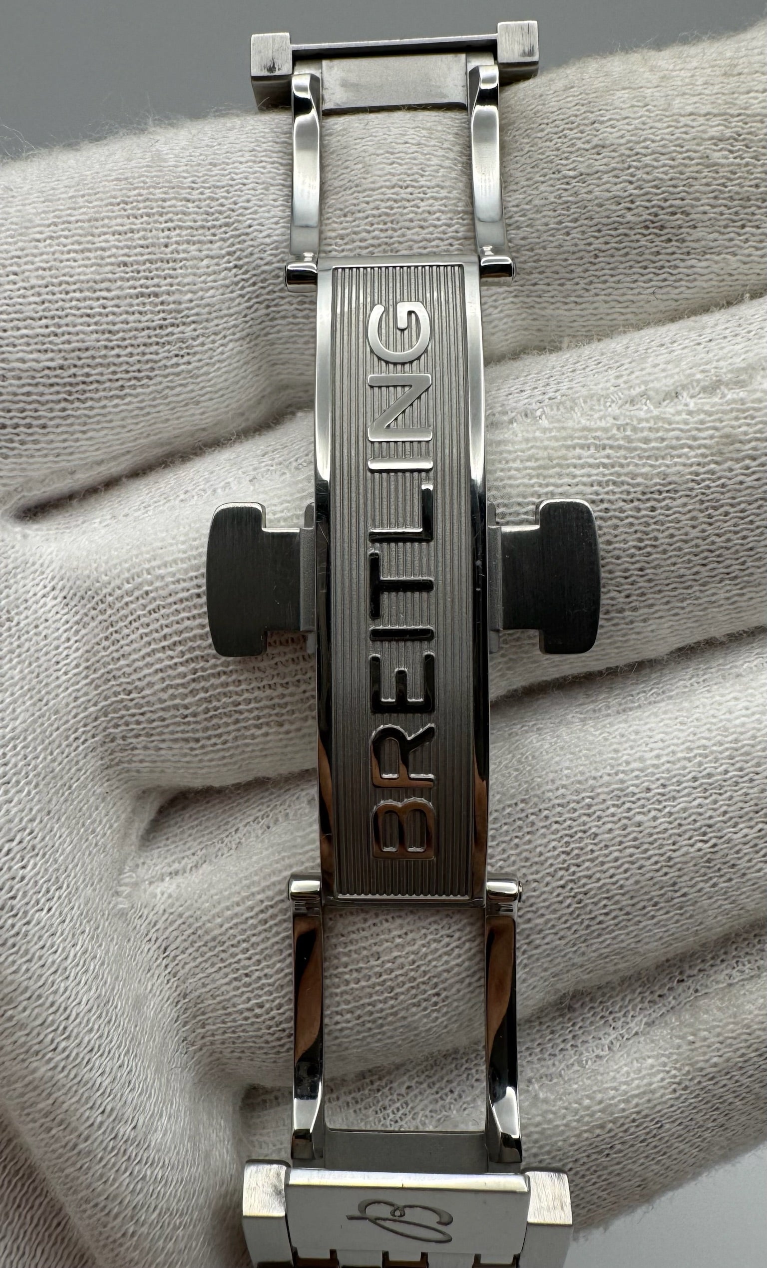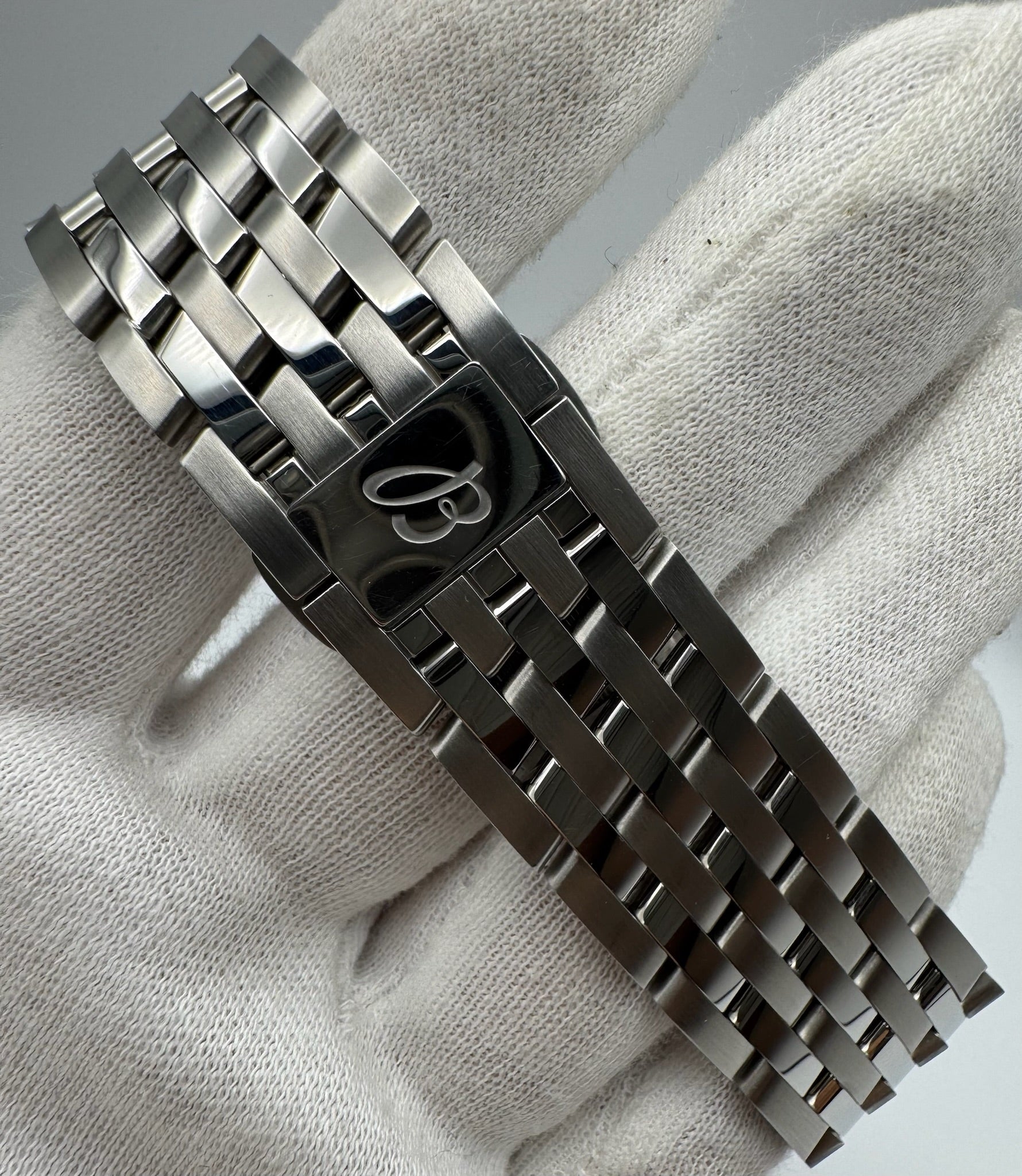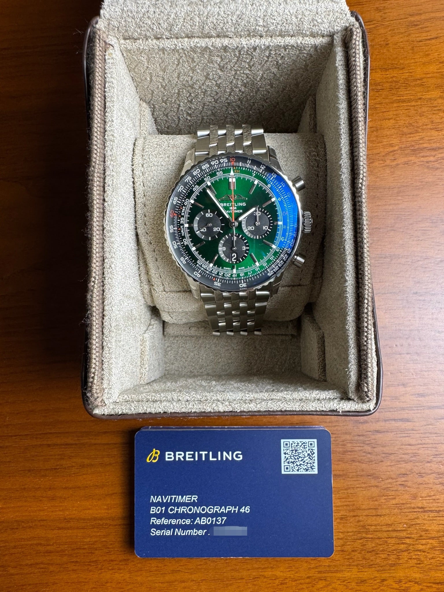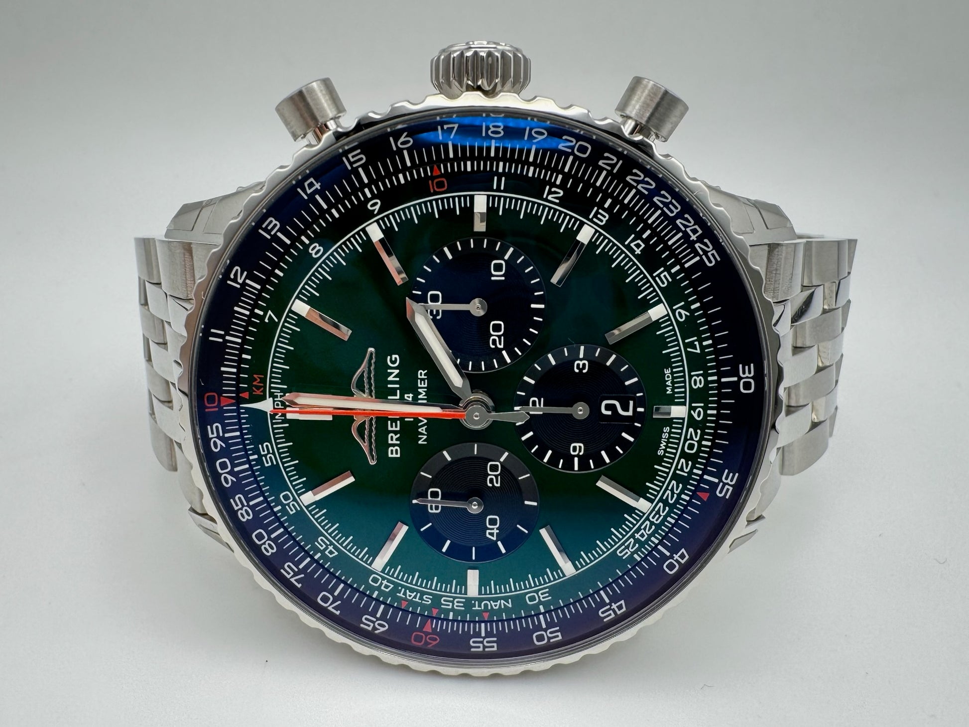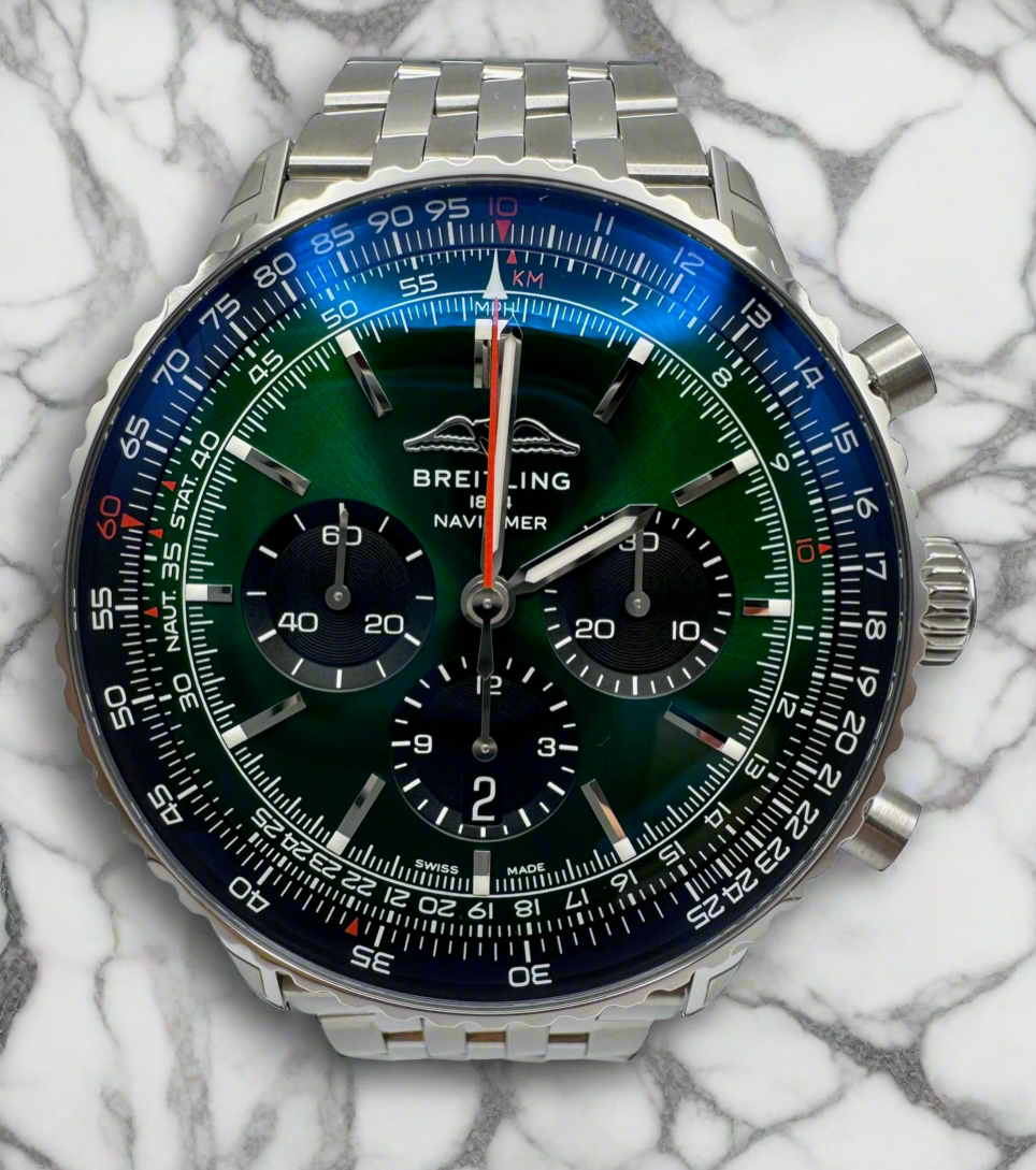 Breitling Navitimer Ref. AB0137241L1A1 presented in full stainless steel with striking green dial, all original and in excellent to like-new condition. The watch has been worn only twice, sized to the wrist, and worn for just a few hours. The case retains its factory stickers, while the bracelet shows only minimal hairlines on the buckle from storage. Additional links are included in the box. This example comes complete with its original box and papers, making it an outstanding modern Navitimer for collectors and enthusiasts alike.