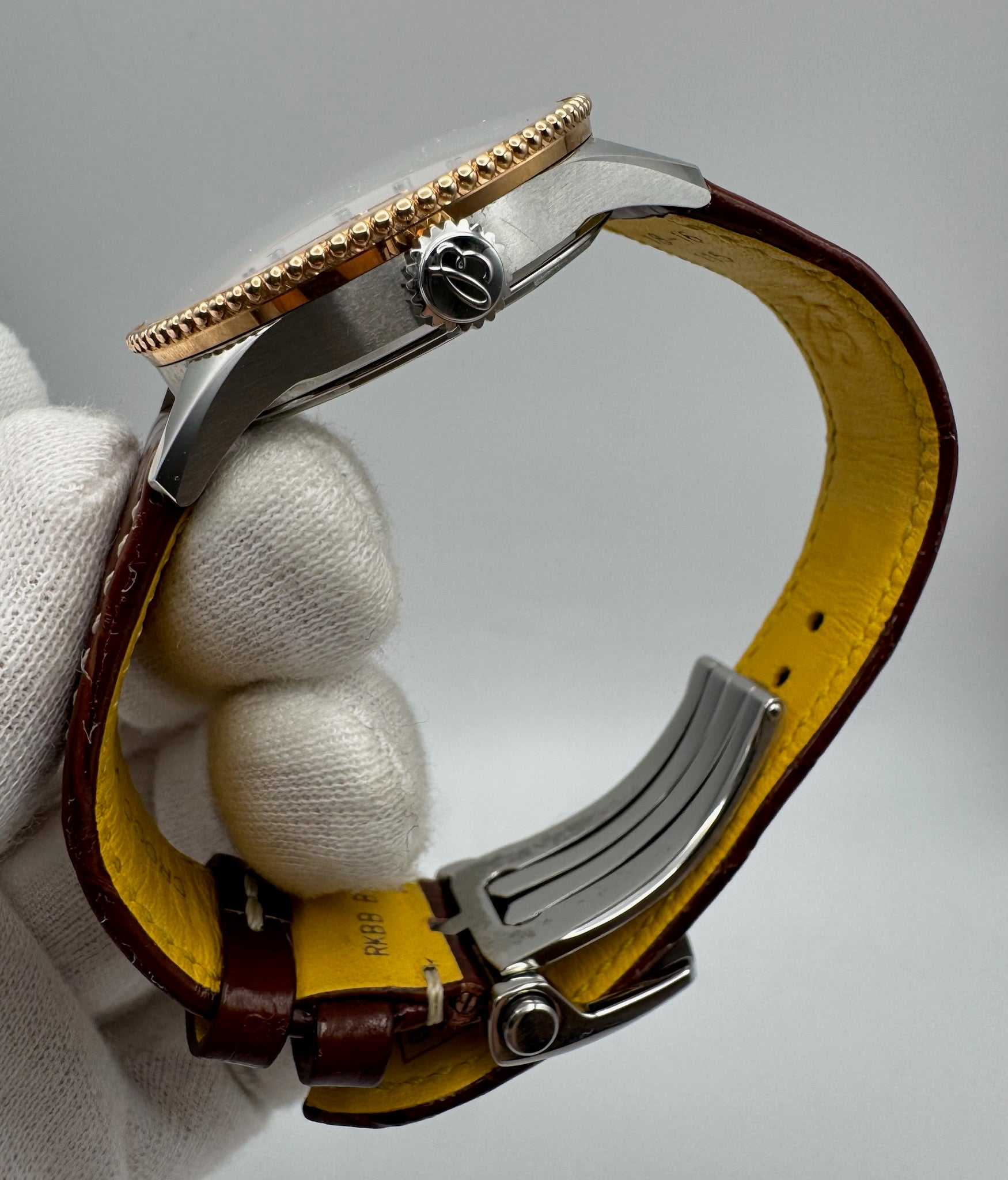 The factory mother-of-pearl dial is beautifully accented with diamond hour markers, complemented by rose gold indices and hands. A matching rose gold bezel enhances the refined aesthetic of the piece.