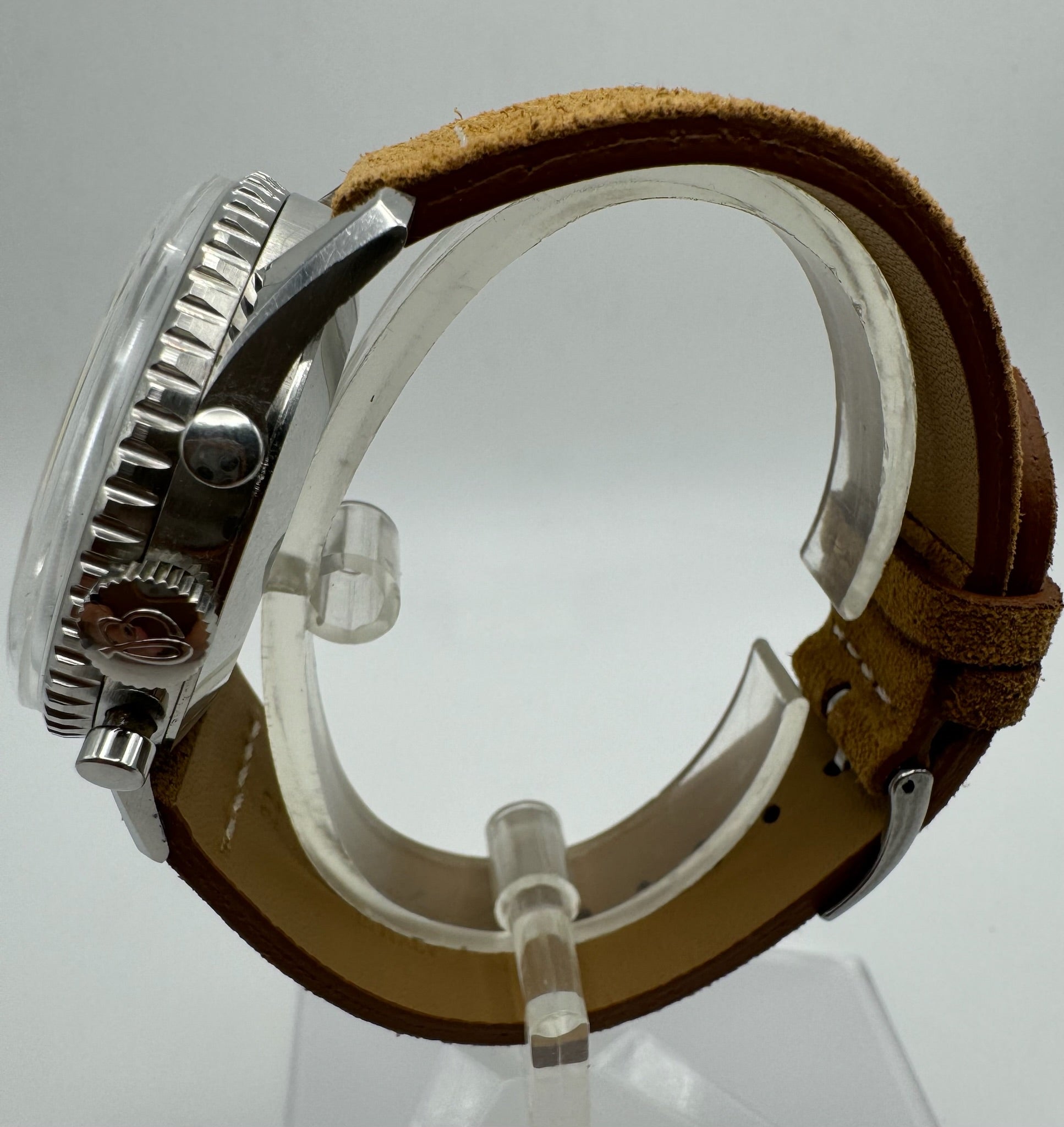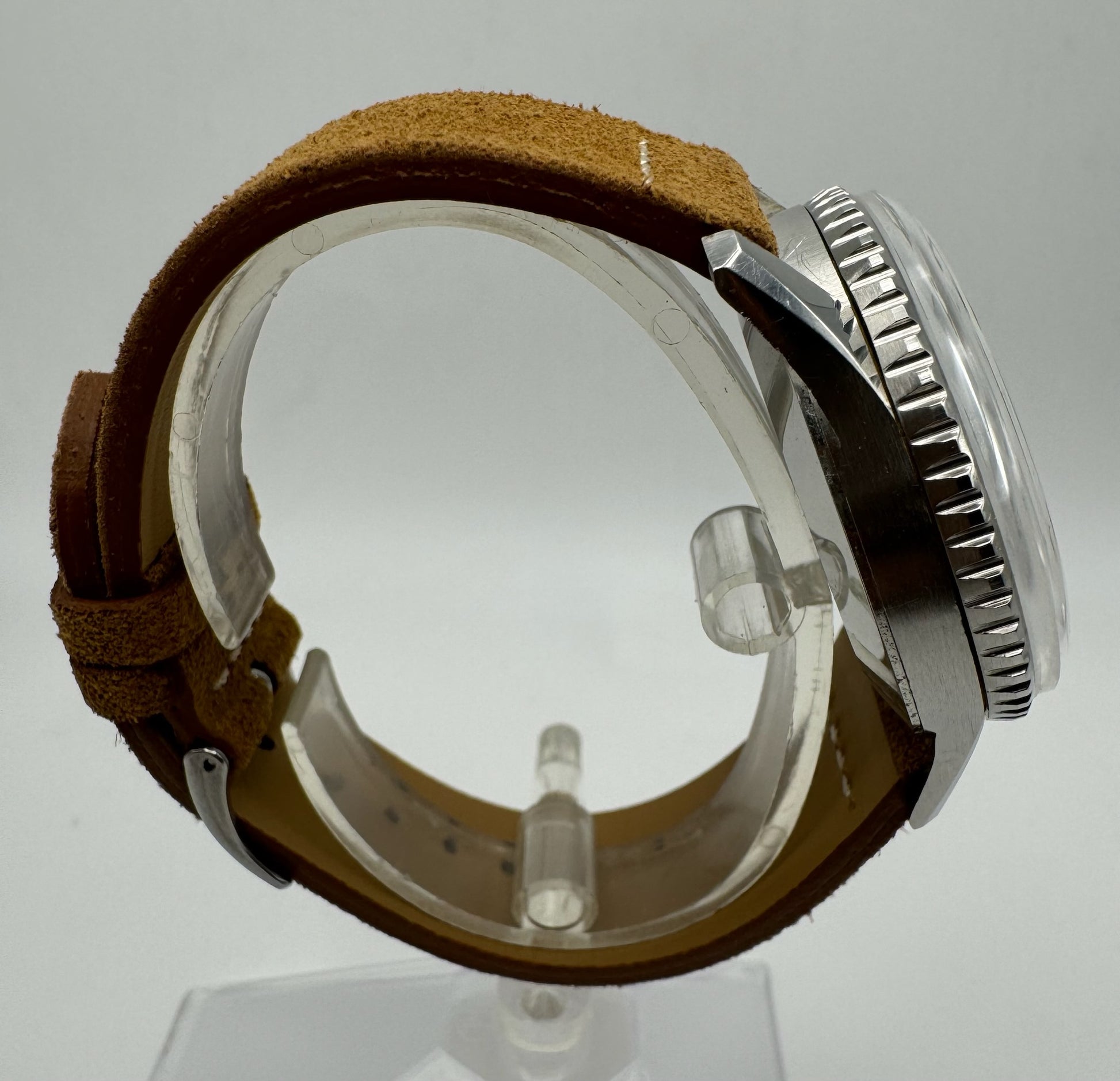 The watch is complemented by a new brown suede strap measuring 22/18mm, enhancing its vintage appeal.