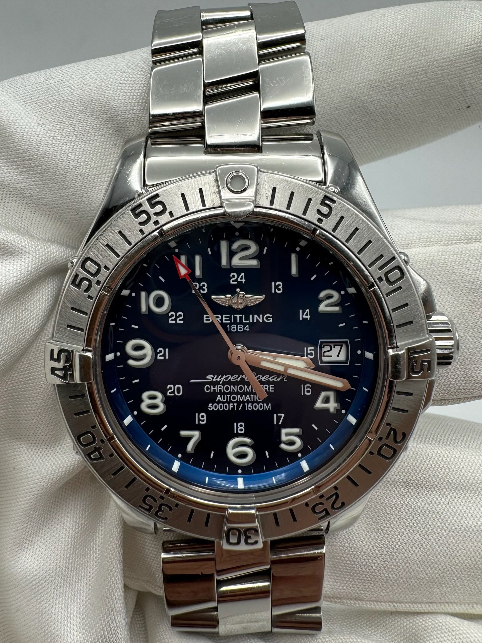 Experience the timeless elegance of the Breitling Superocean, preserved in its original, unpolished state, showcasing the brand's enduring craftsmanship. This automatic timepiece features a striking full steel construction, accentuated by a captivating blue dial, epitomizing sophistication and style.