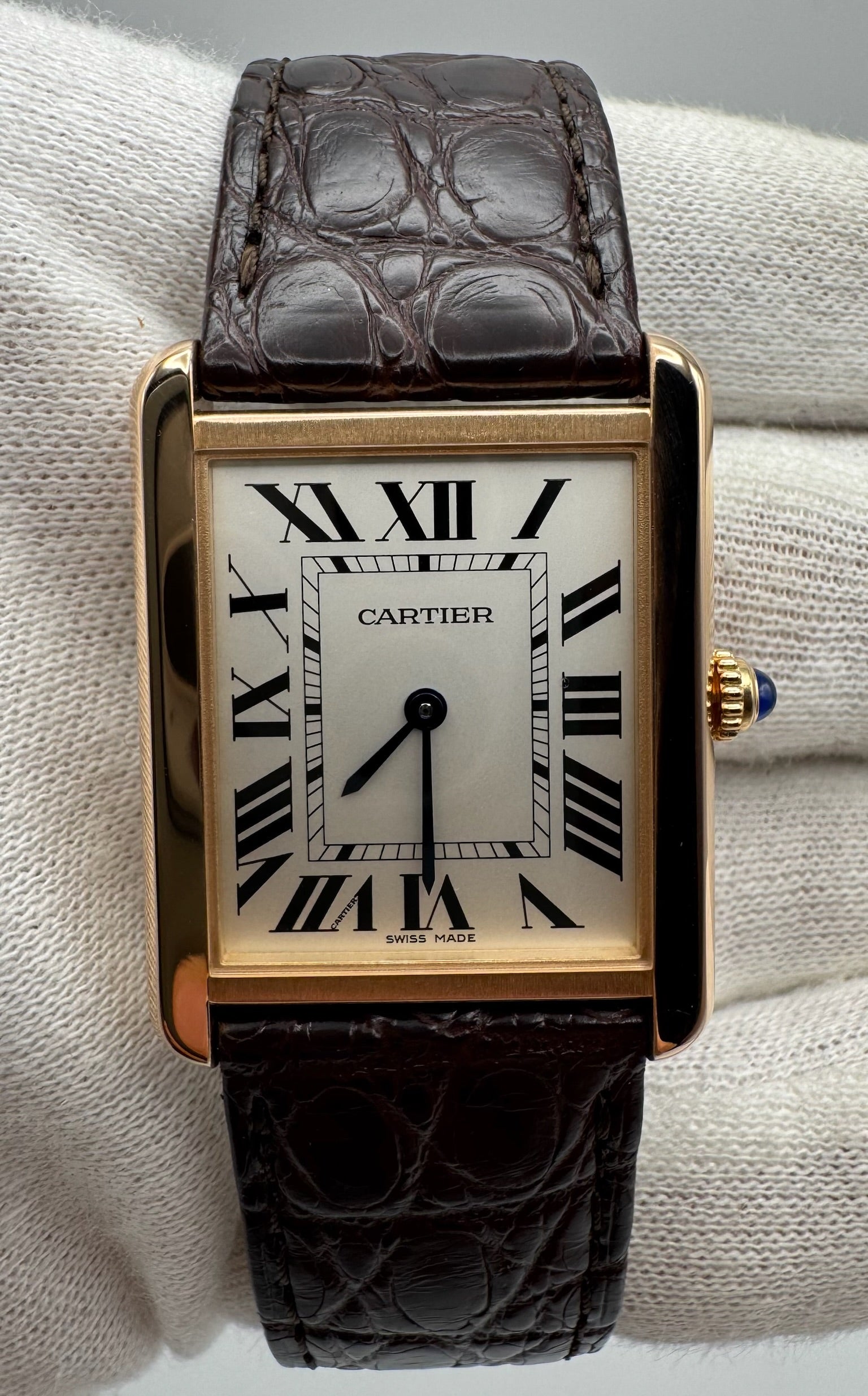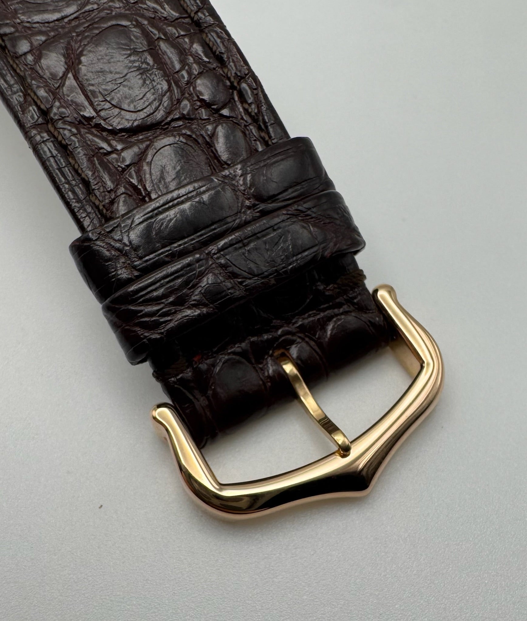 The watch is fitted with its original Cartier alligator strap, also in like-new condition, maintaining a cohesive and authentic presentation. The movement is running accurately and performing as intended, making it well suited for regular wear or collection.