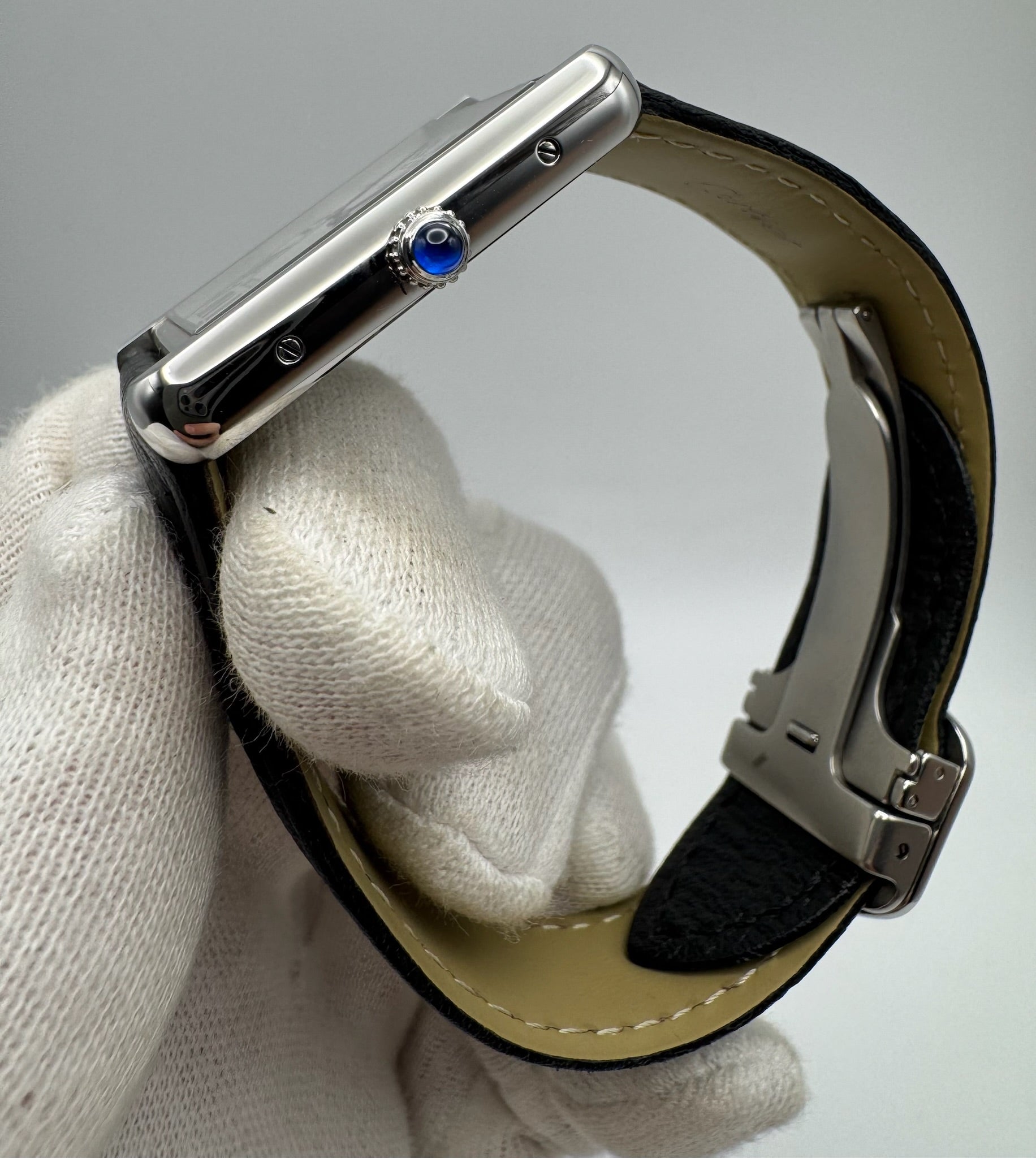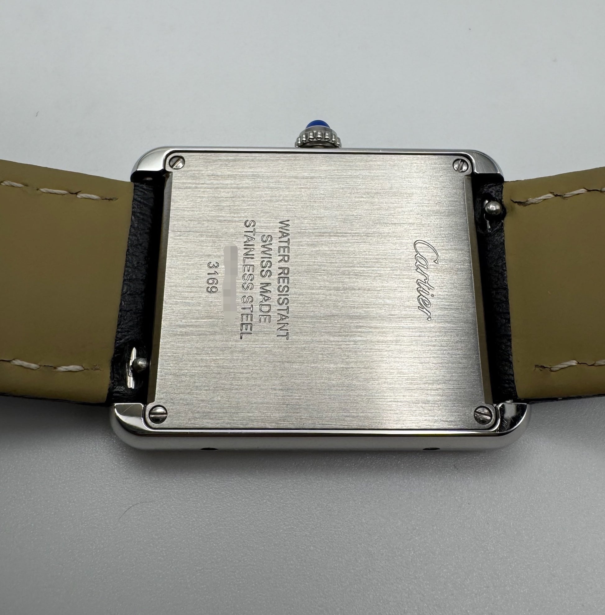 The case remains in pristine shape, showing no signs of wear and presenting with the sharp, clean lines expected from a well-preserved Tank. The strap is new and unworn, contributing to the watch’s fresh overall appearance.