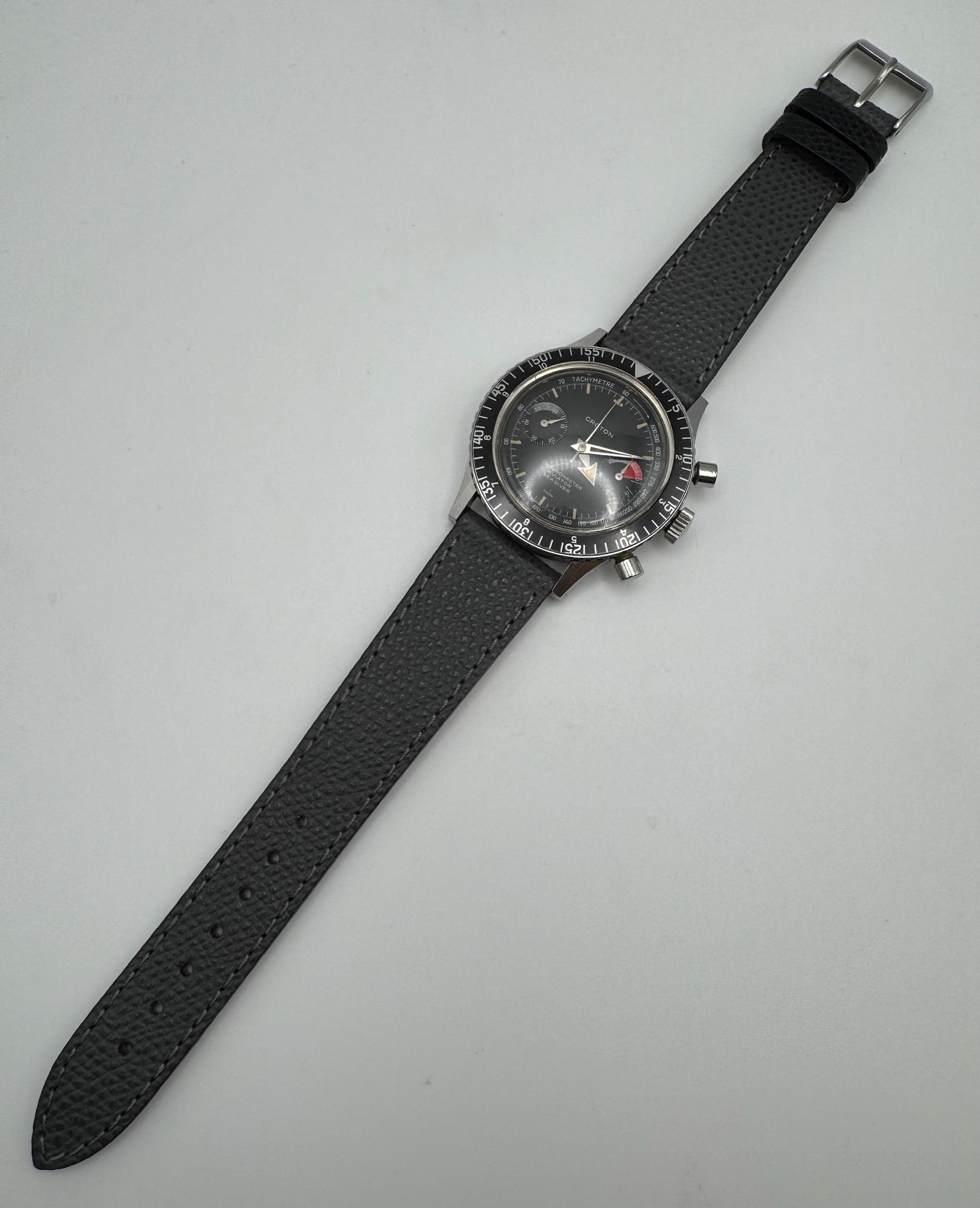 Although the service history is unknown, the watch was purchased directly from its original owner, underscoring its authenticity and preserved originality. It is presented on a hand-made 20/16mm grey leather strap, perfectly suited to its vintage character.