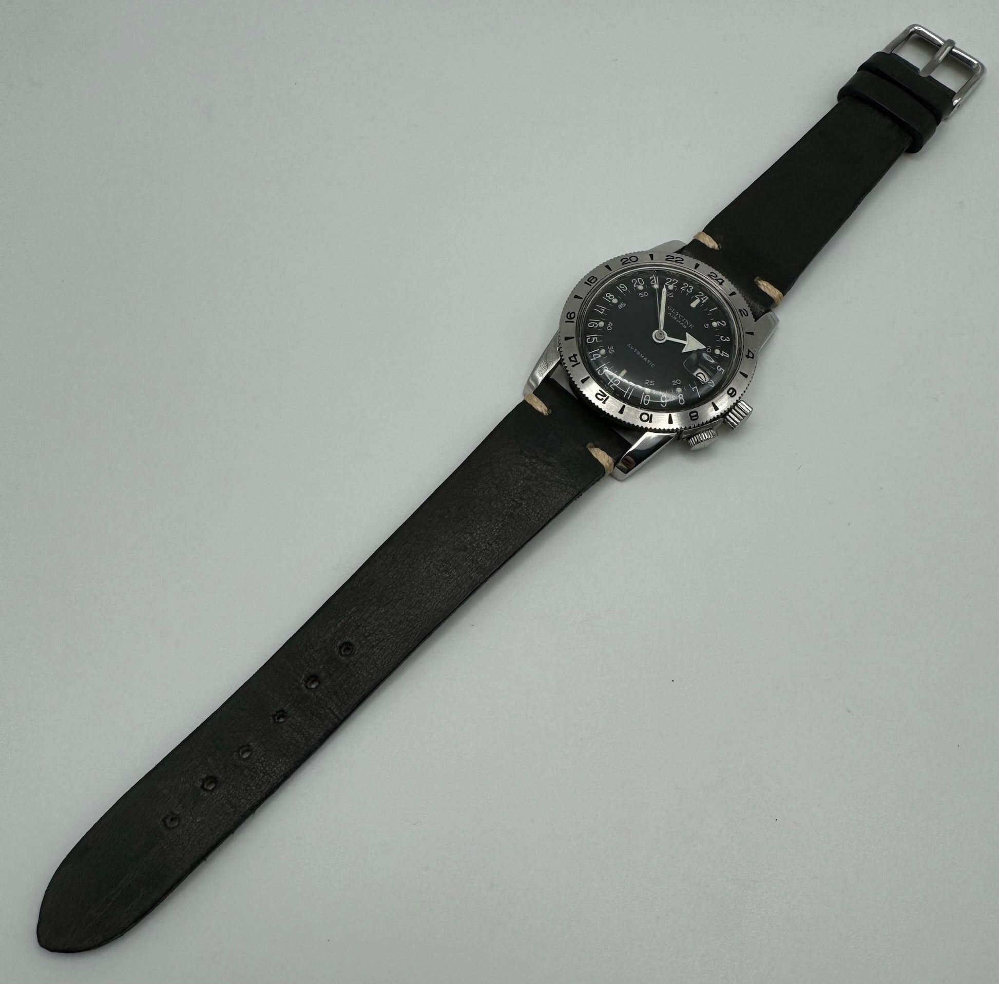 Introducing the vintage 1960’s Glycine Airman Reference 314050, a highly collectible timepiece that epitomizes the golden age of aviation watches. This model, revered for its pioneering 24-hour display and dual-time functionality, is all original and in excellent condition, making it a rare find for discerning collectors.