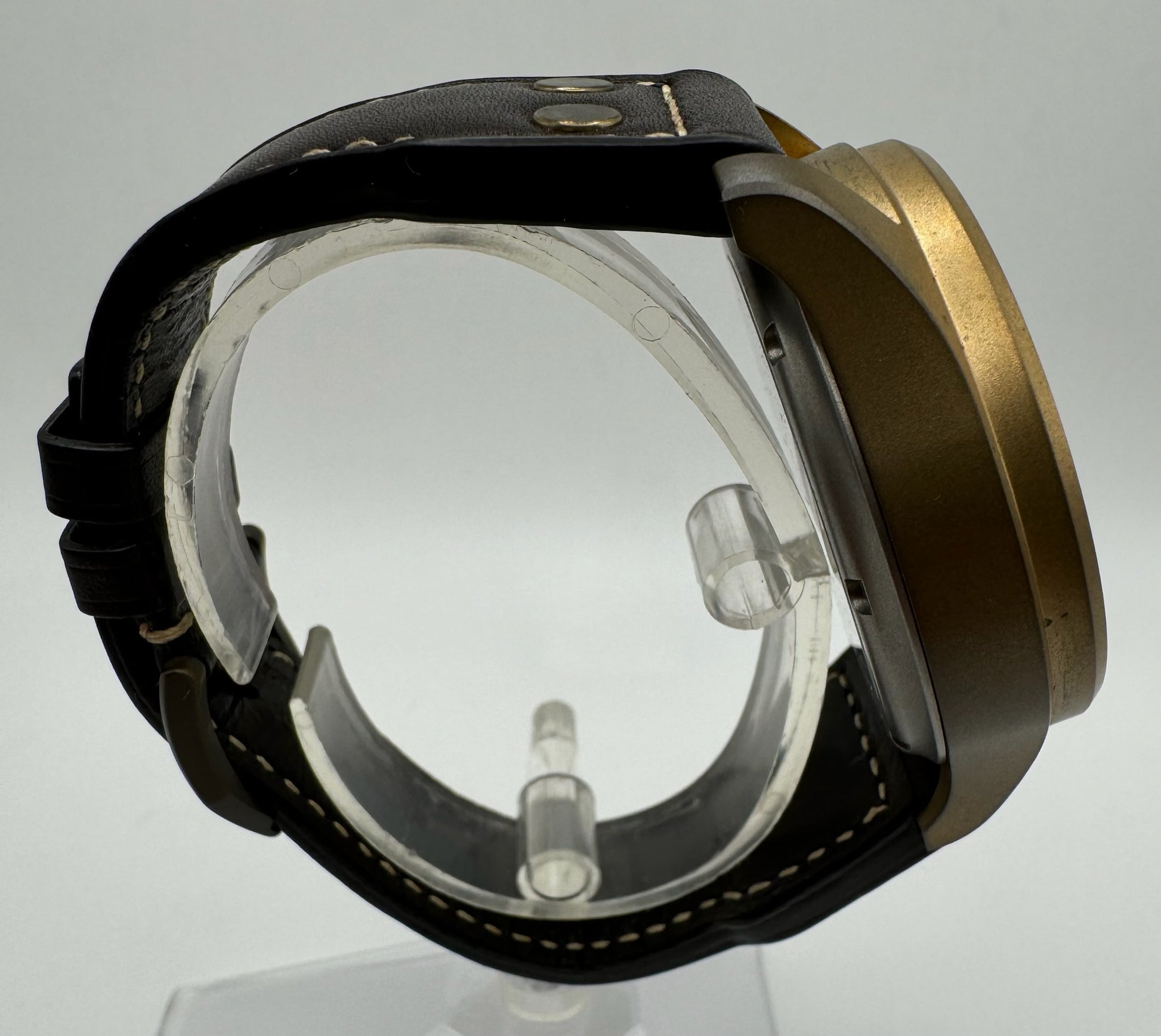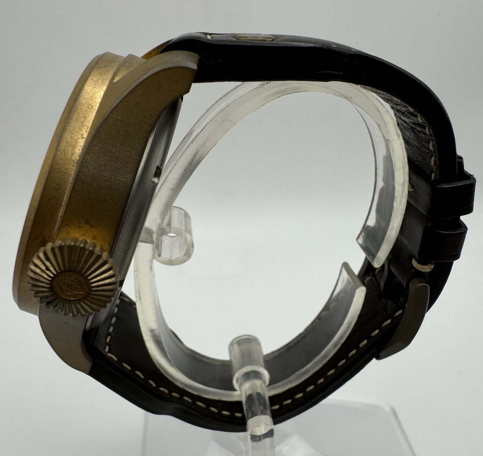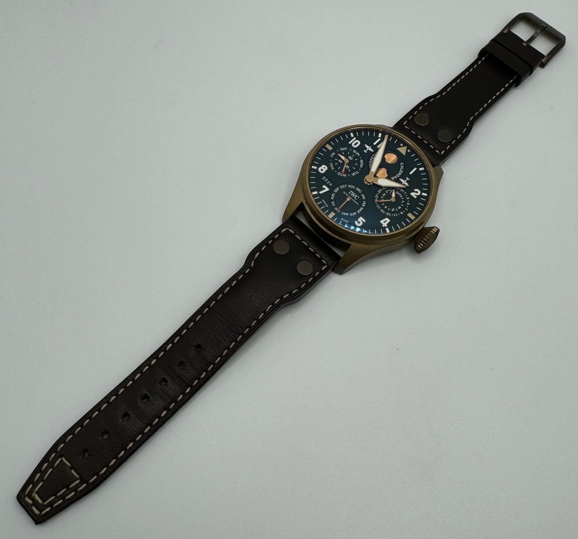 Behold the IWC Big Pilot Perpetual Calendar IW503601, a truly exceptional timepiece in excellent to like-new condition. This all-original watch features a stunning bronze case that has developed a natural patina, giving it a distinctive and vintage aesthetic. The case remains flawless, free of any signs of wear or scratches, reflecting the careful and light use by its owner.