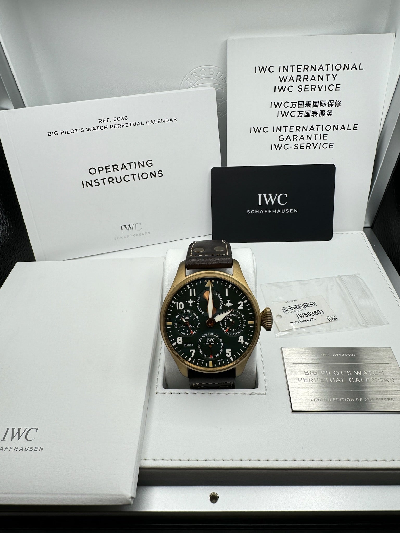 The IWC Big Pilot Perpetual Calendar IW503601 comes with everything from the boutique, including the outer box and stickers, ensuring its authenticity and value. Additionally, the warranty is valid for 8 years, extending up until 2027, providing peace of mind and confidence in its lasting performance.