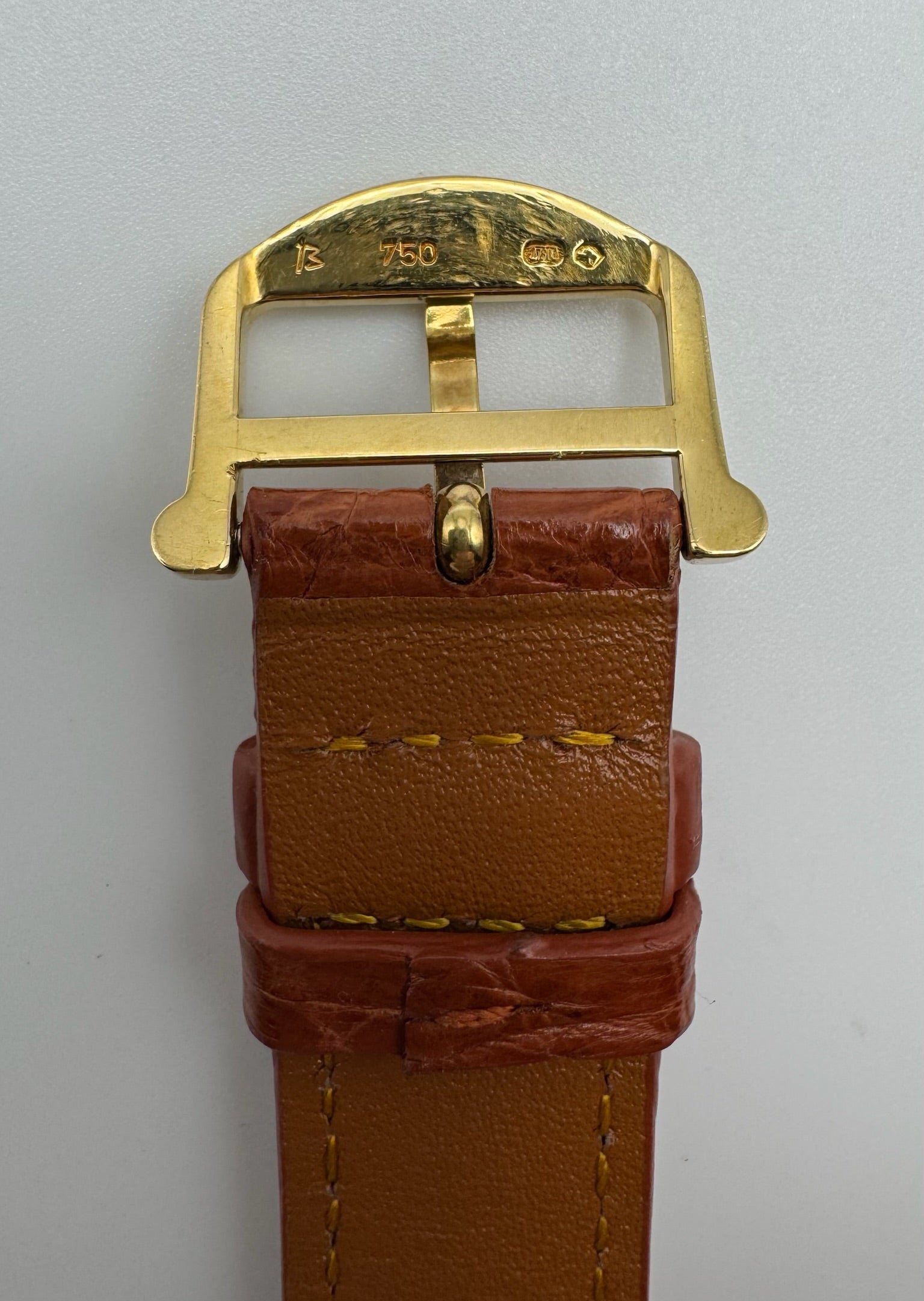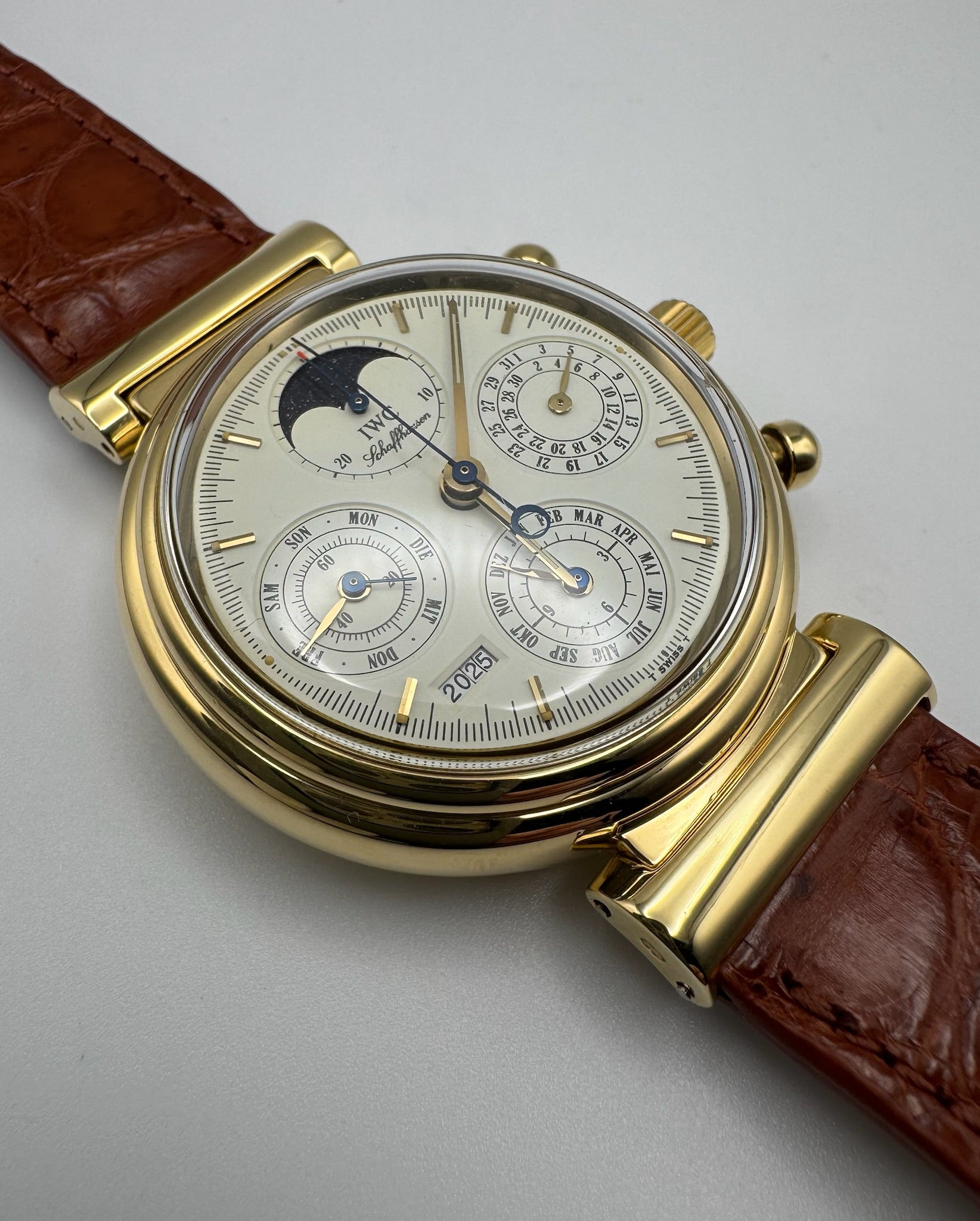 The movement was fully serviced early August 2025, all date functions synced, and running perfectly. The watch comes fitted with a newly crafted brown alligator strap and retains its original IWC yellow gold pin buckle.