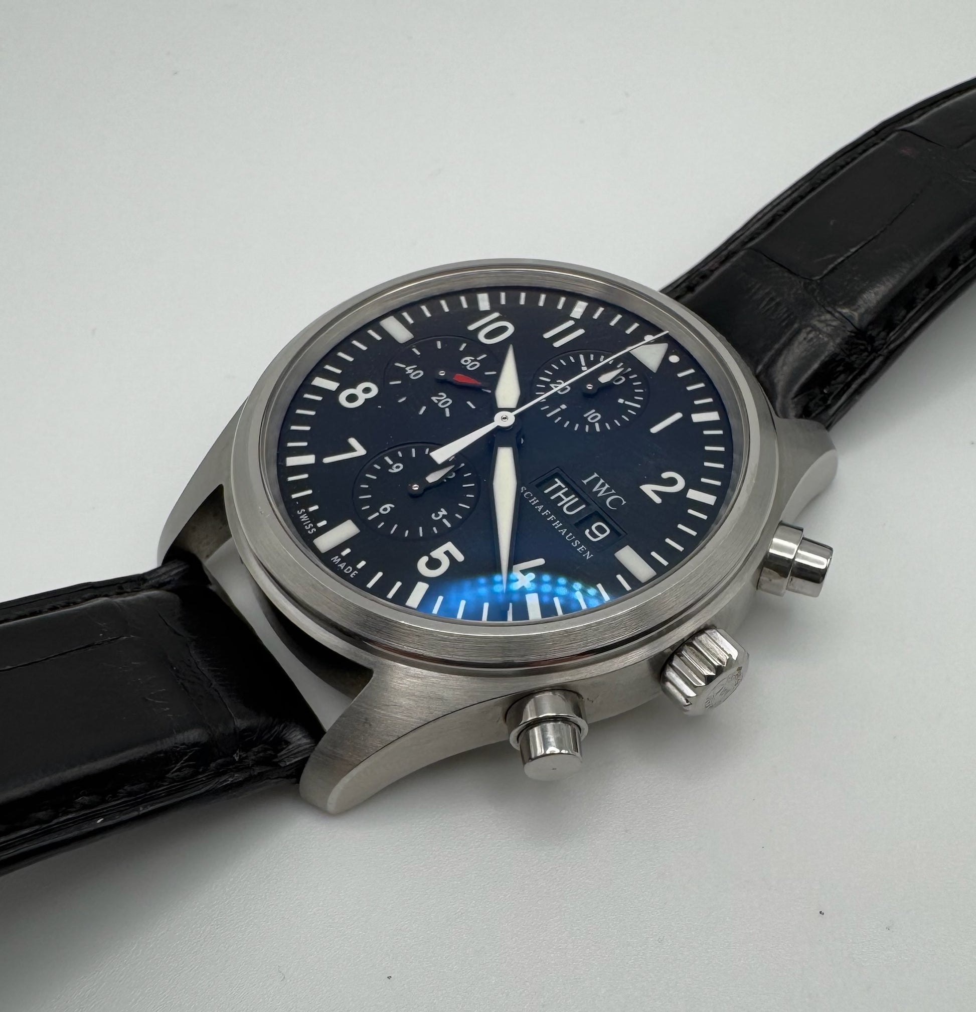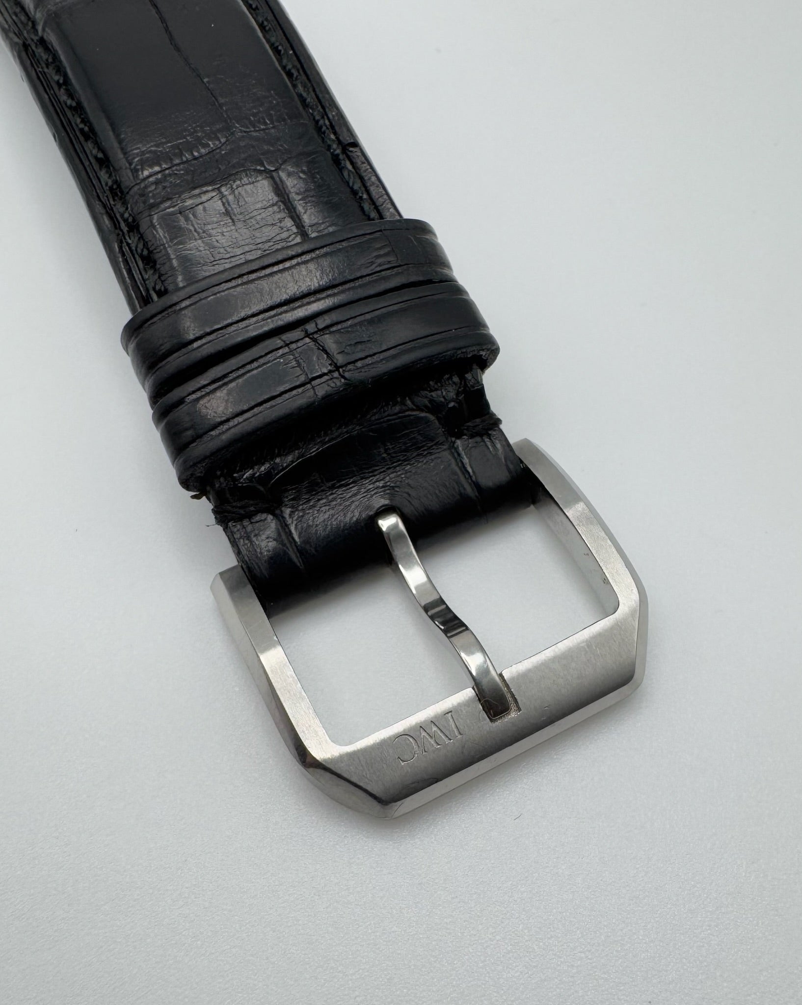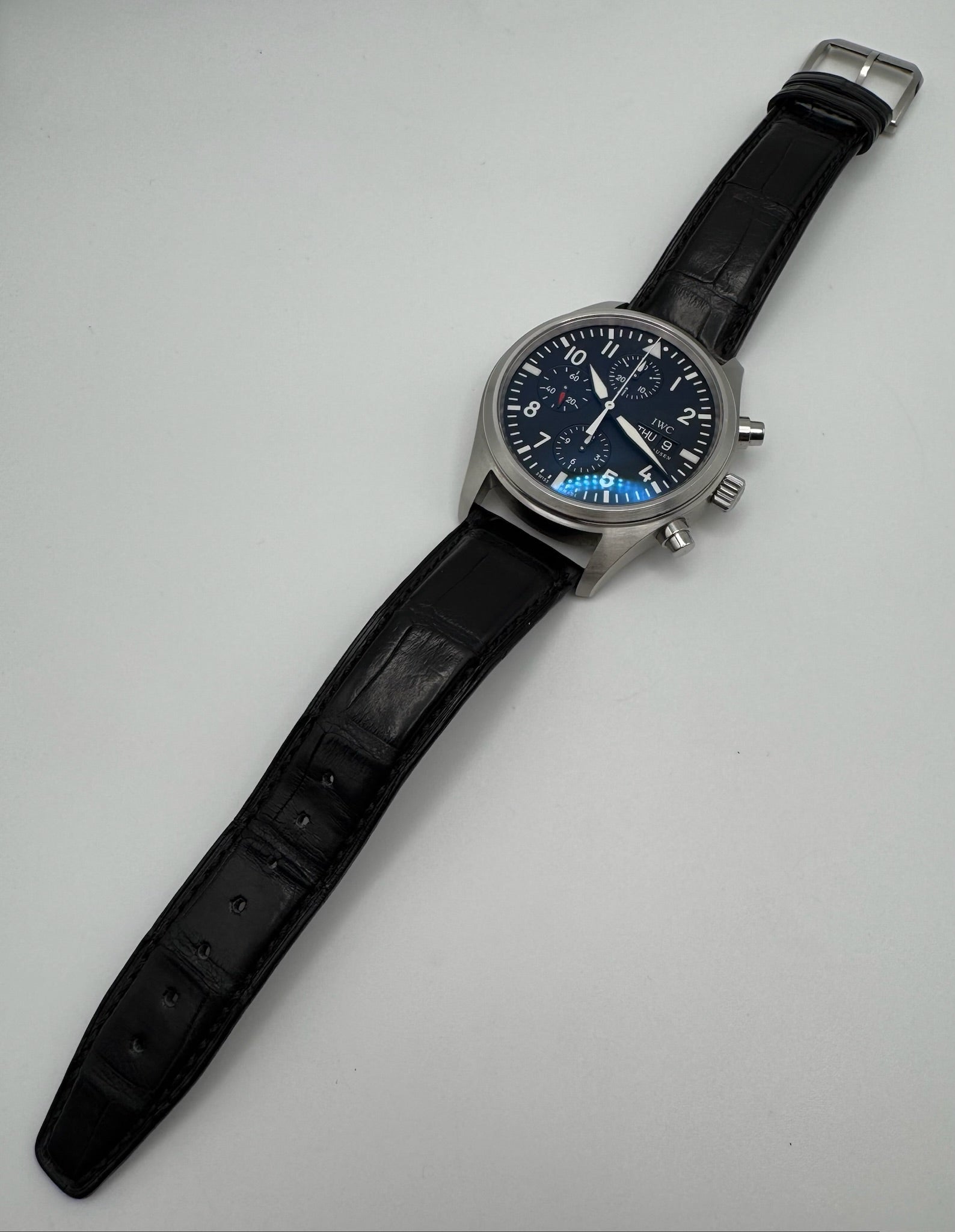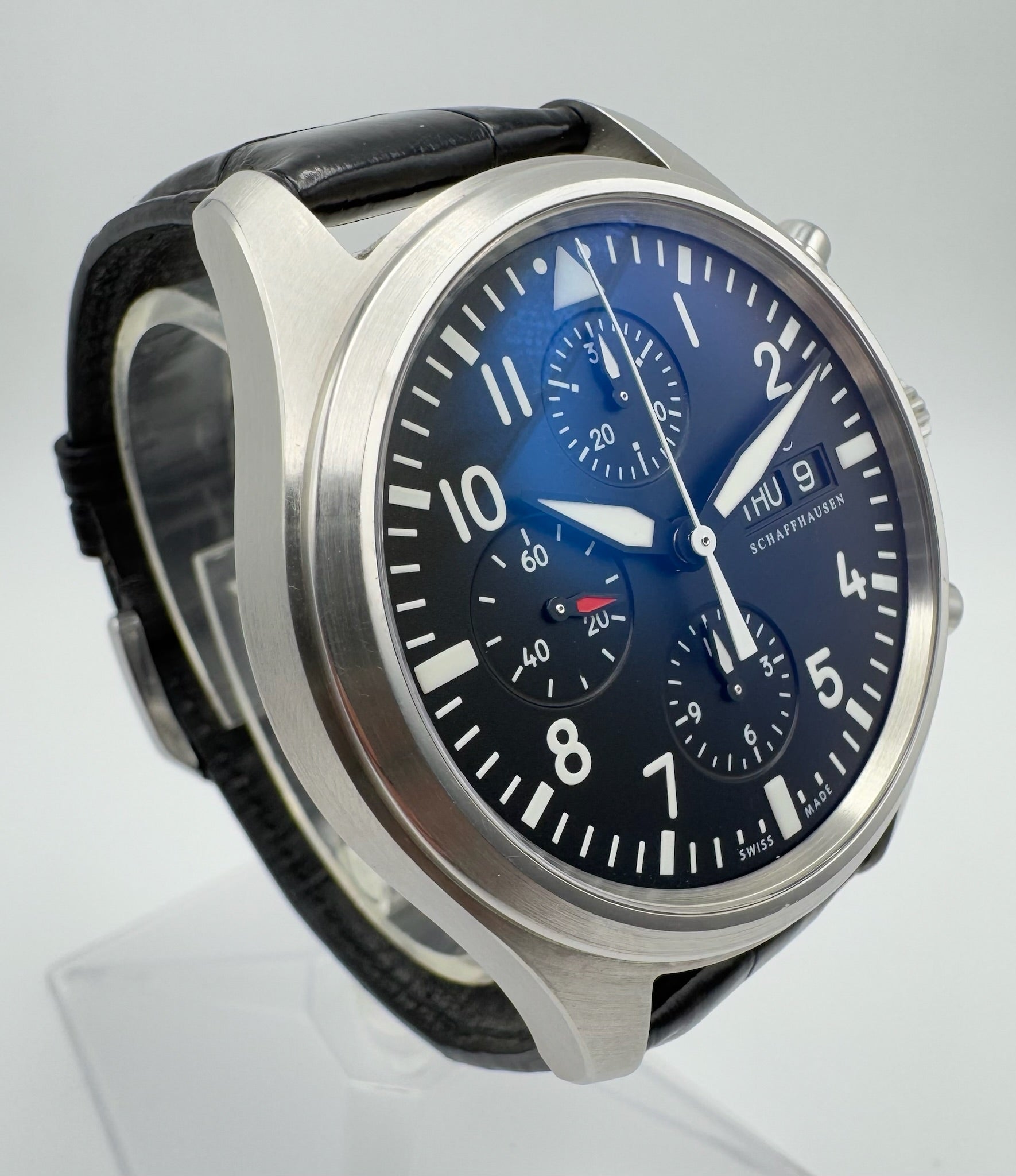The black dial is pristine, offering excellent readability and a bold aesthetic that reflects IWC’s iconic pilot watch heritage. Paired with the original black alligator strap, this watch provides both comfort and a refined look. The strap is in very good condition and does not require replacement, complemented by the original IWC pin buckle for authenticity and style.