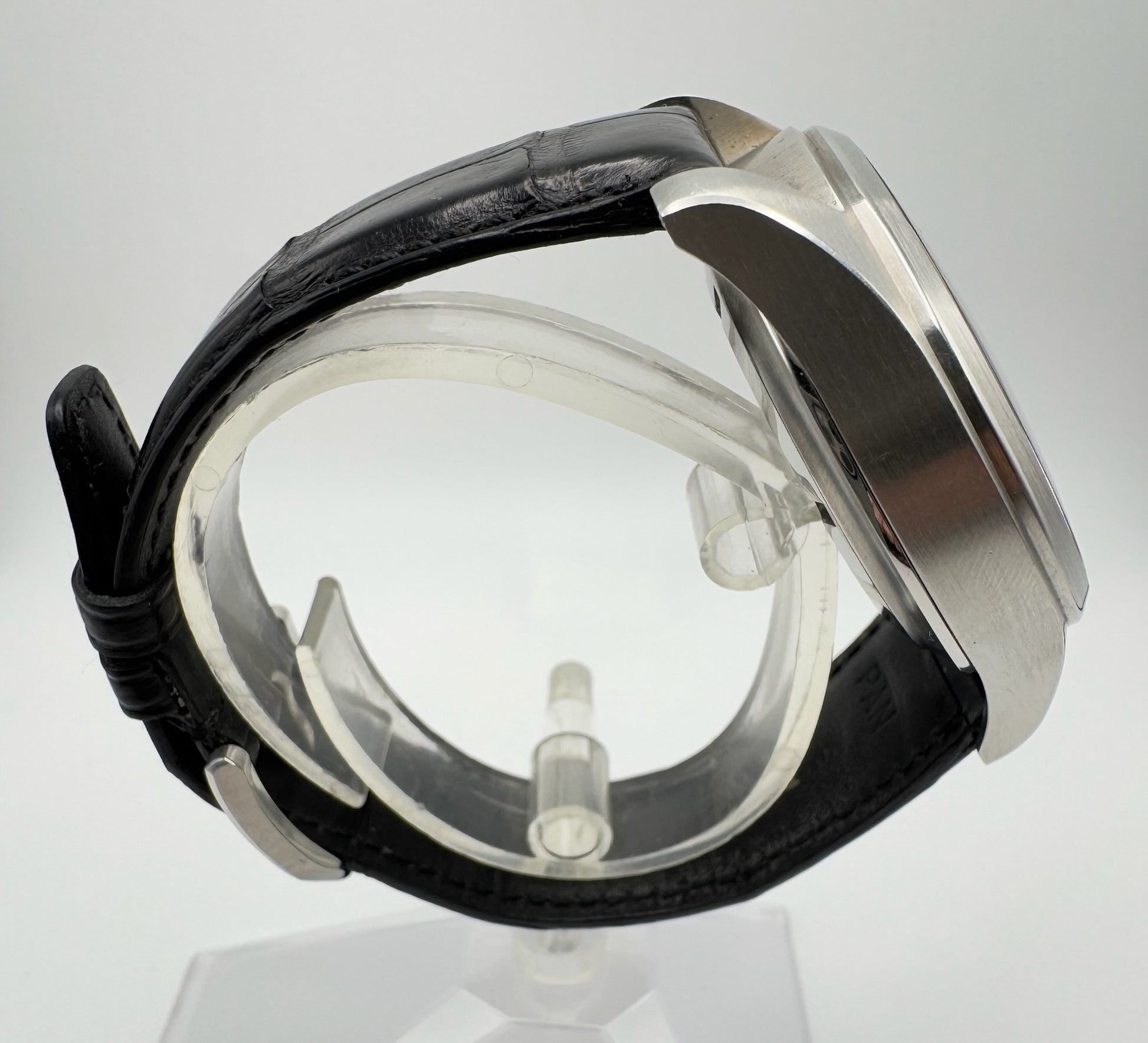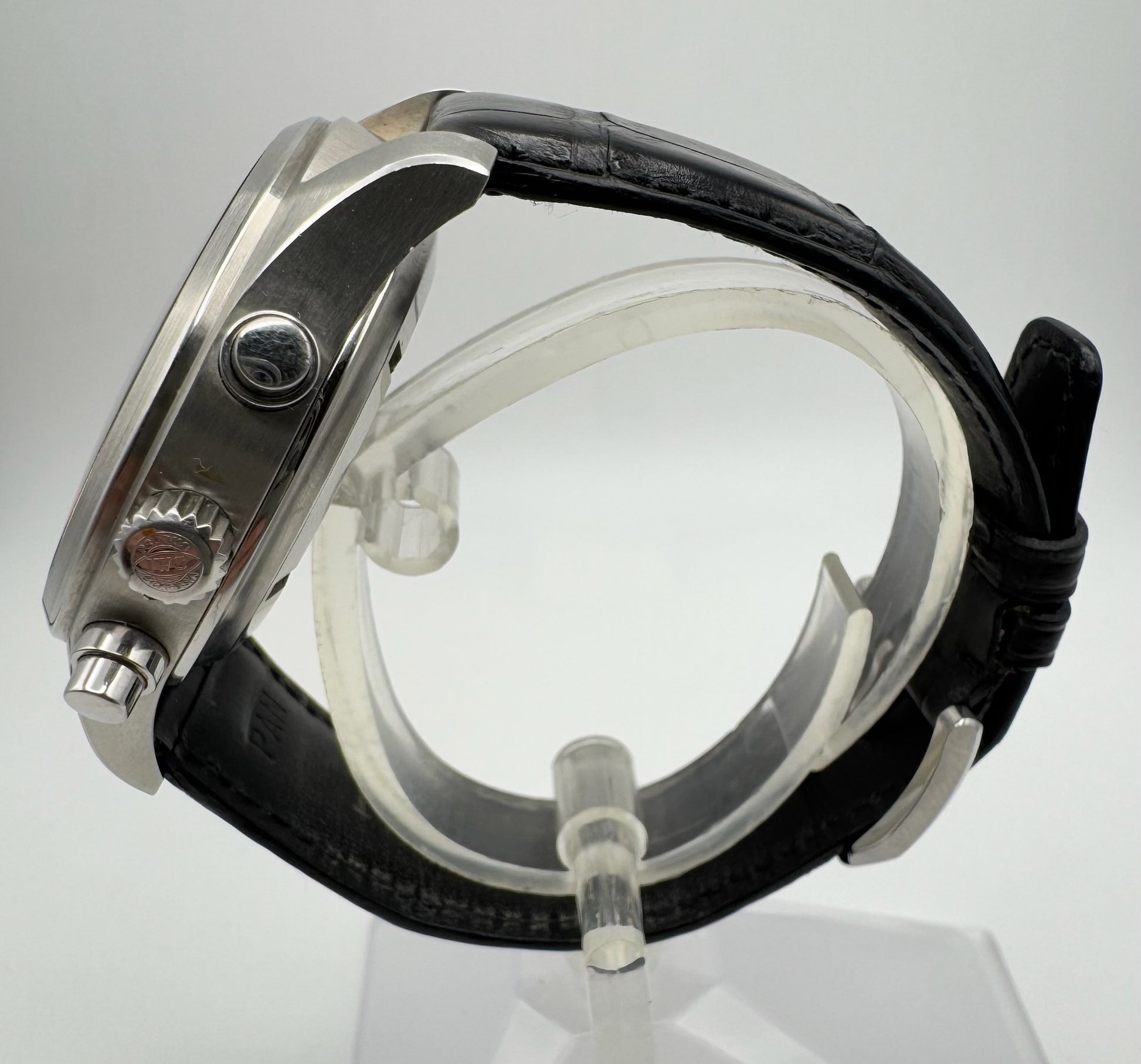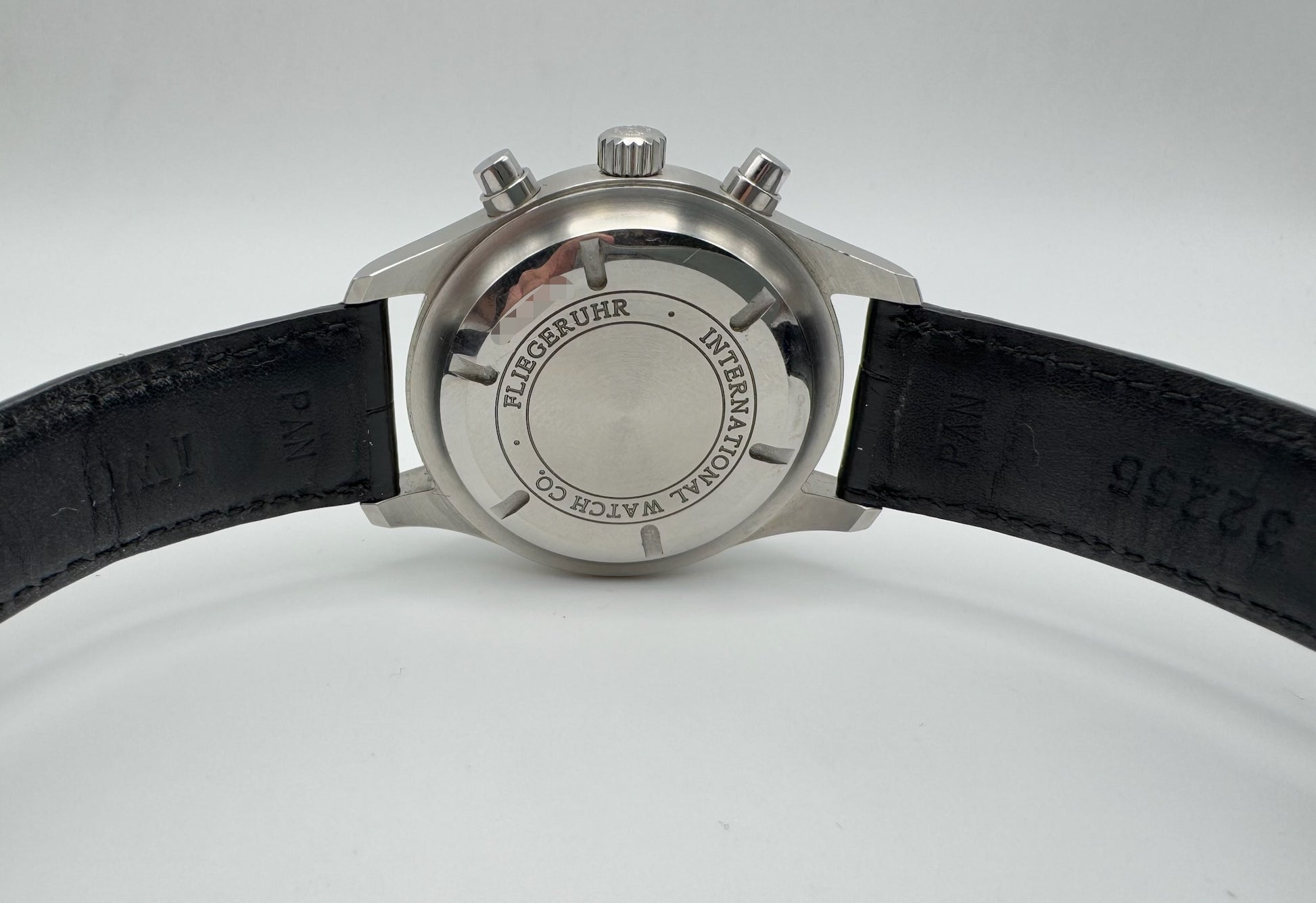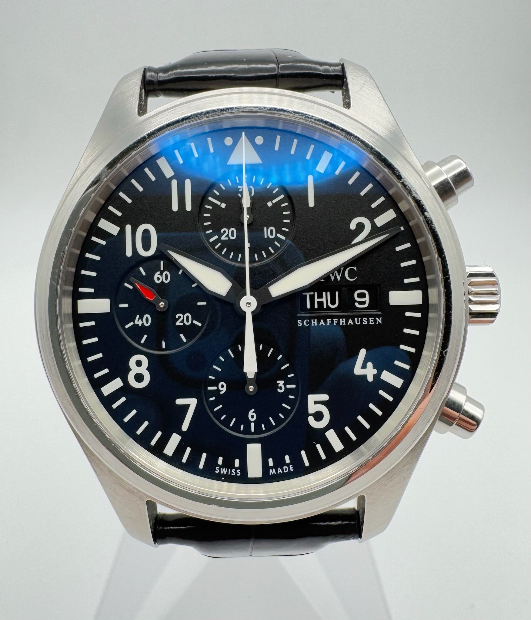 The black dial is pristine, offering excellent readability and a bold aesthetic that reflects IWC’s iconic pilot watch heritage. Paired with the original black alligator strap, this watch provides both comfort and a refined look. The strap is in very good condition and does not require replacement, complemented by the original IWC pin buckle for authenticity and style.