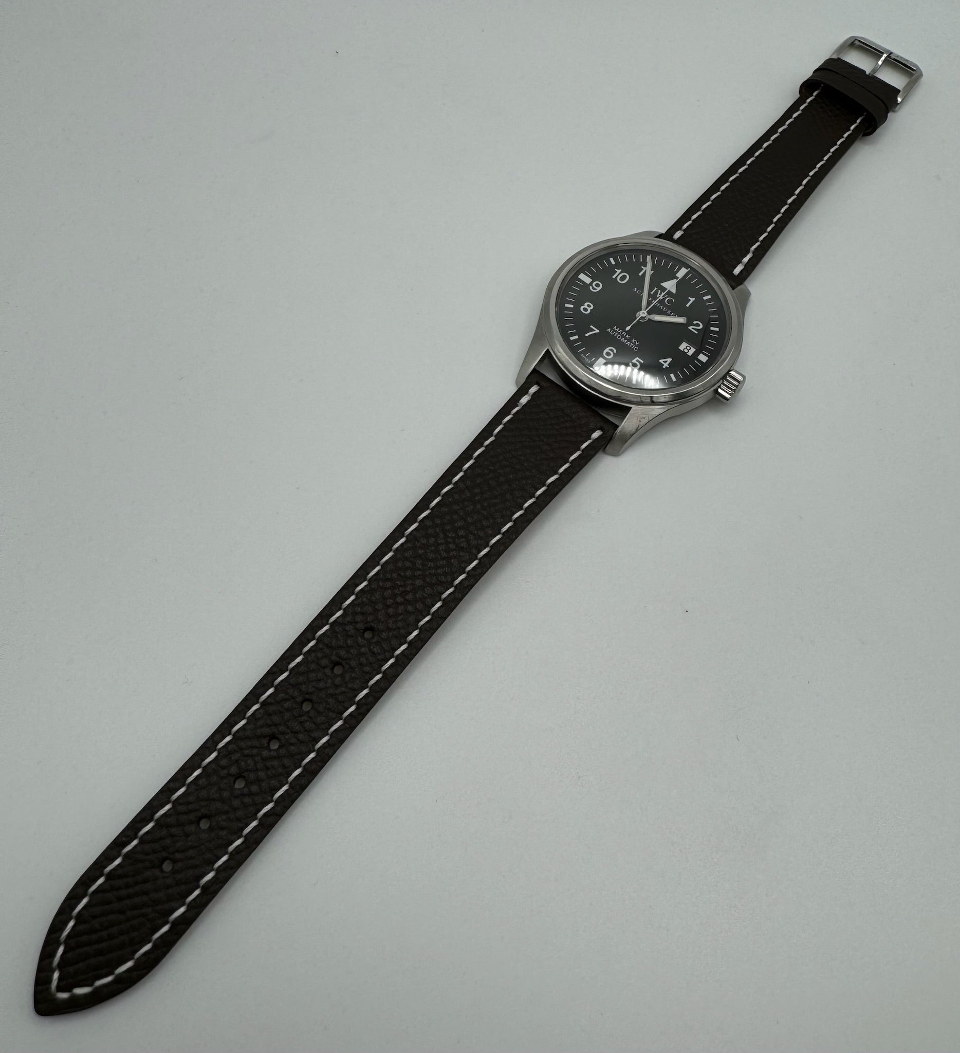 While the movement history is unknown, this IWC Pilot Mark XV has been tested and keeps accurate time, still featuring the original fish crown, a detail cherished by collectors. The watch comes fitted with a new aftermarket brown buffalo strap with white stitching, paired with the original IWC pin buckle, adding a touch of modernity to its vintage charm.