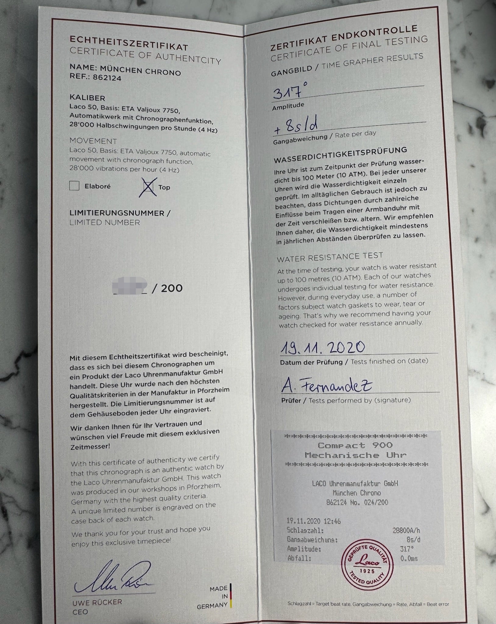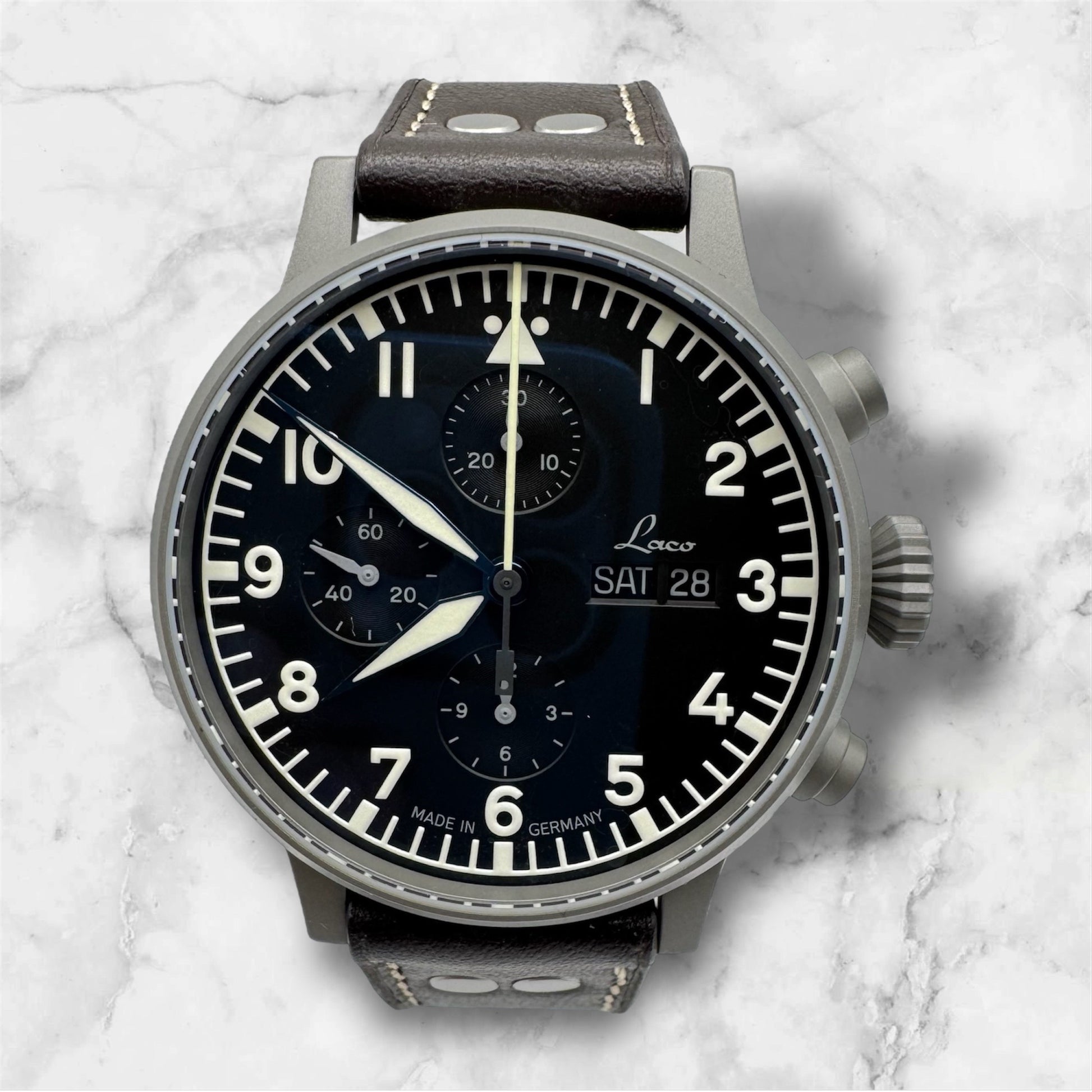 Offered as a full set, it comes complete with its original boxes, certificate, papers, and an additional strap. A rare opportunity to own a modern Laco pilot chronograph in untouched condition.