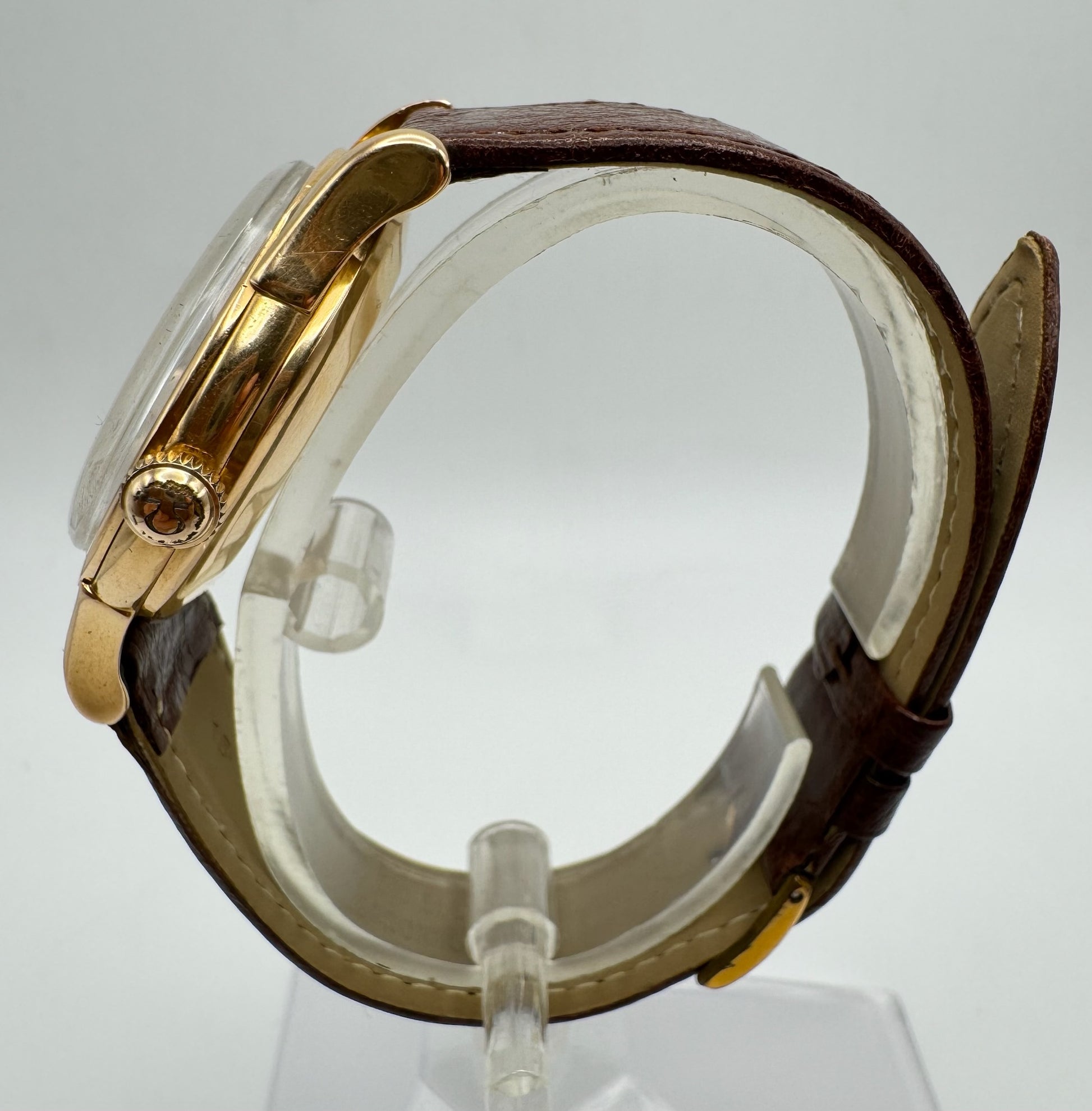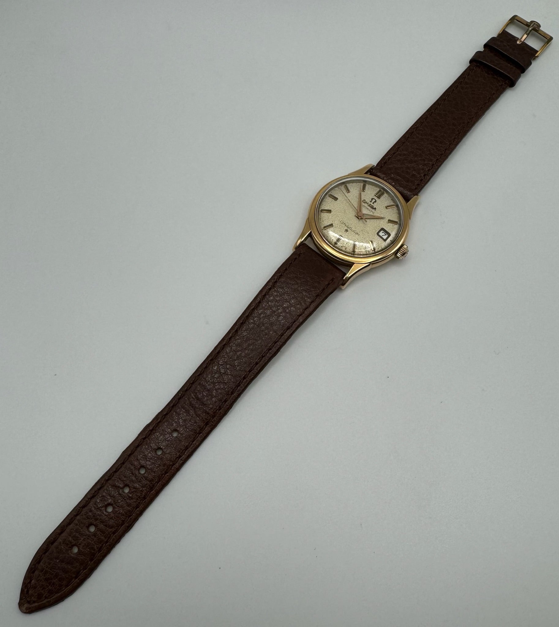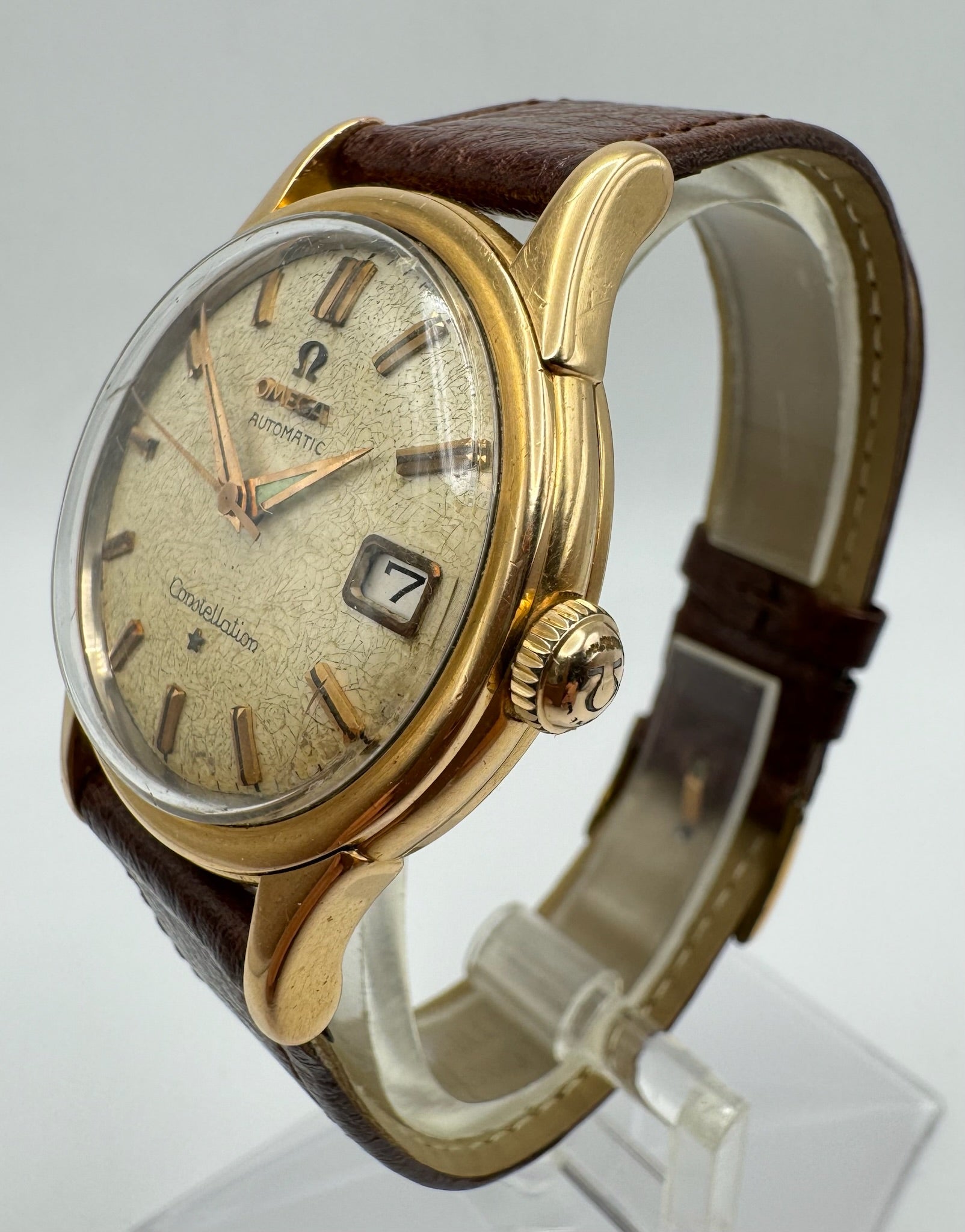 This vintage Omega Constellation 2943 in 18k solid rose gold is a true collector’s piece with a lot of character. The original dial has naturally aged with beautiful patina and subtle cracks that highlight its history and charm. The case back features the worn Constellation logo, showing signs of polishing over time.