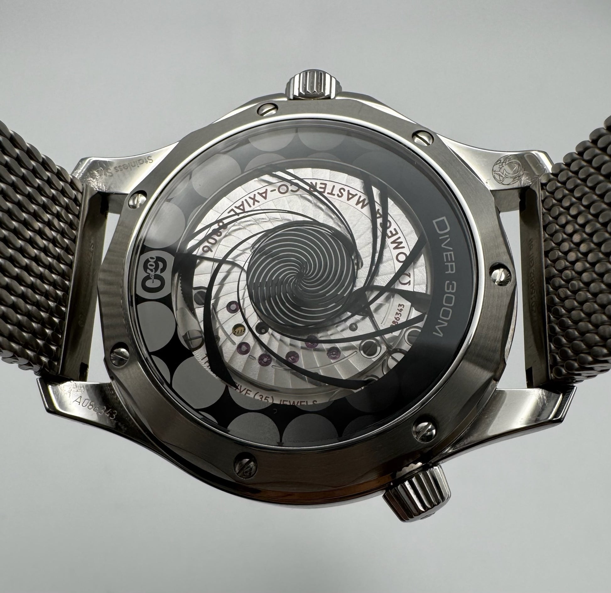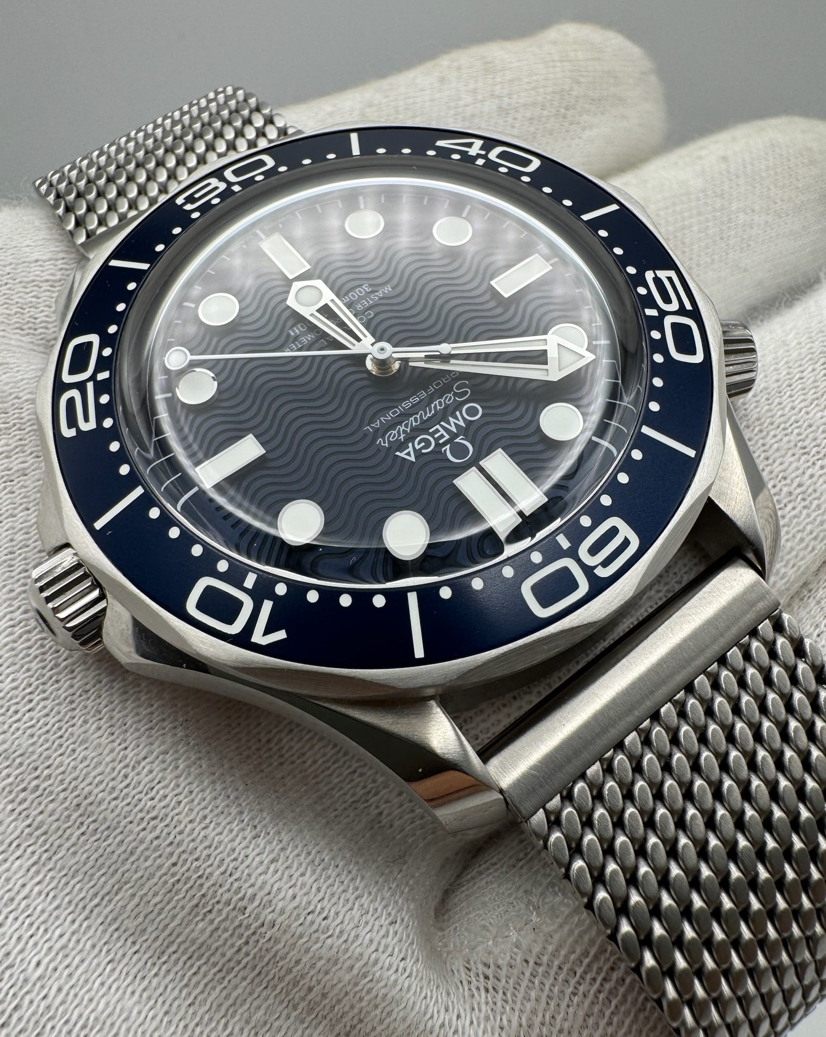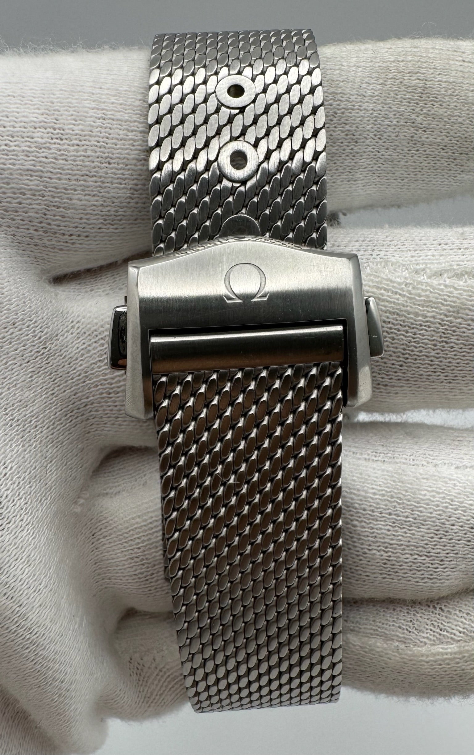 It comes fitted on the original steel mesh bracelet and includes the secondary leather strap with a deployment buckle, both in unworn condition. The watch is accompanied by its original box and papers, directly from the first owner. A standout modern diver’s watch directly tied to the iconic 007 legacy.