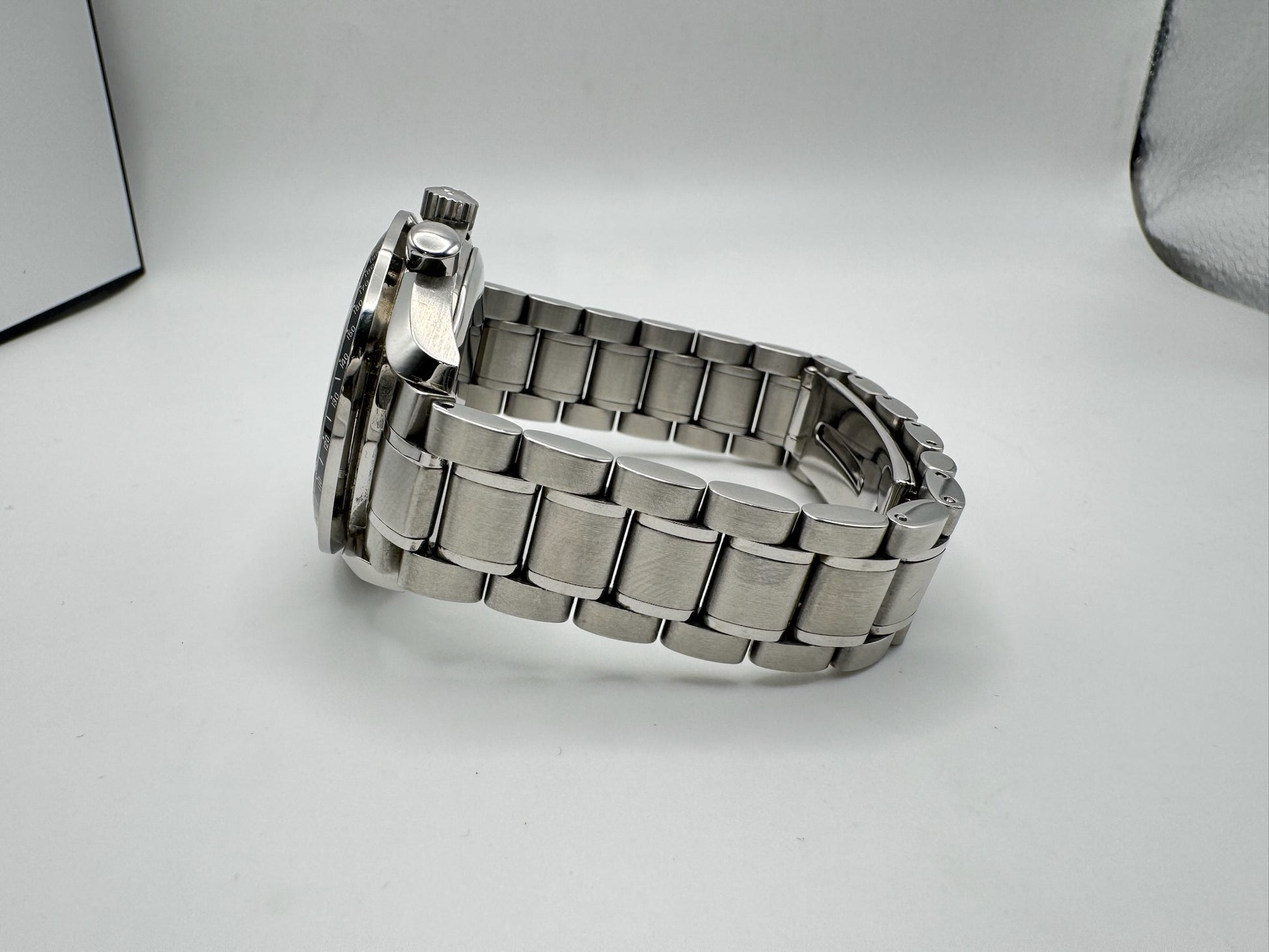 The case remains in outstanding condition, with sharp edges and minimal signs of wear. Its original bracelet is exceptionally well-preserved, showing no stretch and fitting wrists up to 7.3” (18.5-18.7 cm). The dial is flawless, maintaining its clarity and contrast, while the sapphire crystal has only minor scratches on the anti-reflective coating, visible under certain lighting conditions.