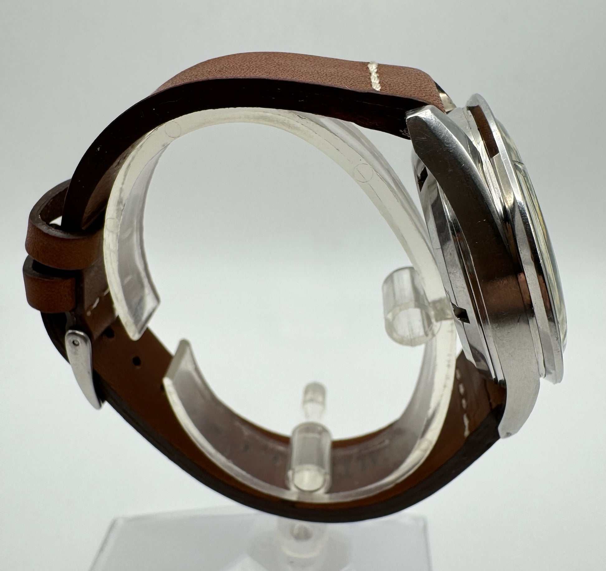While the movement history is unknown, it is clean, has been tested, and runs properly, with the chronograph functions working flawlessly. This watch comes on a new 19mm brown vintage-style strap with the original 16mm vintage pin buckle.