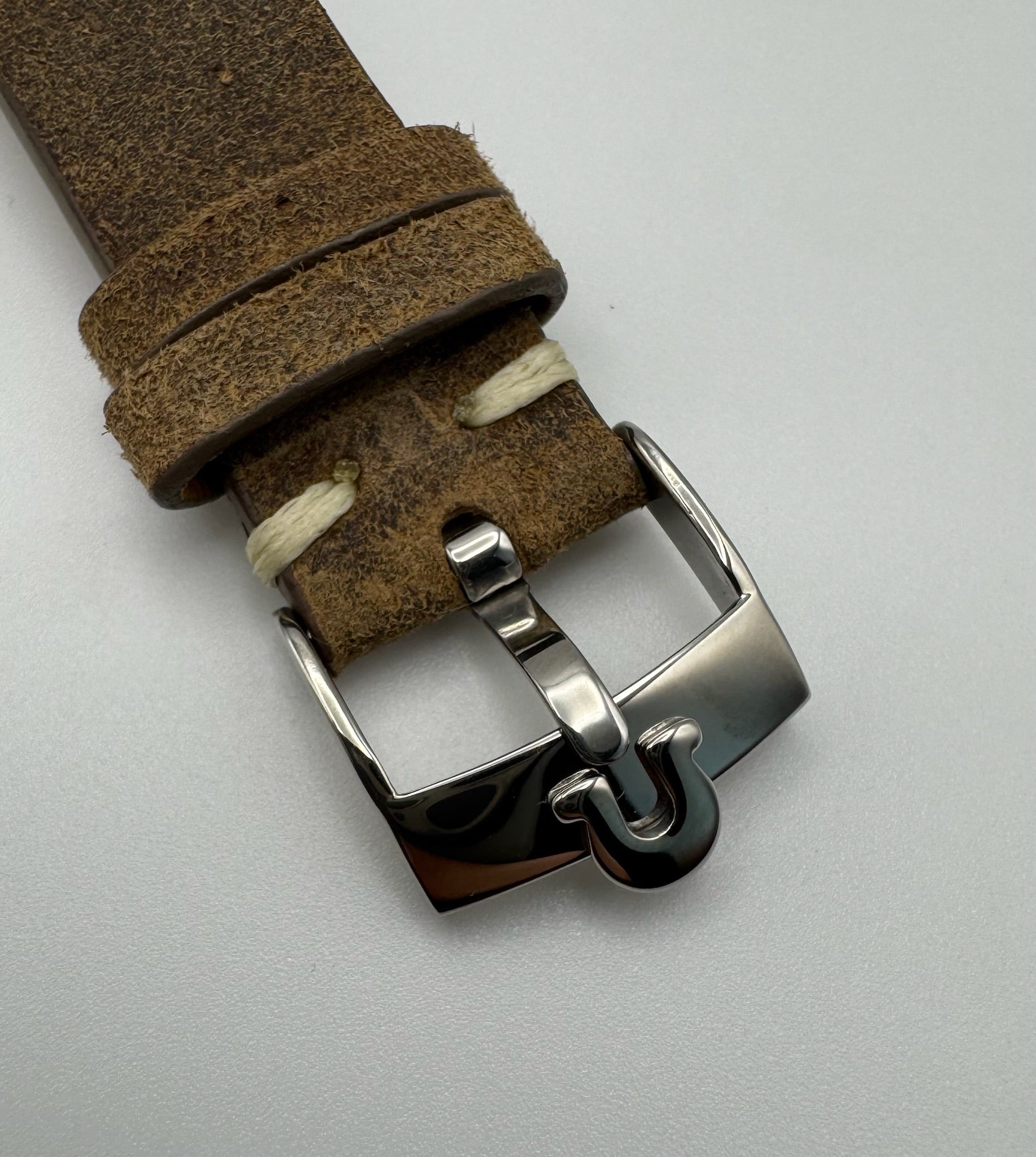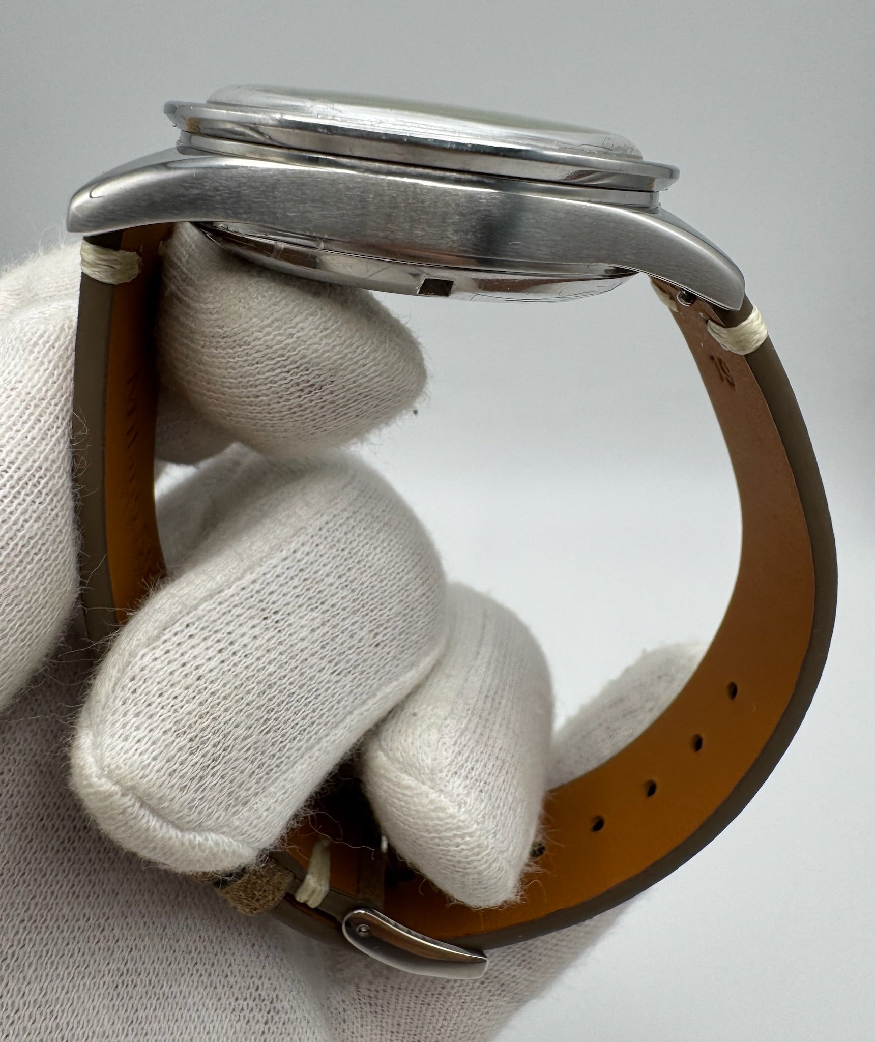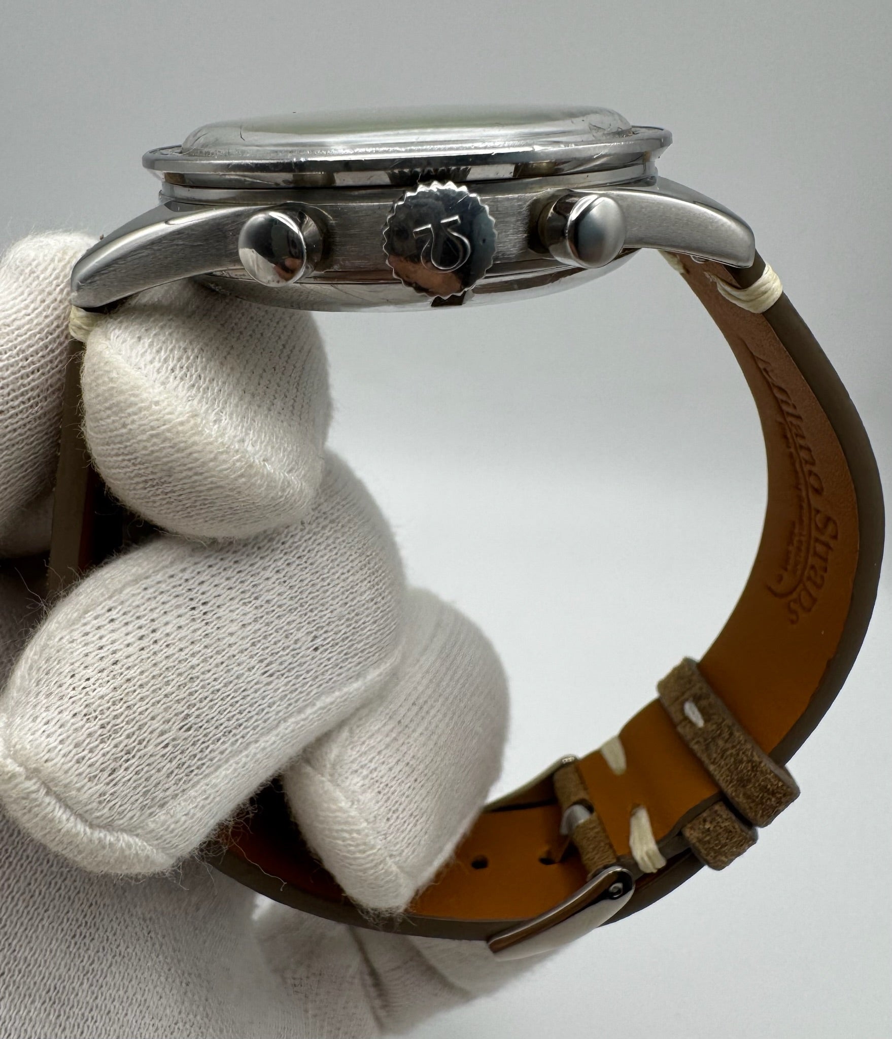 Fitted with a new handmade 19/16mm vintage Italian leather strap and a 16mm steel vintage Omega pin buckle, this piece combines historic significance with wearable charm.