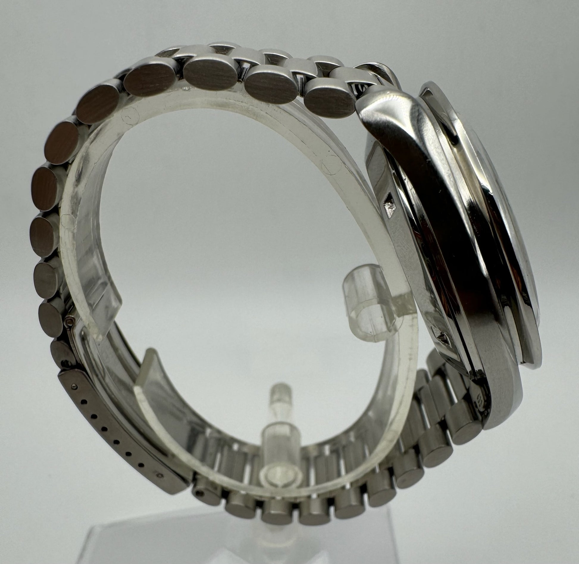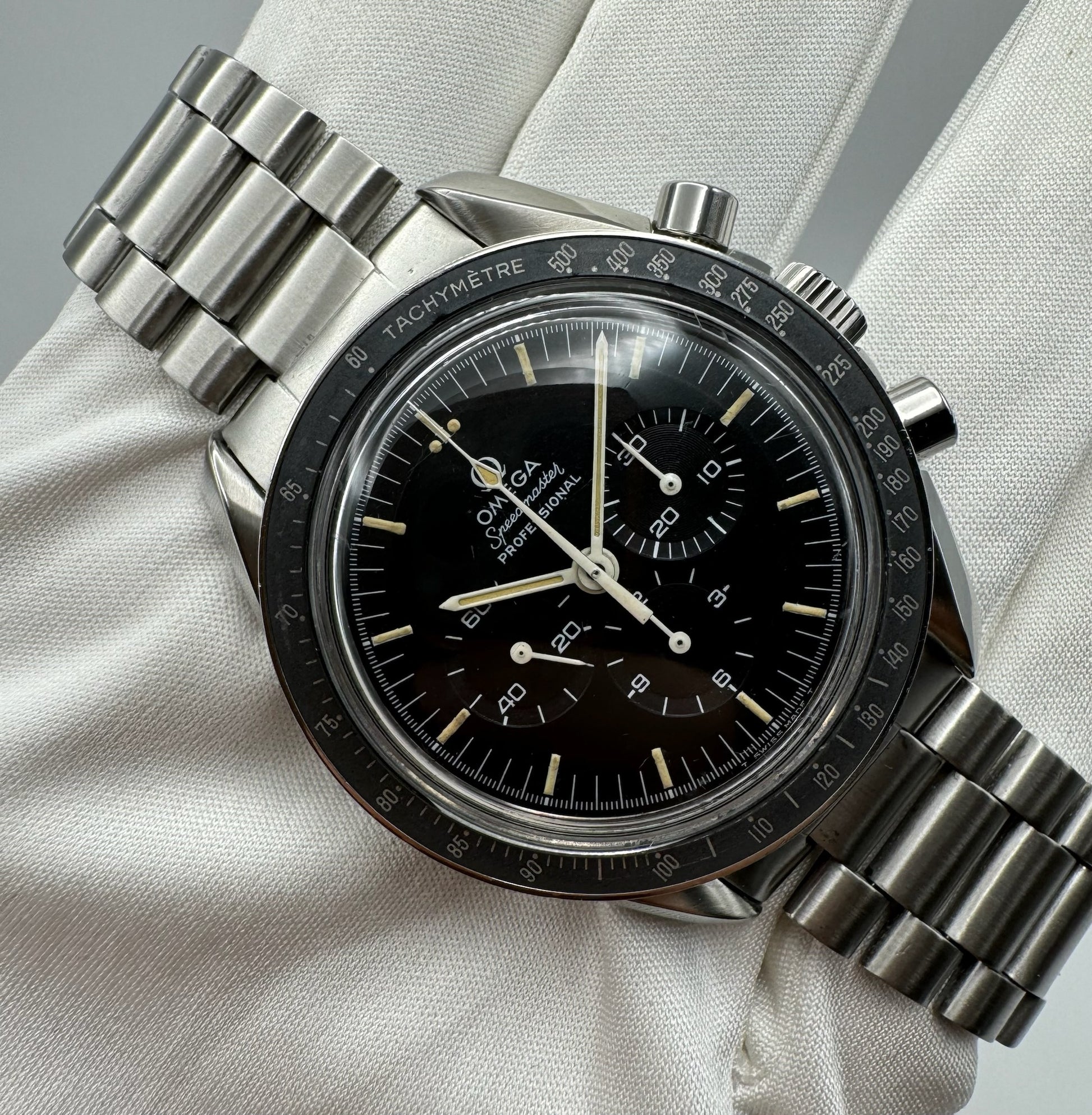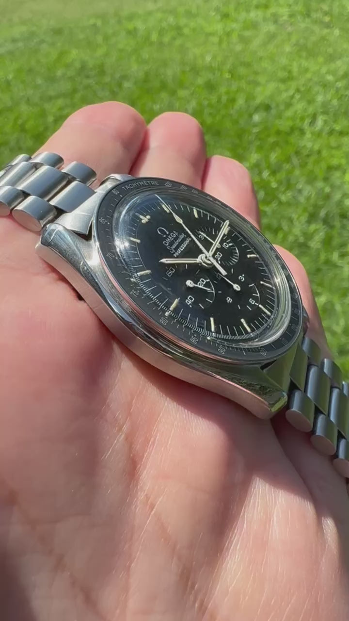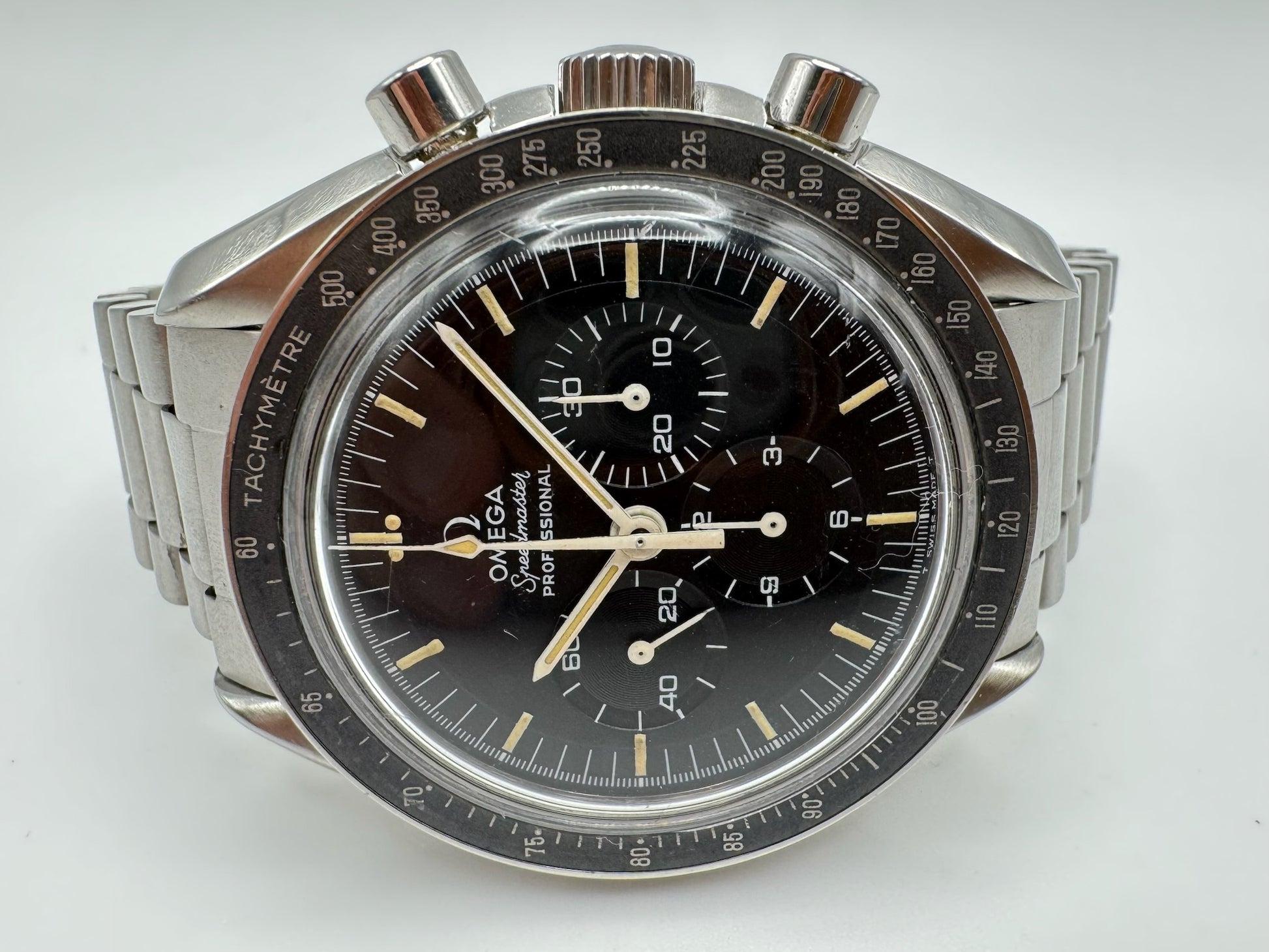 This Omega Speedmaster Moonwatch 145.022-71 is a standout vintage piece in beautiful condition. The original black tritium step dial has developed a gorgeous, even patina that complements the matching hands. The bezel insert has naturally faded to a striking grey/ghost color, enhancing the overall aesthetic and giving the watch undeniable vintage appeal.
