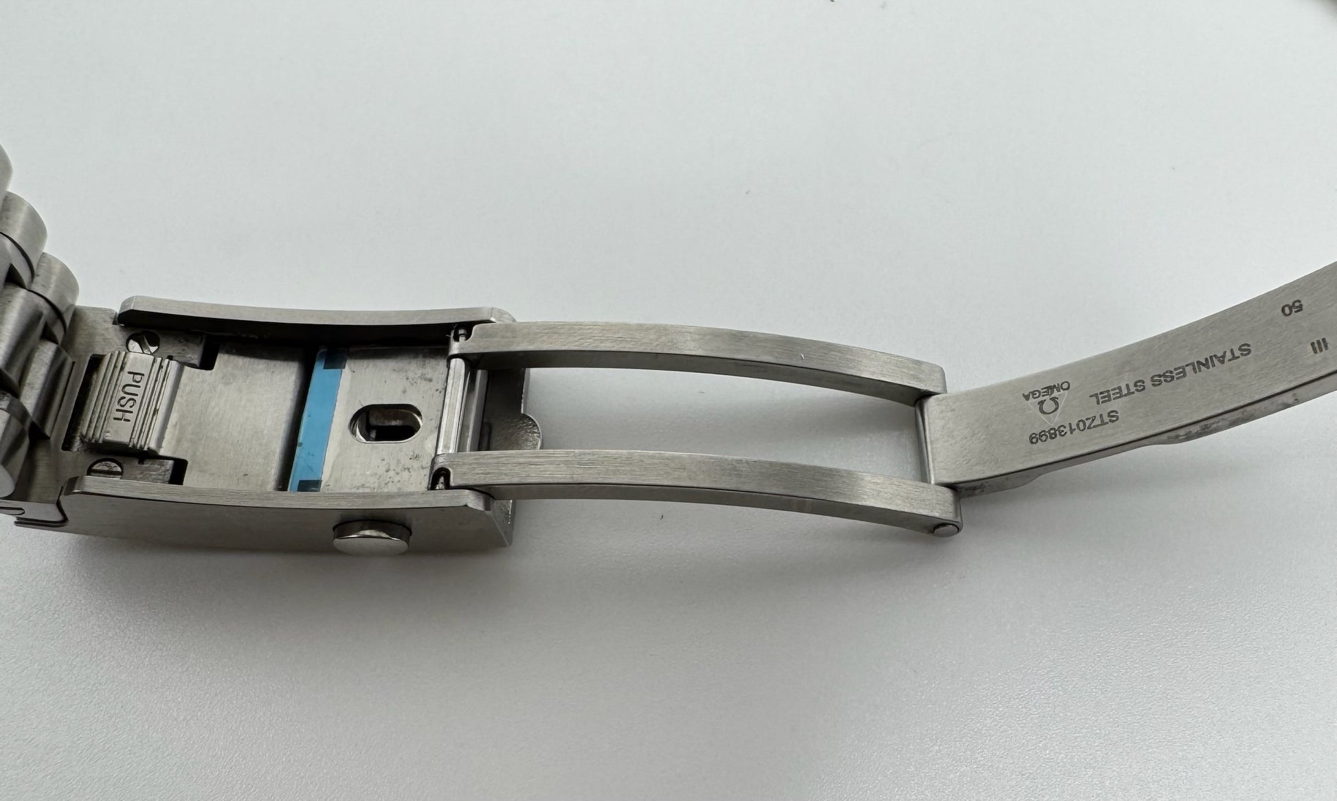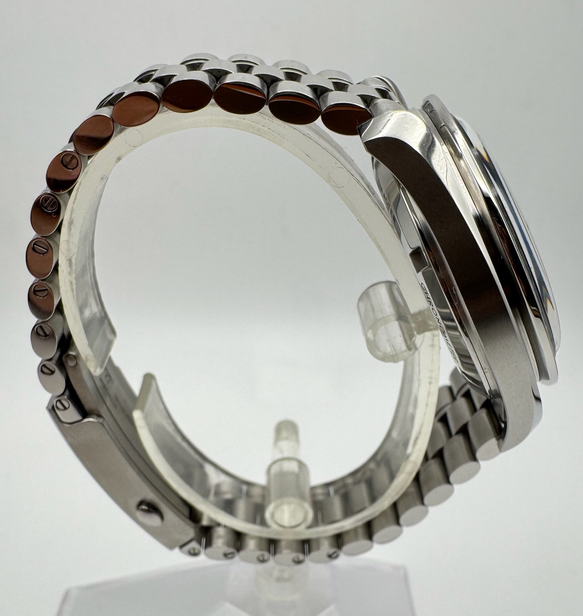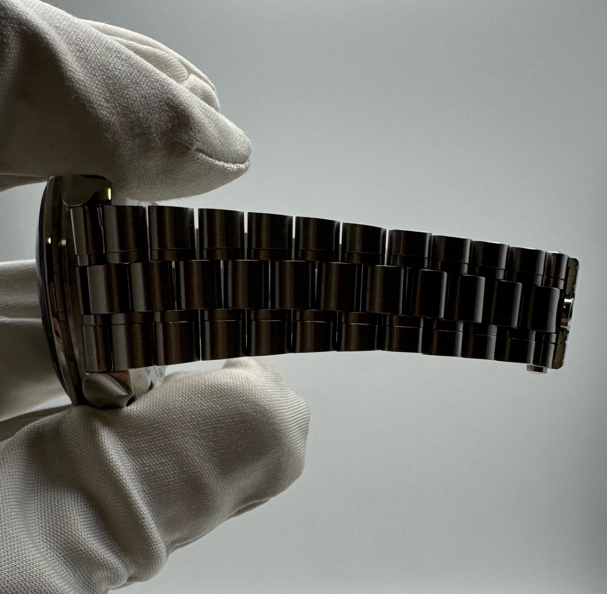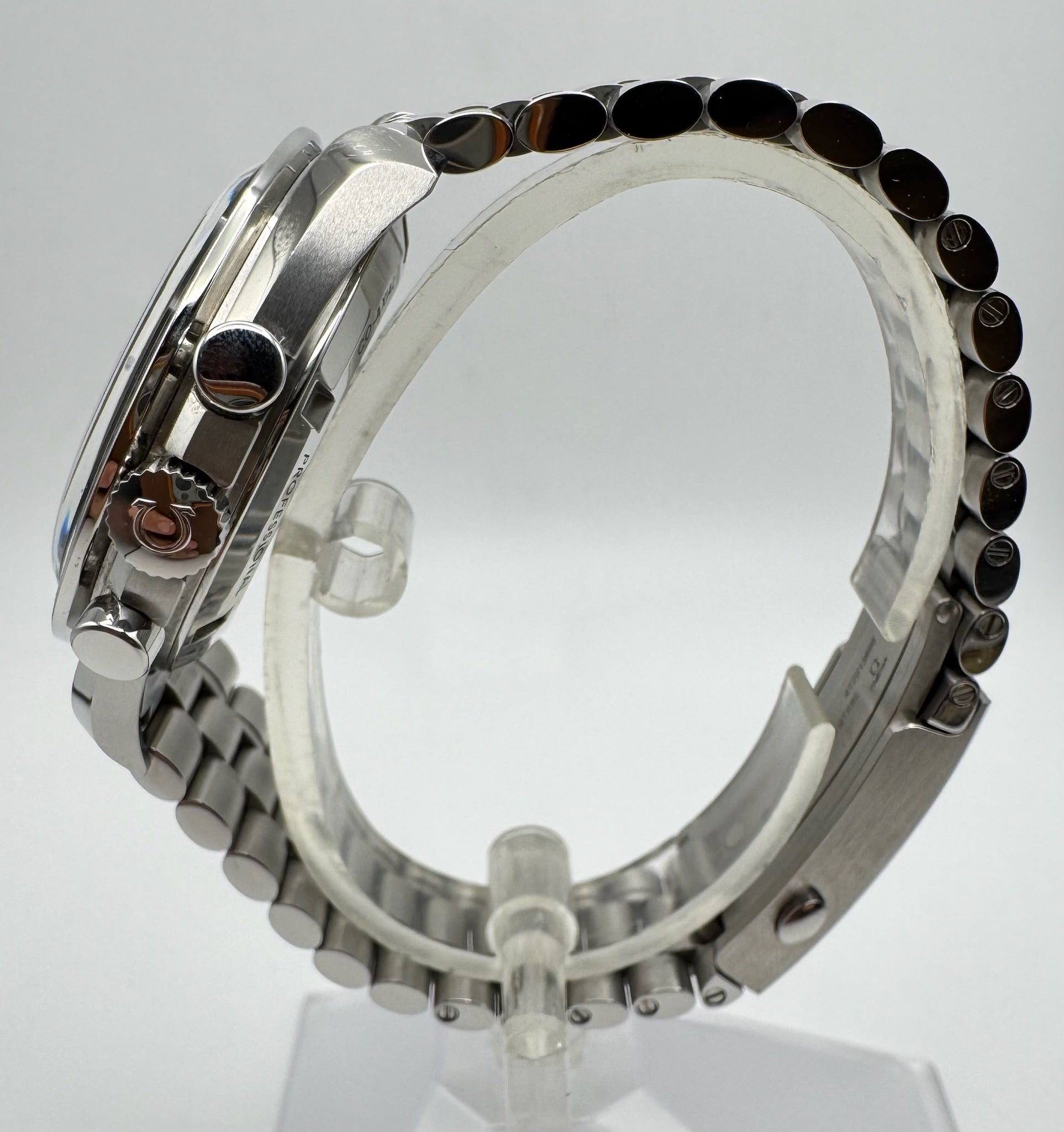 The full steel case offers both durability and a sleek aesthetic, and the bracelet is finely crafted, providing a comfortable and secure fit on the wrist. This model is in exceptional condition, showing minimal signs of wear with the case remaining in mint condition. The case back exhibits only light scratches, and the bracelet, which accommodates wrists up to 8 inches, shows only slight wear on the buckle.