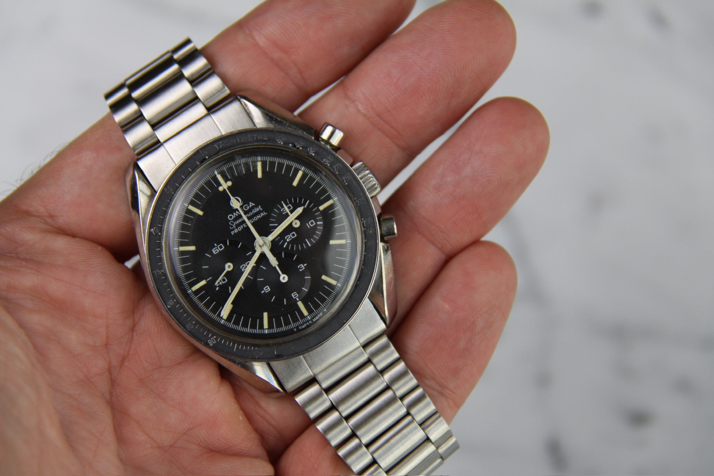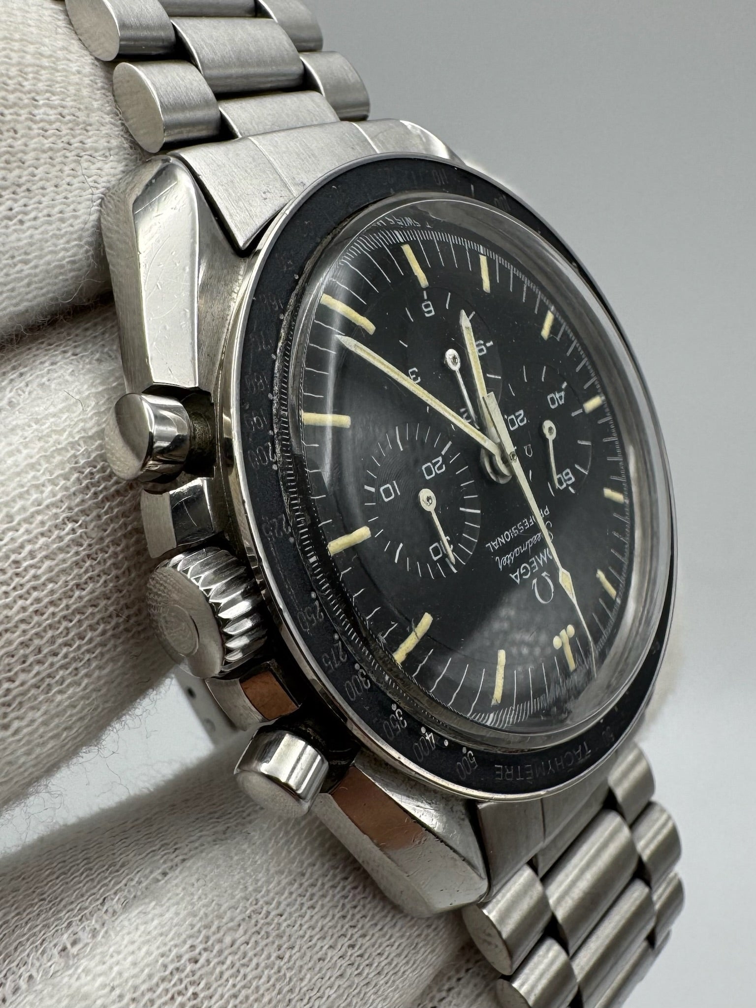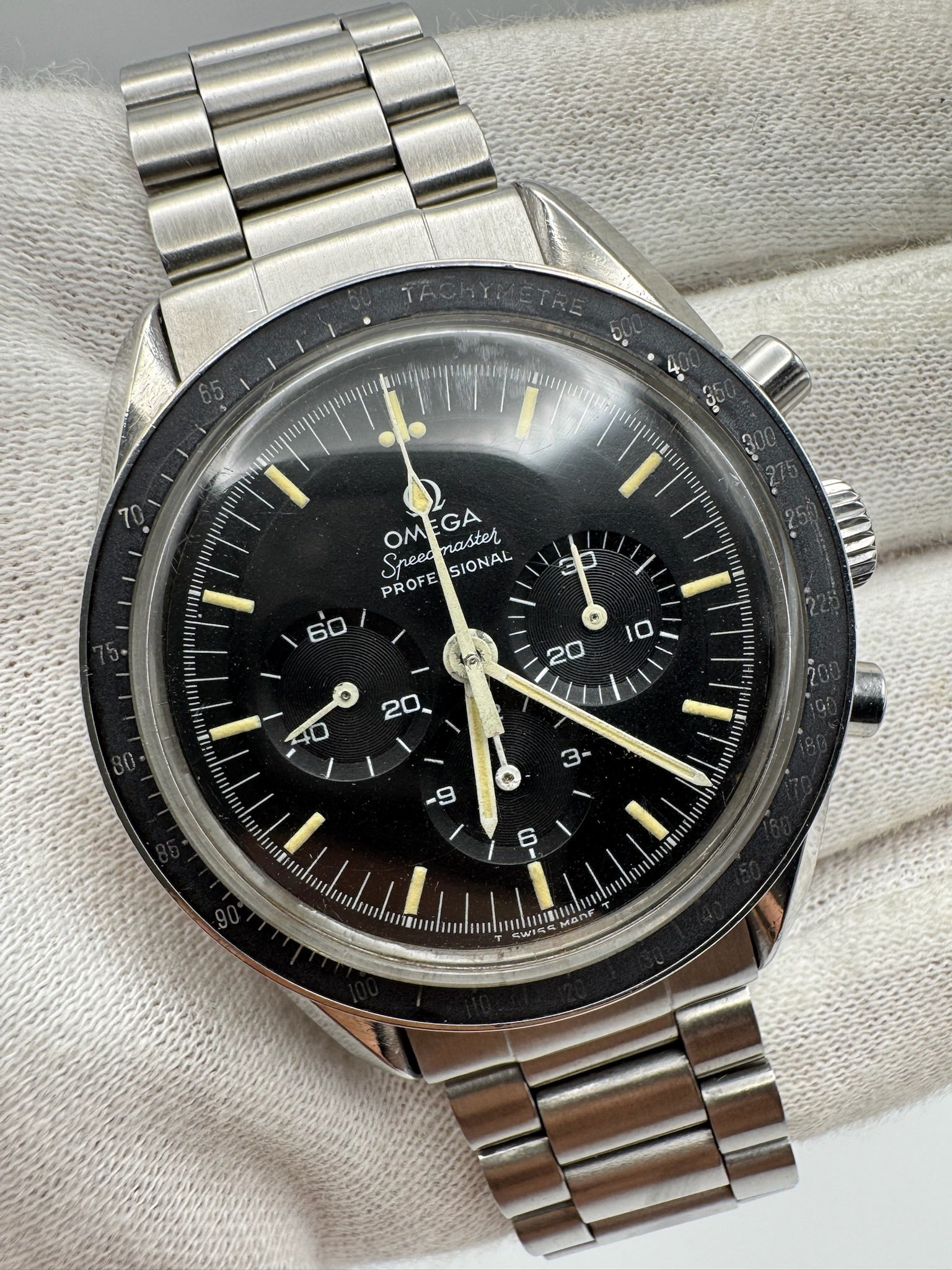 Omega Speedmaster Professional Moonwatch Full Steel Ghost Bezel Yellow Patina Step Dial 1969 (Serviced)
