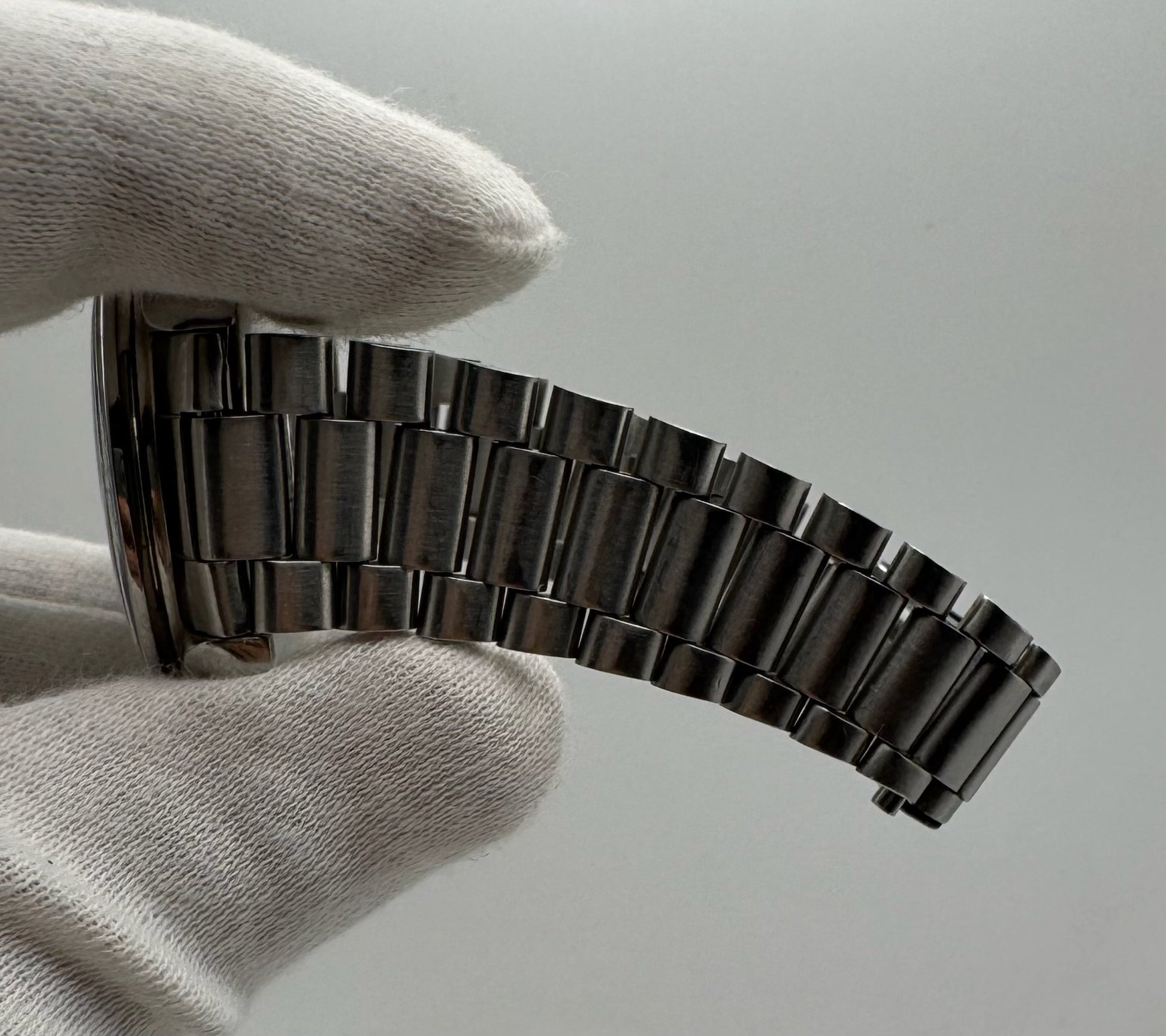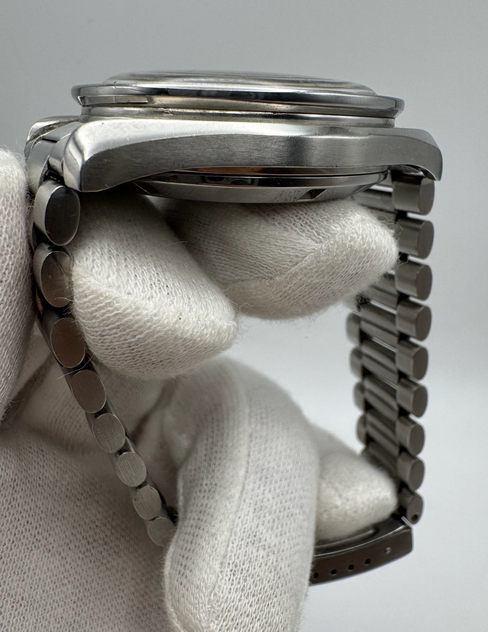 The original plexiglass crystal shows minimal wear, maintaining excellent clarity. The tachymeter bezel insert exhibits period-appropriate aging with subtle blue tinting and gentle fading that adds character while preserving functionality. The stainless steel case retains its sharp edges and original brushed finish, while the matching steel bracelet demonstrates minimal stretch despite its age, currently fitting wrist sizes 7.5-7.7 inches (19.5cm). Additional links are available upon request to accommodate larger wrists.