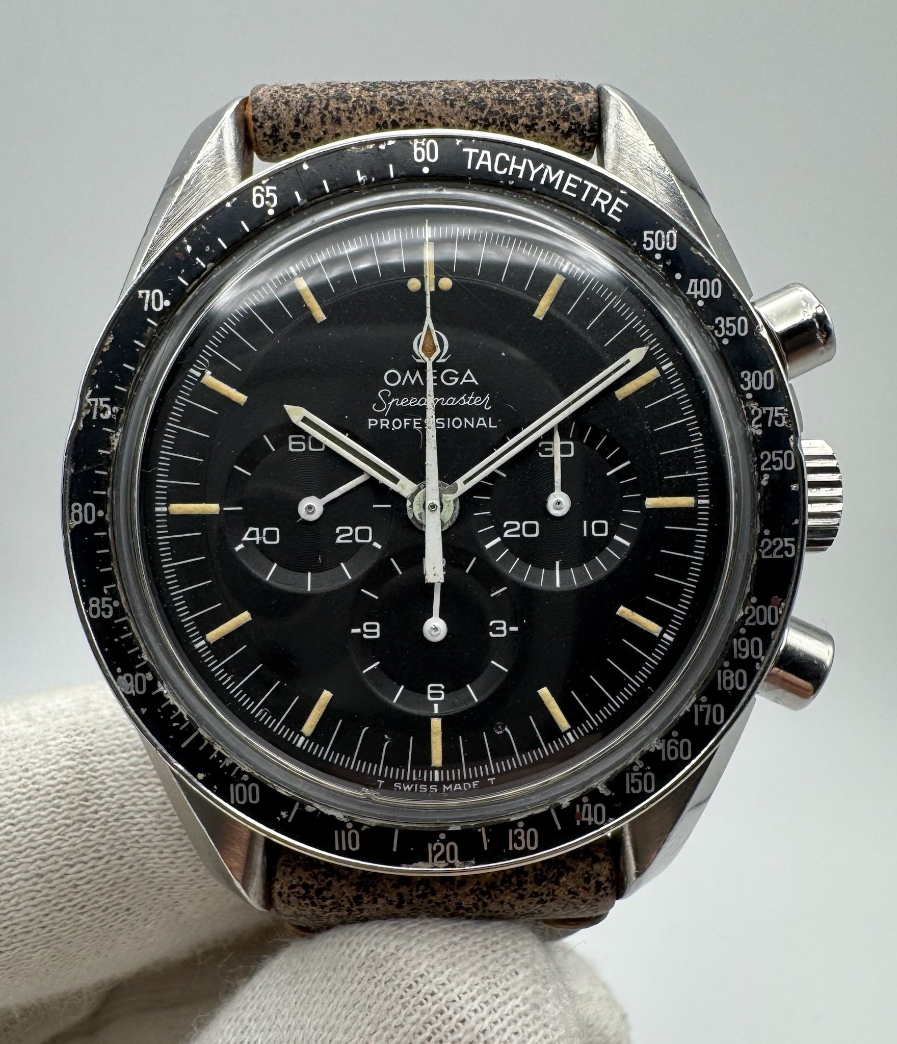 This Omega Speedmaster Moonwatch ref. 145.022-69 is presented in all-original configuration and remains in very nice overall condition, showcasing honest wear consistent with age. The case displays visible signs of use that add character, with well-defined lines that reflect careful ownership over time.