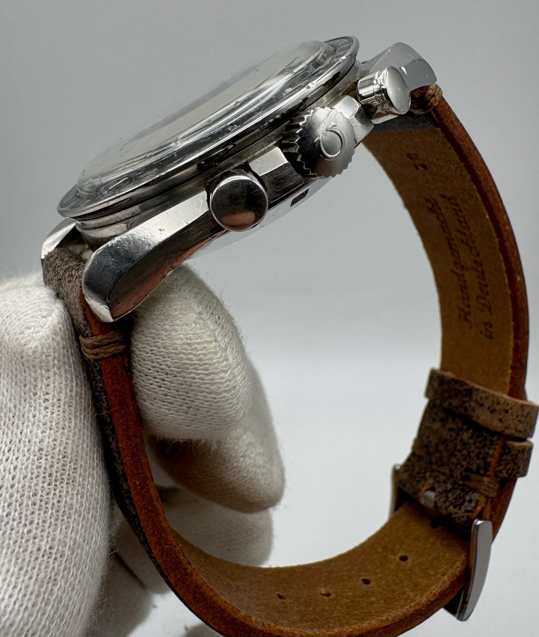 The movement was professionally serviced in January 2026 and is running accurately. The watch is paired with a new handmade 20/16mm vintage leather strap and fitted with an Omega pin buckle, completing a well-balanced and historically correct presentation of this iconic Moonwatch reference.