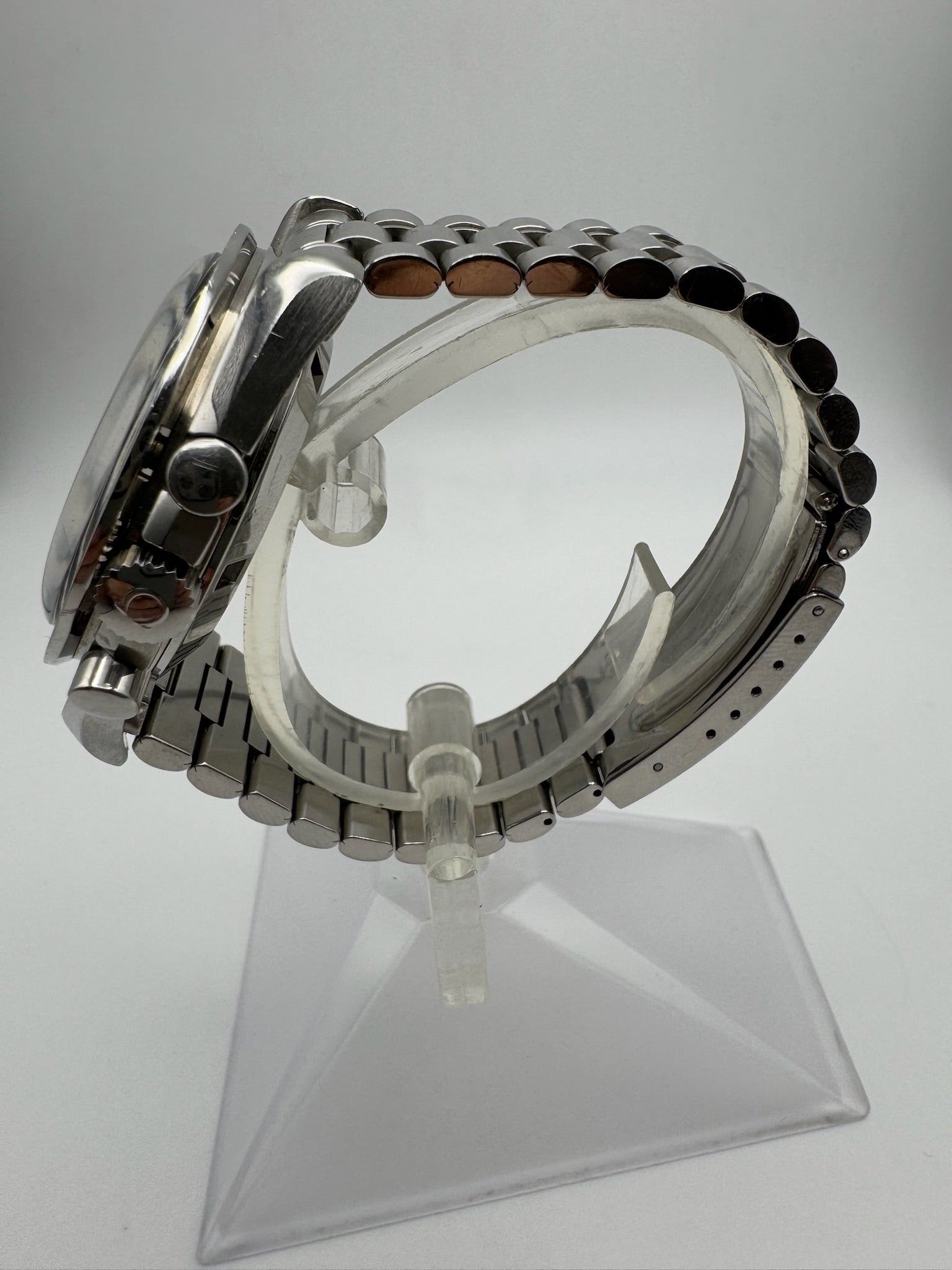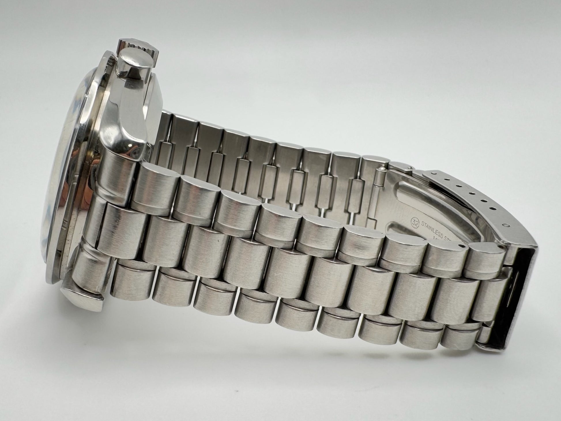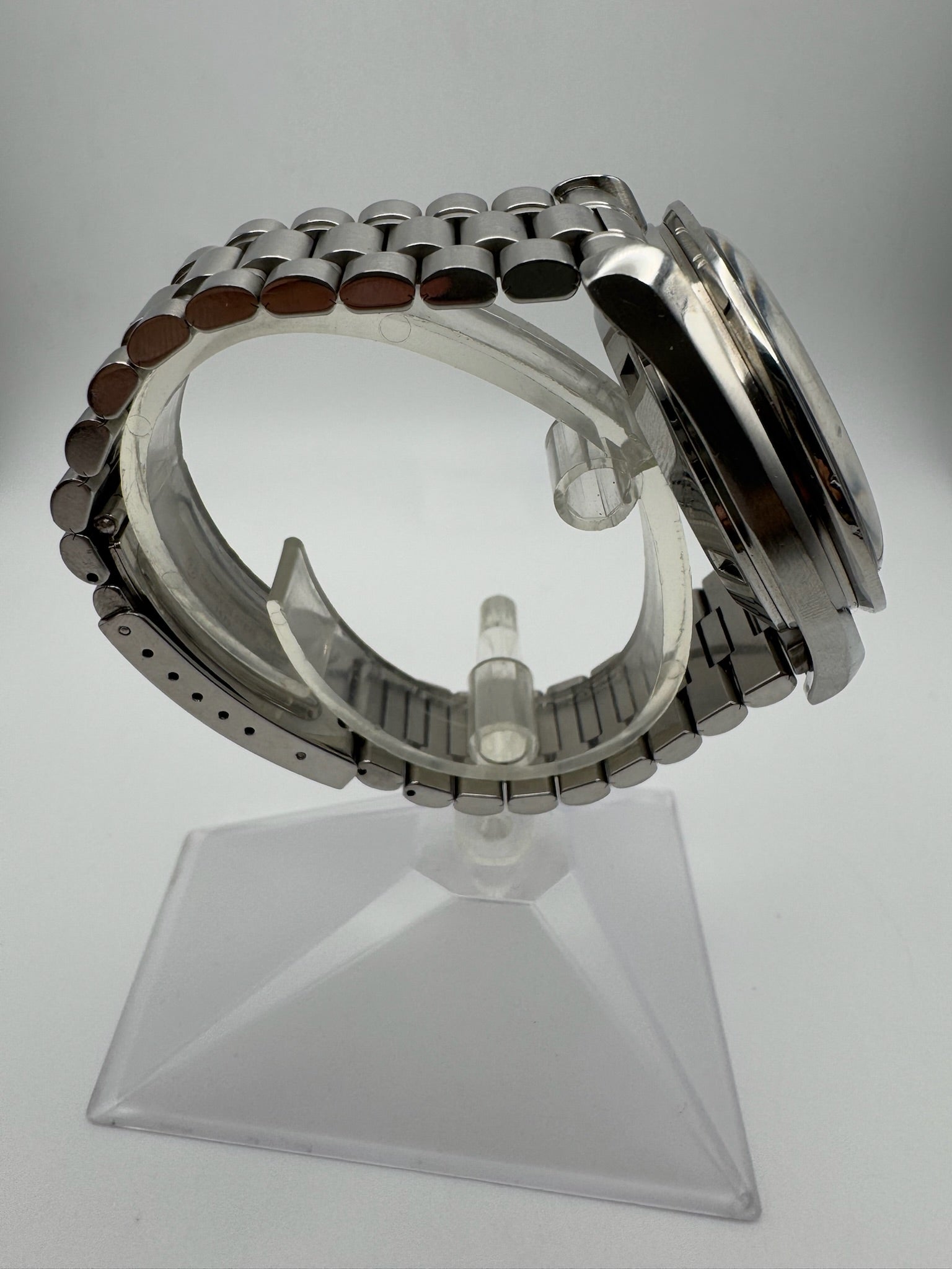The stainless steel case remains in superb condition, featuring sharp edges and thick lugs that emphasize its robust design. The steel bracelet is in outstanding shape, showing minimal stretch and fitting wrists up to approximately 7.2–7.3 inches (18.2–18.5 cm).