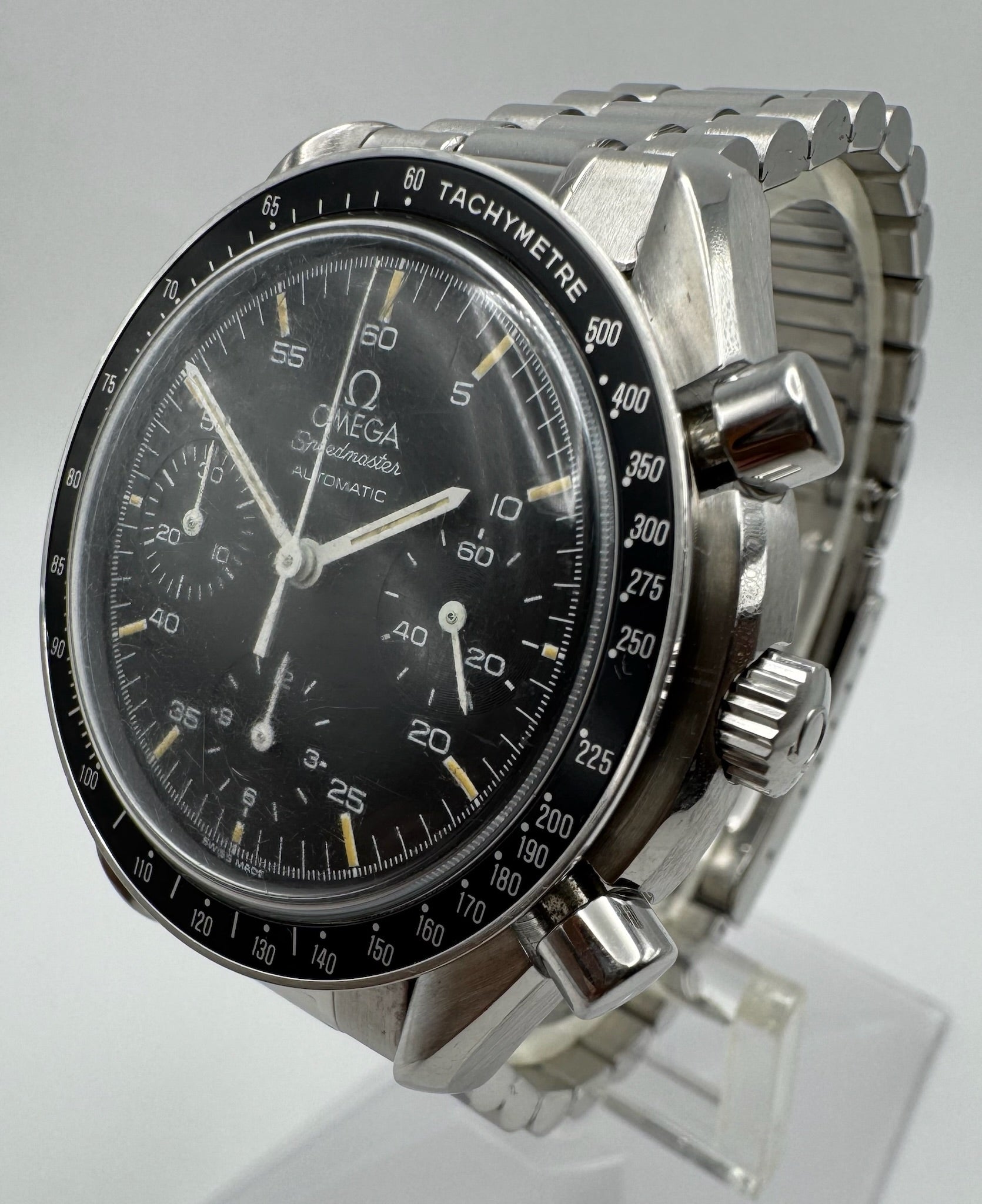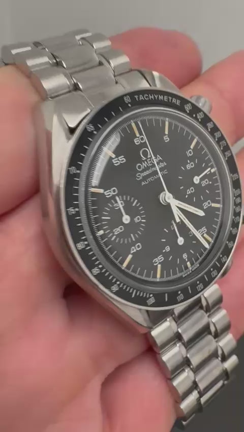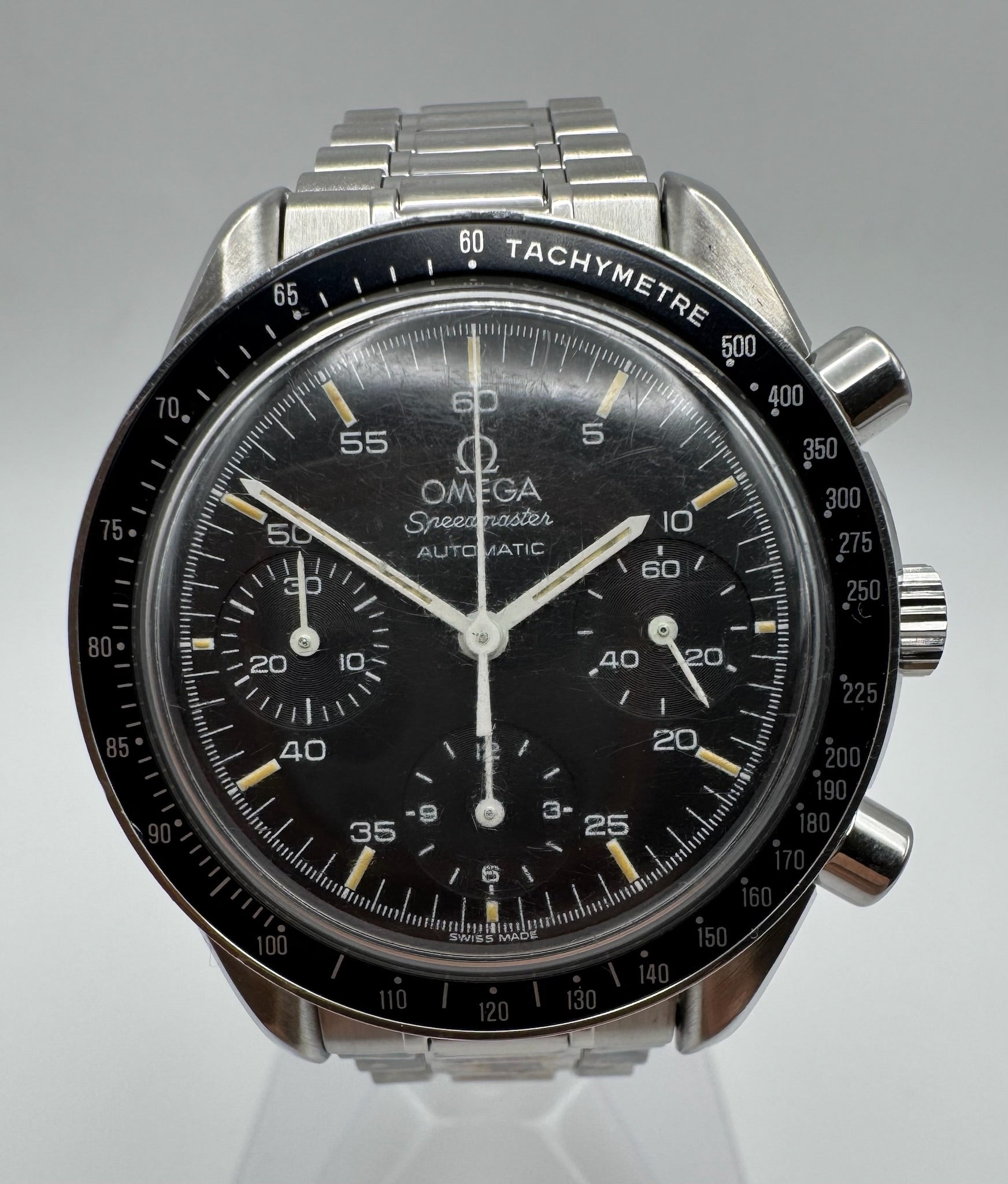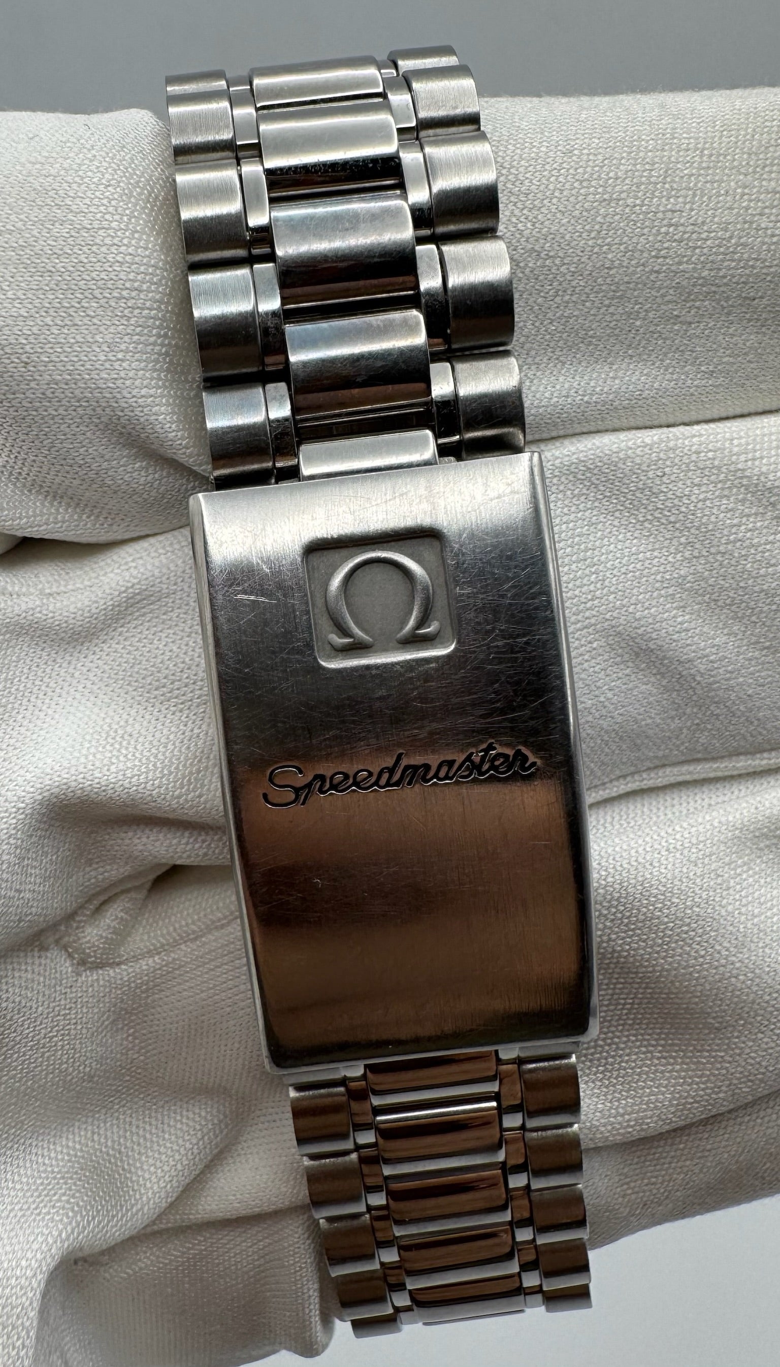 This Omega Speedmaster Reduced, crafted from full steel and completely original, is in unpolished condition, preserving its factory finish. The case remains in very good overall shape, showing minimal signs of wear. The original black tritium dial displays a noticeable patina on the indices, complementing the matching tritium hands for a vintage appeal.