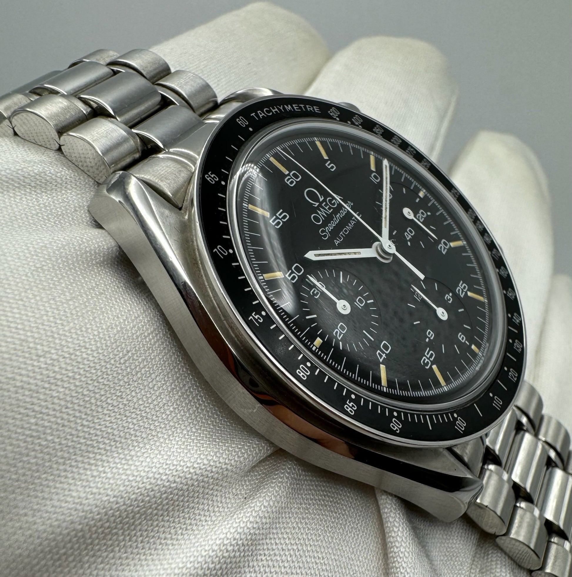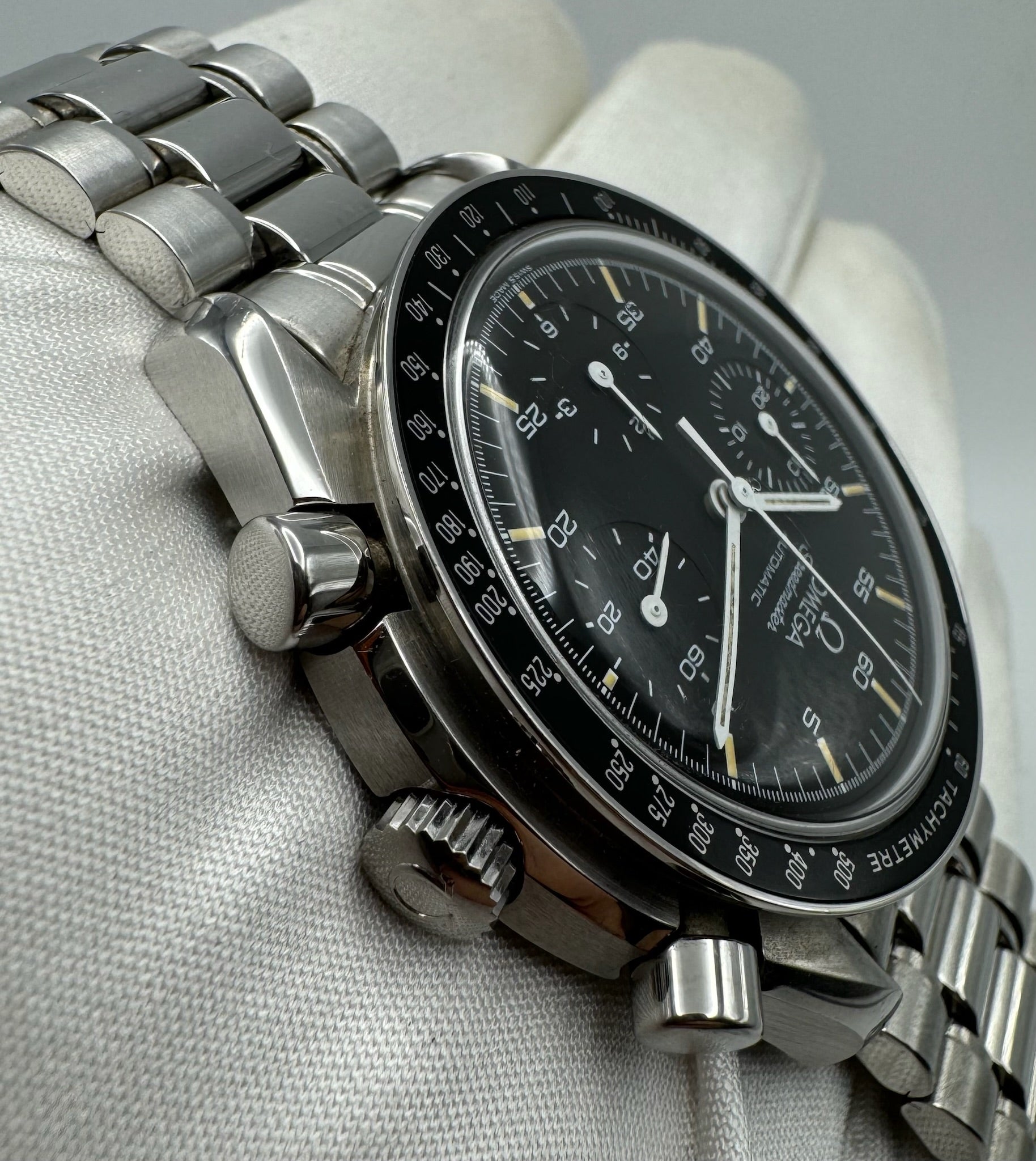 This Omega Speedmaster Reduced is all original and remains in unpolished condition, showcasing sharp edges with its factory finish intact. The black tritium dial is in excellent shape, featuring heavy patina on the indices with matching hands that add character to the overall look.