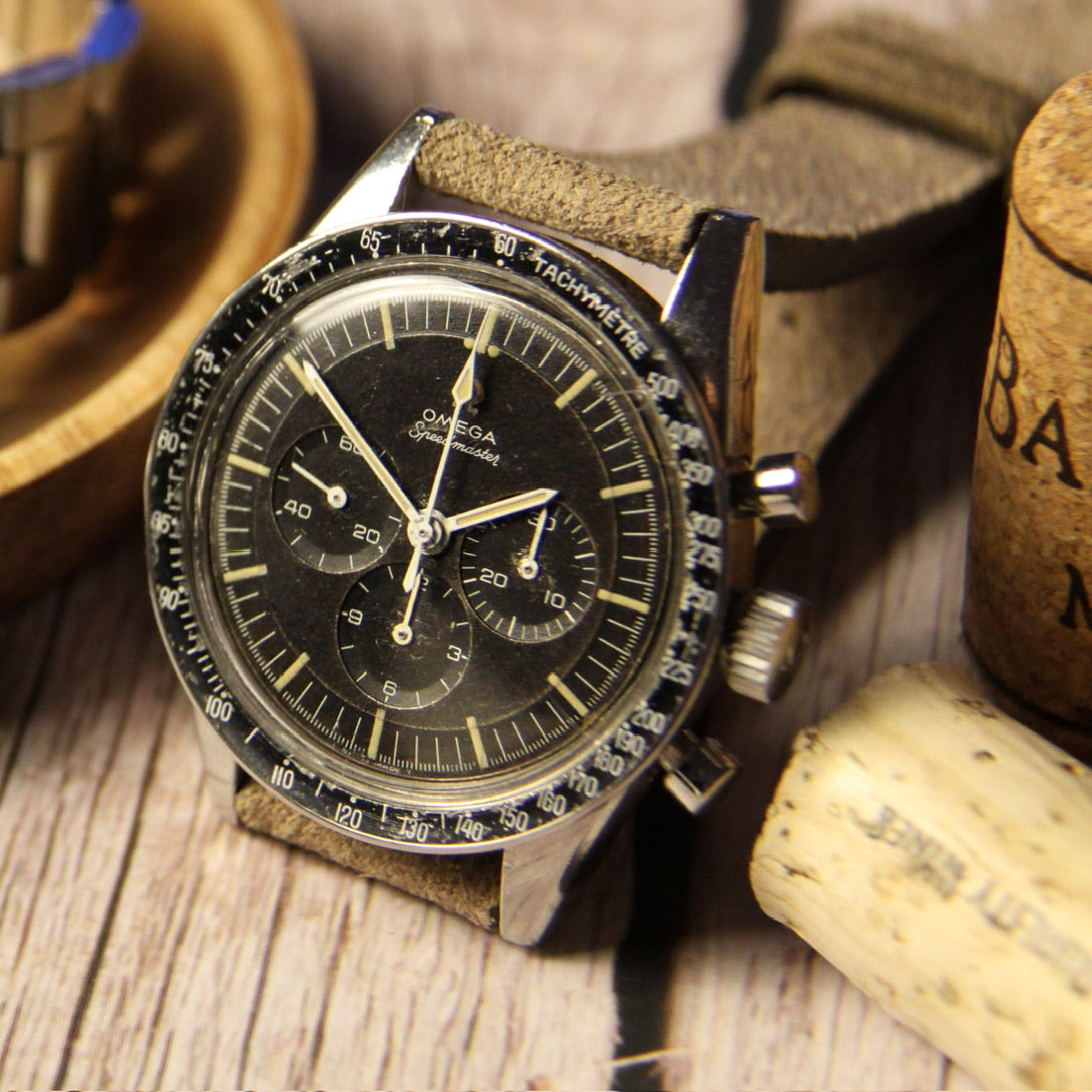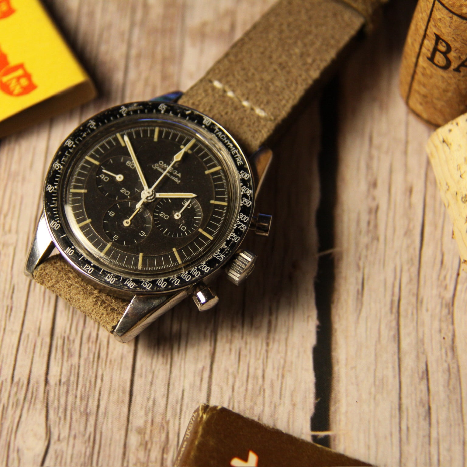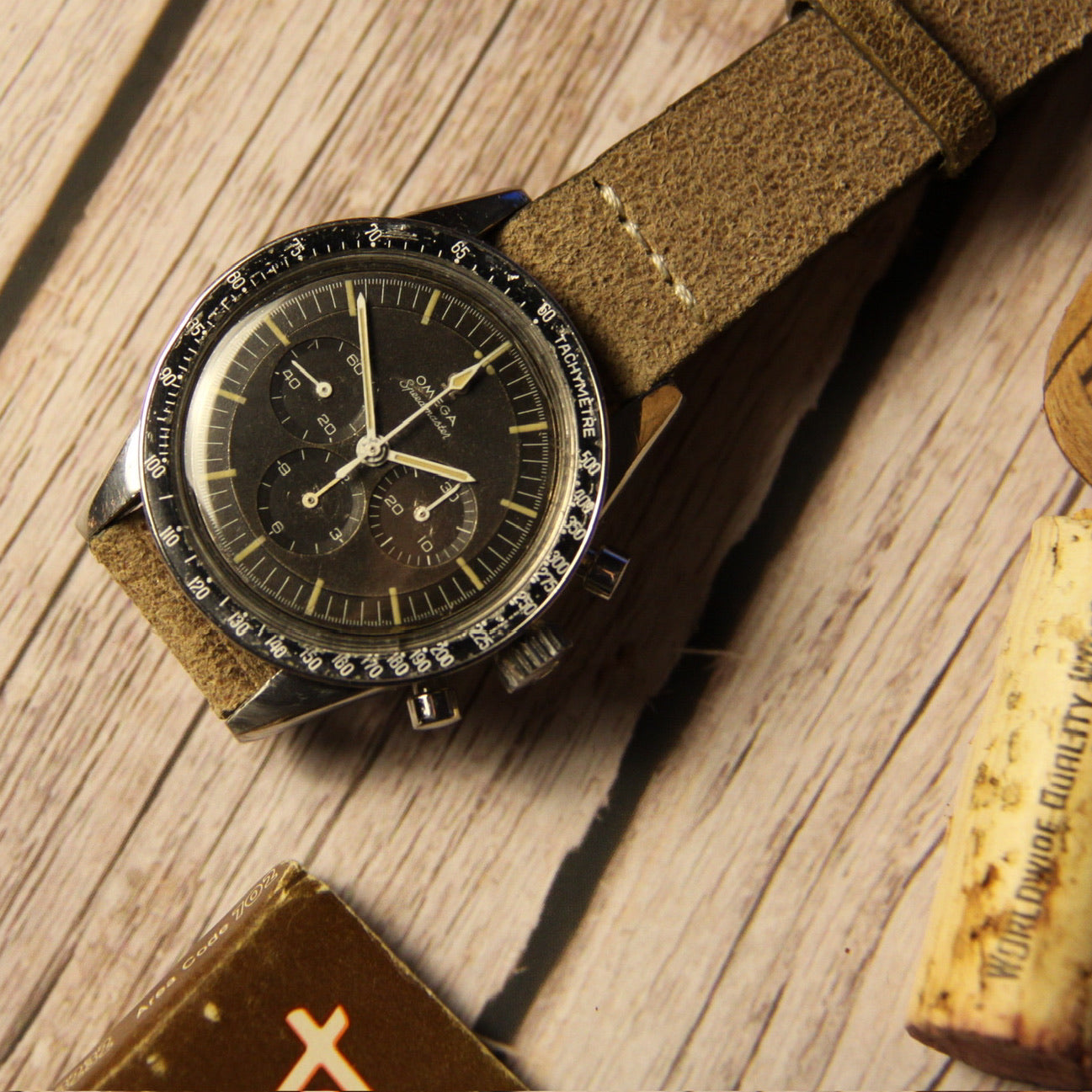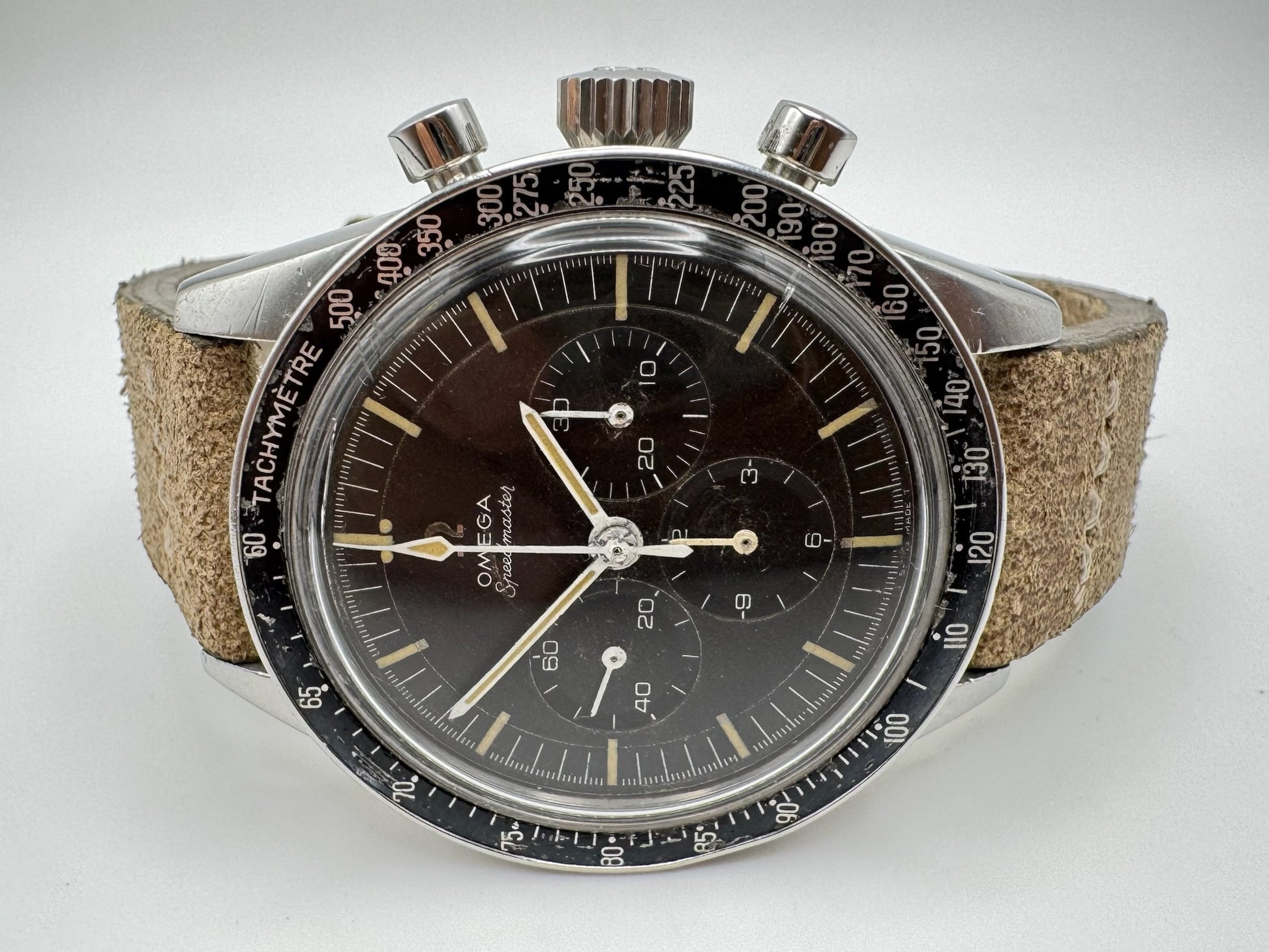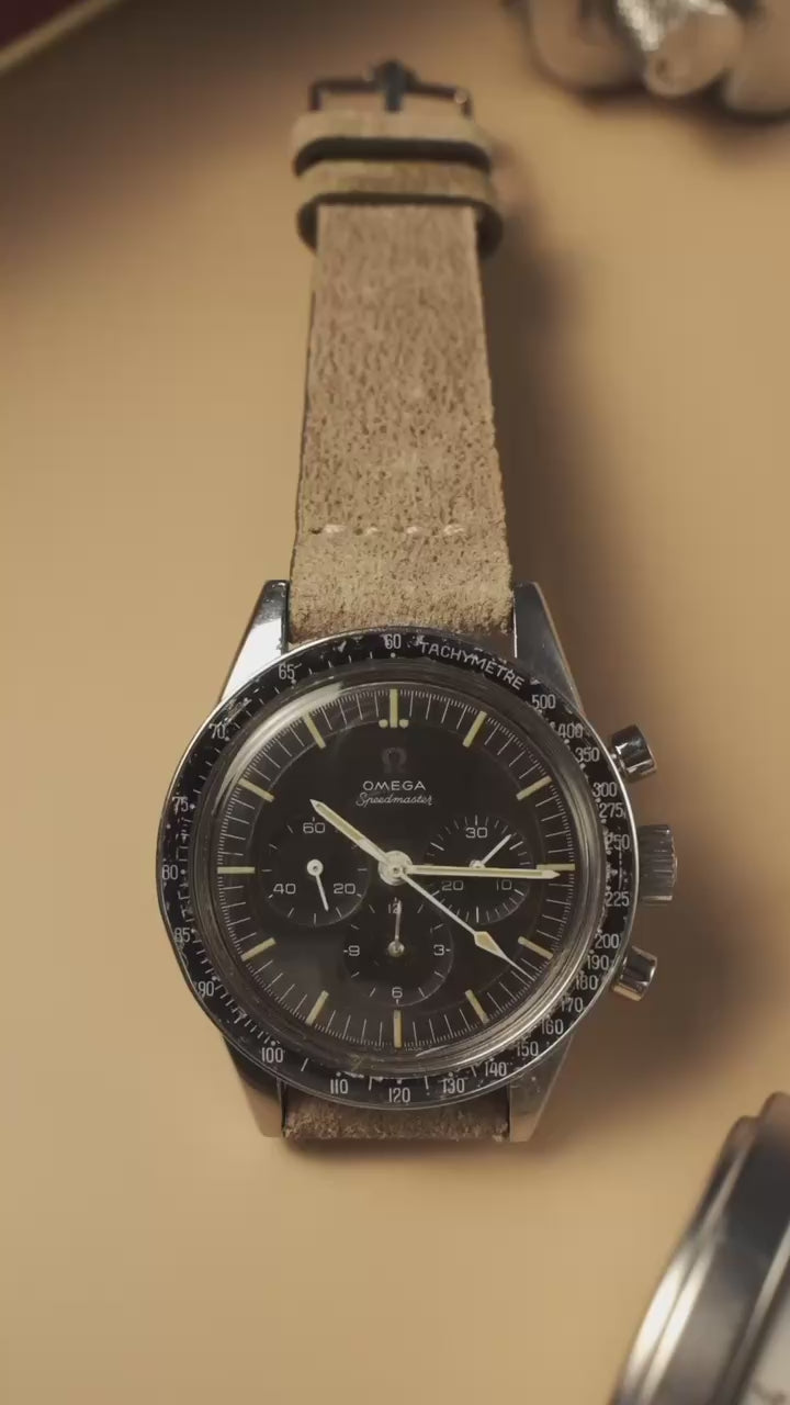 The watch is paired with an additional vintage ammo leather strap and features an original, period-correct steel Omega pin buckle, completing its classic look. This is an exceptional piece for anyone passionate about the history and craftsmanship of the Speedmaster.