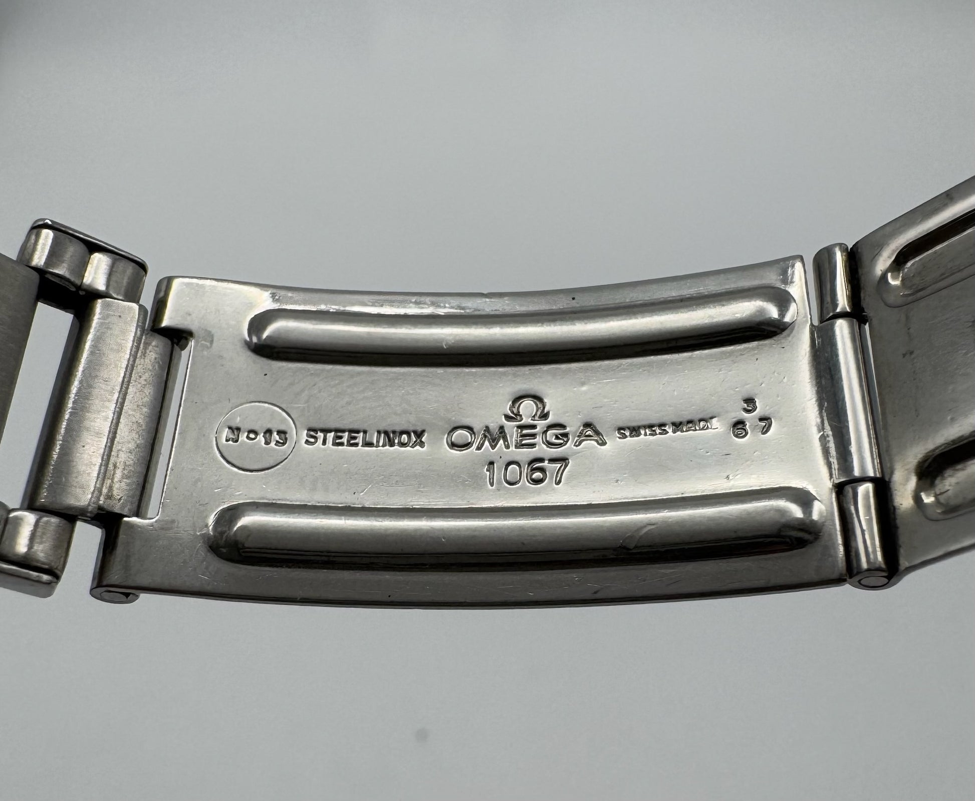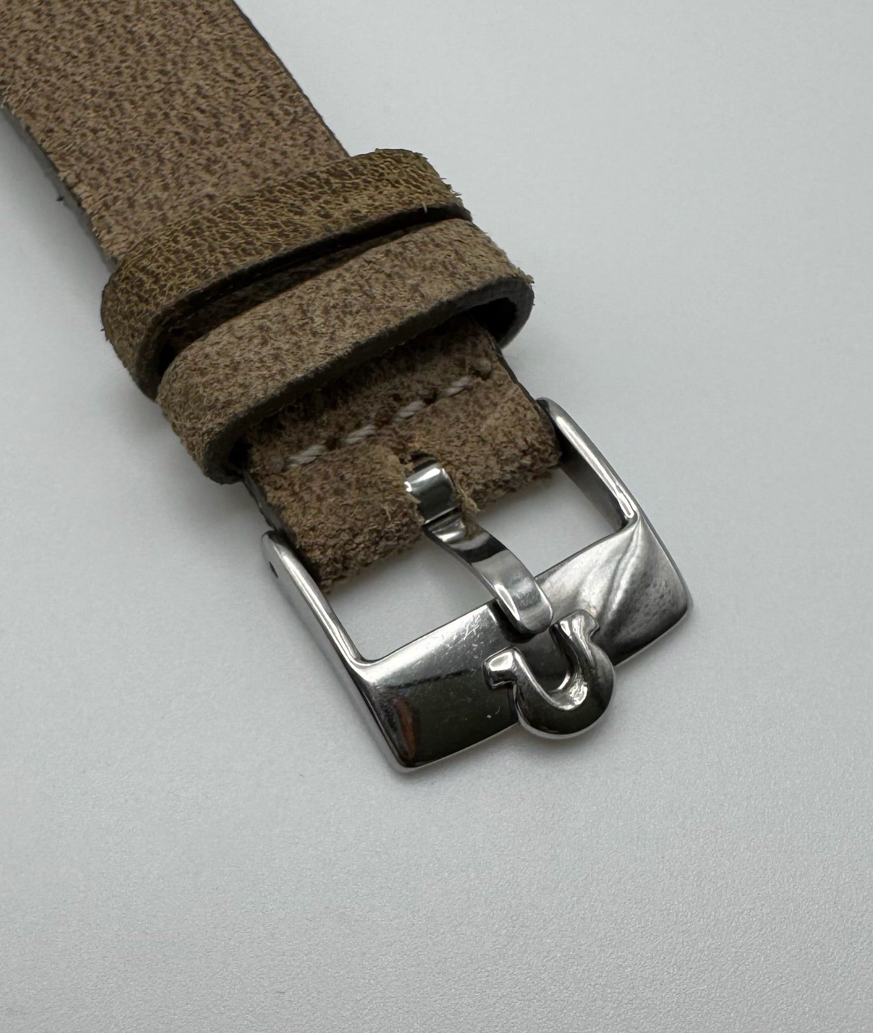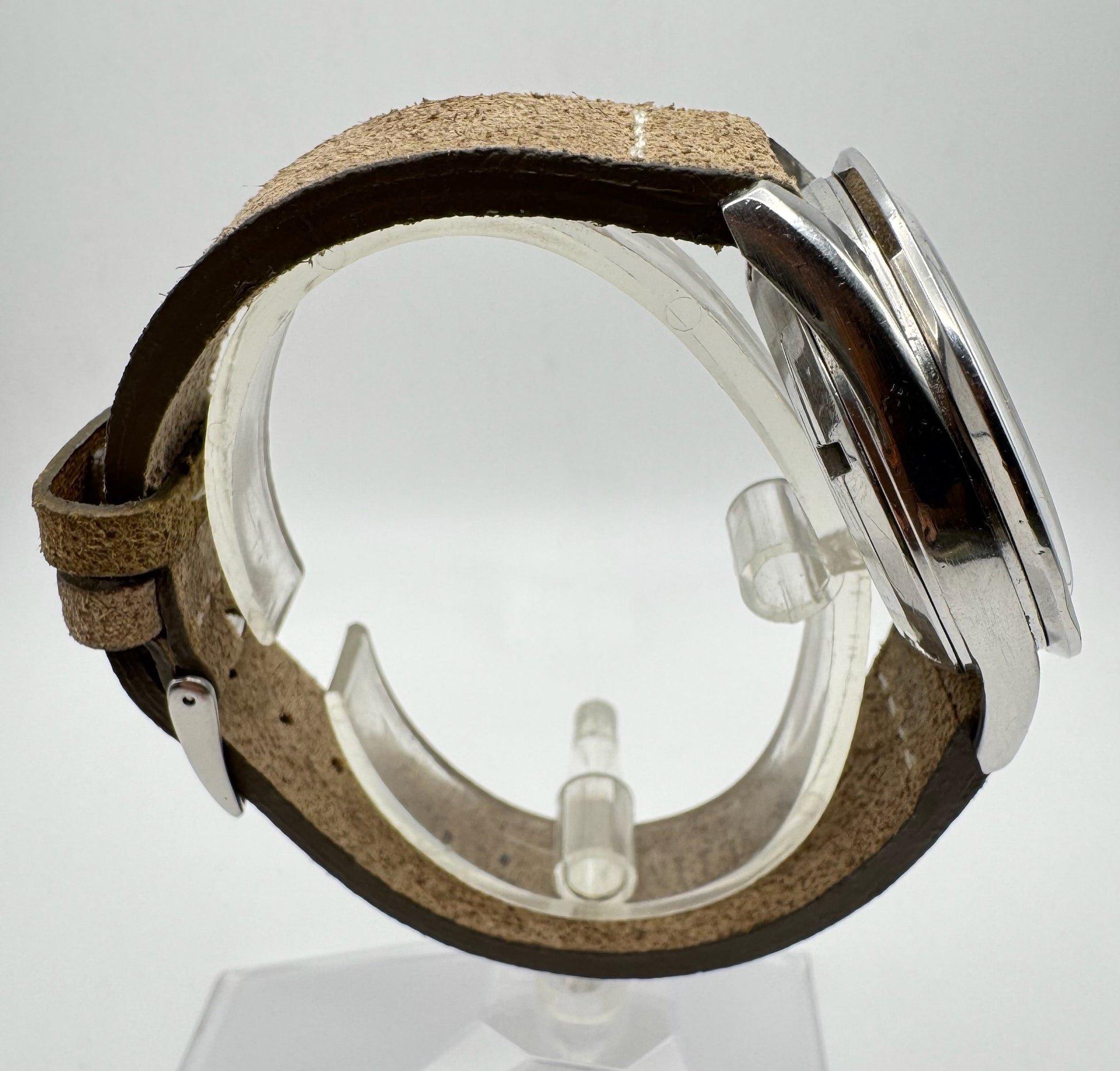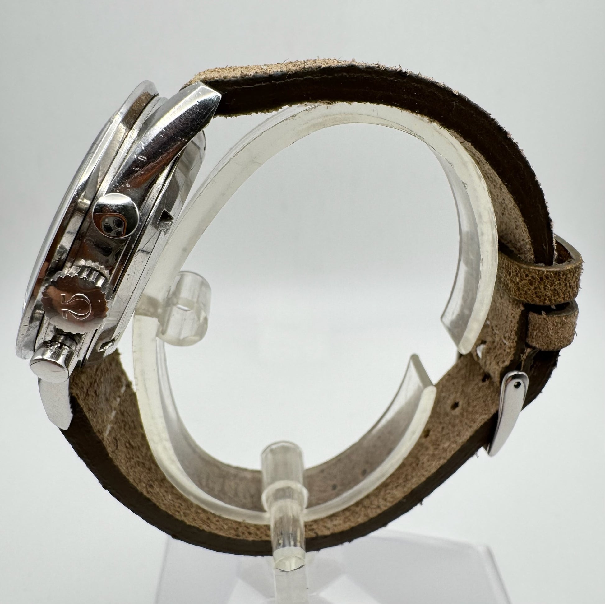 The watch is paired with an additional vintage ammo leather strap and features an original, period-correct steel Omega pin buckle, completing its classic look. This is an exceptional piece for anyone passionate about the history and craftsmanship of the Speedmaster.