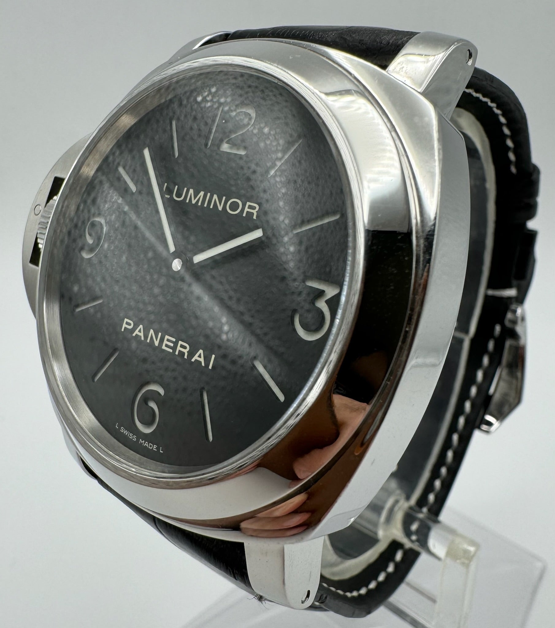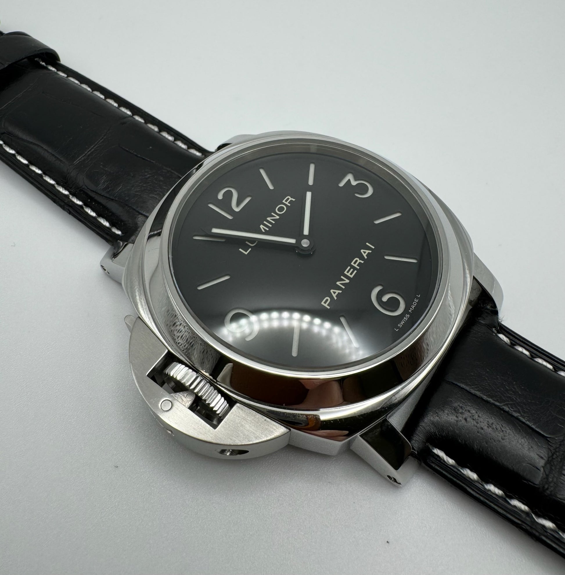 Introducing the Panerai Luminor Base Left-Handed PAM00219, a rare and distinguished timepiece for the discerning collector. Crafted in 2007 and part of a limited series of only 400 pieces, this watch is a true collector's item, boasting an all-original, unpolished case that retains its factory edges and showcases minimal wear, free from severe scratches or dings.
