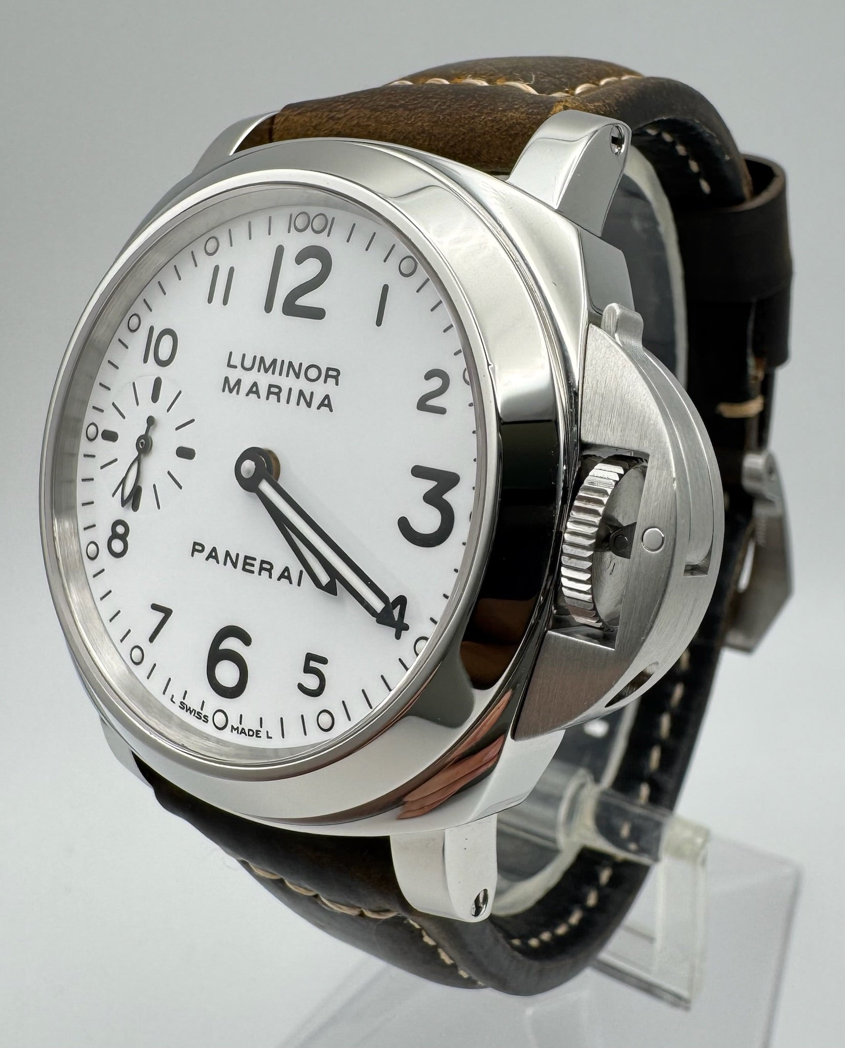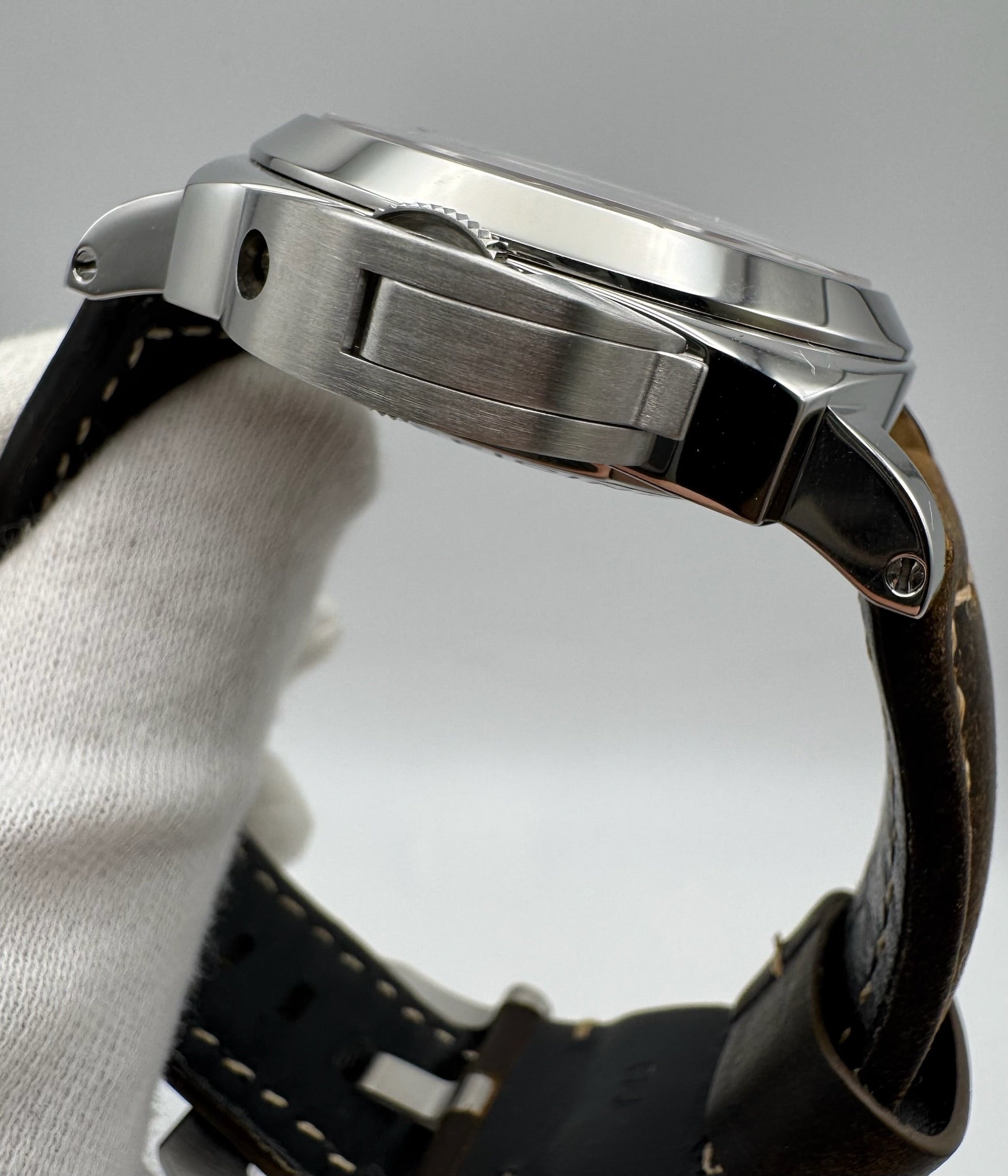This Panerai Luminor Marina PAM113 features the iconic 44mm stainless steel case in exceptional condition, showing minimal signs of wear. The crisp white dial remains pristine, accented by black Arabic numerals and the signature small seconds subdial at 9 o’clock, offering excellent legibility and a clean, balanced design.