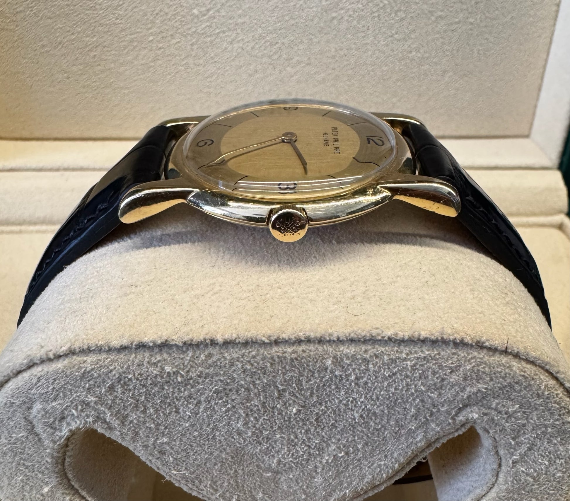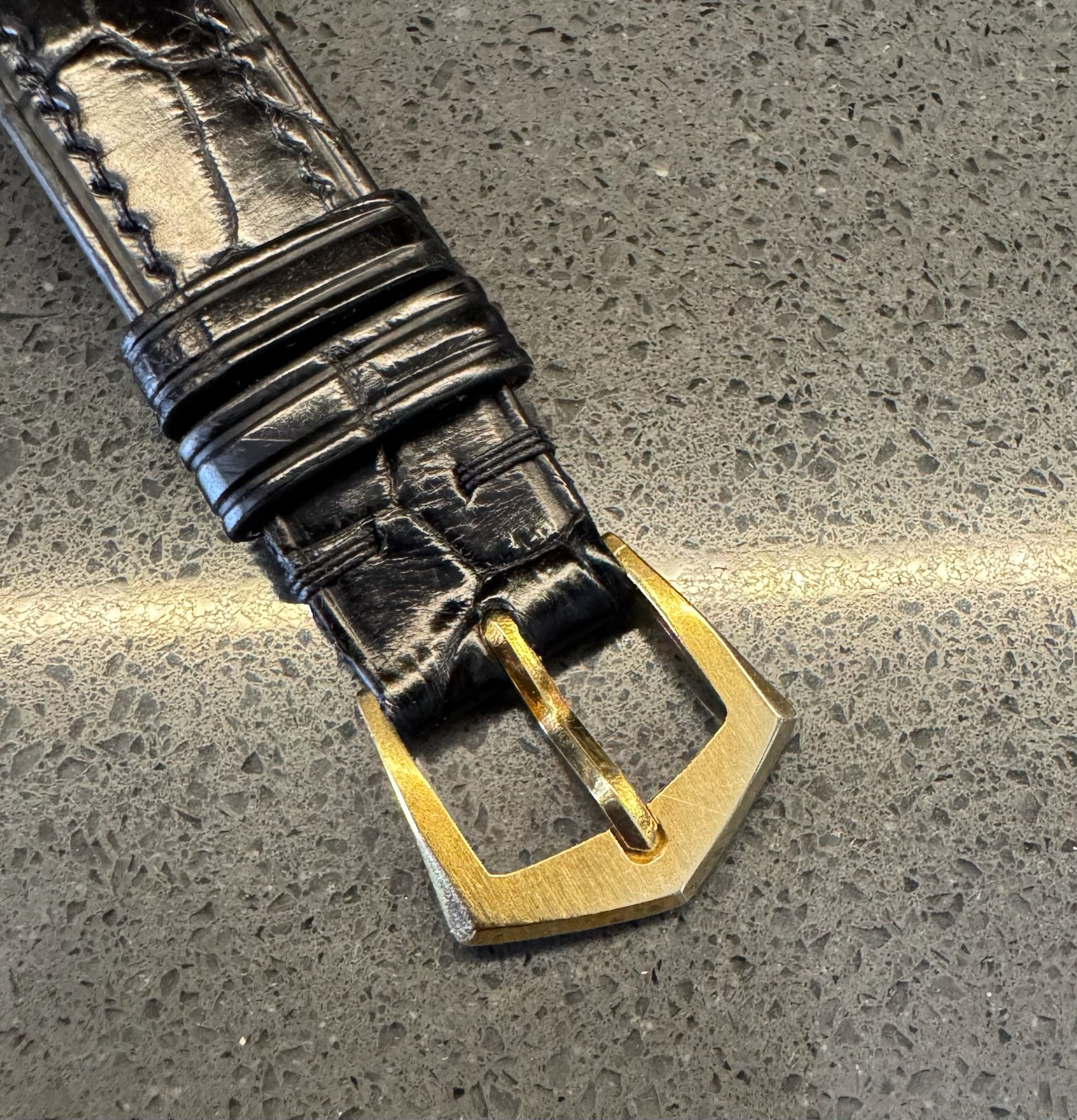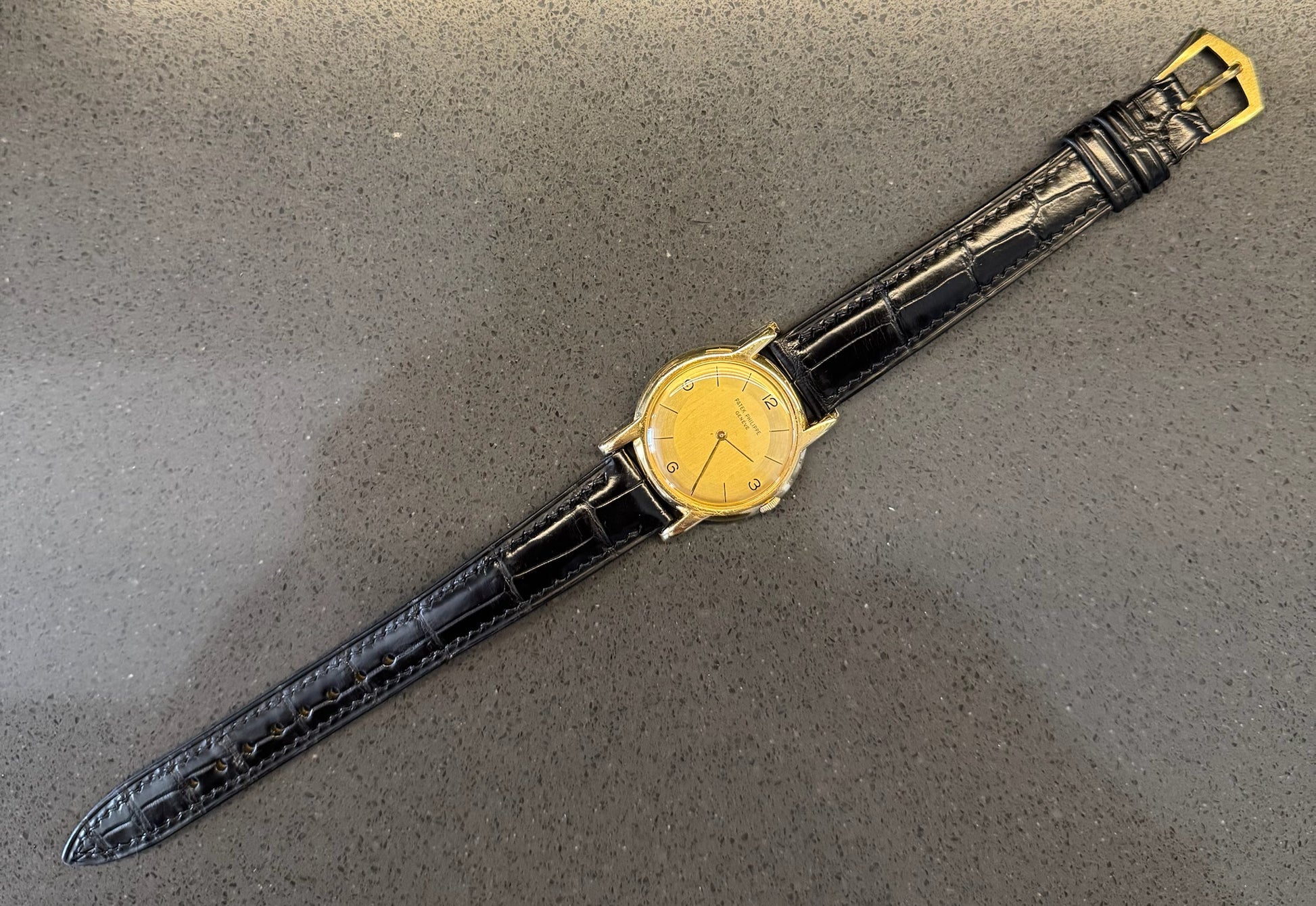 The movement was professionally serviced in June 2025 and is running accurately. Completing the watch is a handmade genuine alligator strap paired with the original yellow gold Patek Philippe pin buckle.