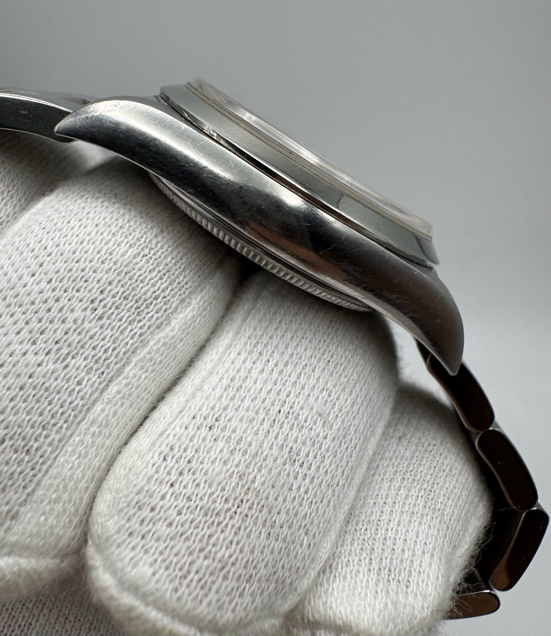 This Rolex Air-King Ref. 14000 is a one-owner piece, preserved in original unpolished condition. The stainless steel case retains its factory finish, with thick, sharp lugs and only light signs of careful use over the years.