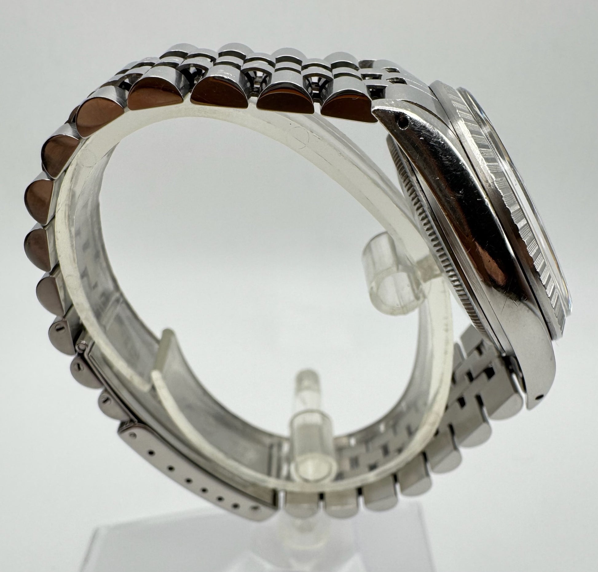 This 1974 Rolex Datejust 1603 stands out as a rare and collectible piece, featuring the distinctive silver hand-etched dial with the red Khanjar logo, a symbol of exclusivity. The stainless steel case remains in its original, never-polished condition, showing only minimal signs of wear and preserving the integrity of this historic timepiece.