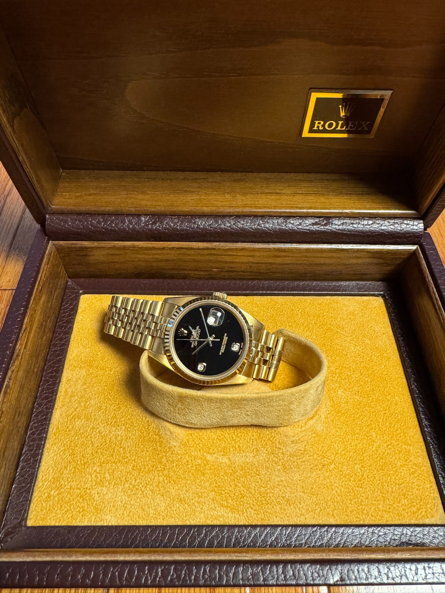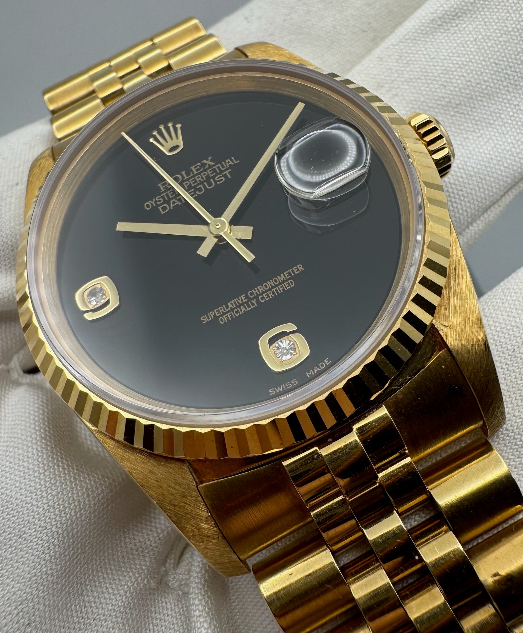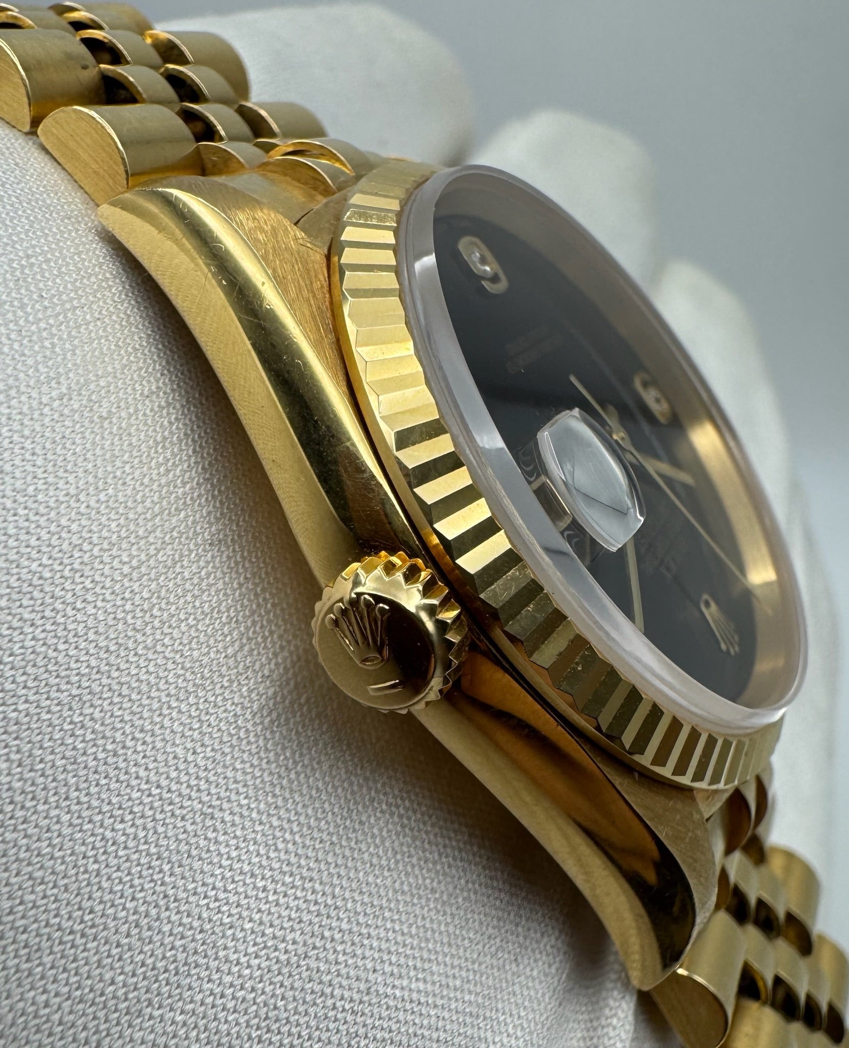 The original yellow gold Jubilee bracelet is exceptionally well-preserved, displaying minimal stretch and adding to the watch’s refined presence on the wrist. Powered by a recently serviced movement from the prior owner, this Datejust runs accurately and performs reliably.