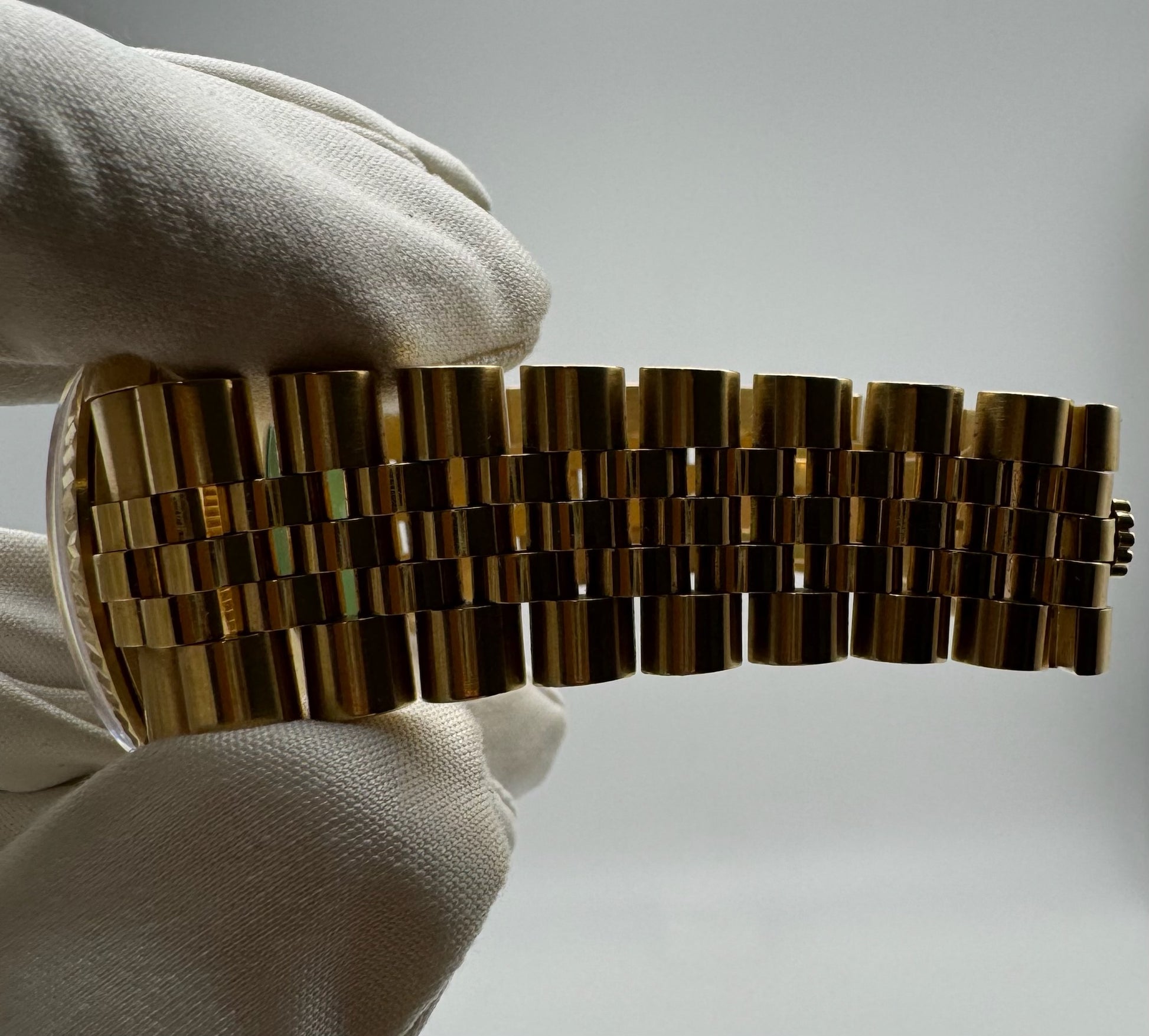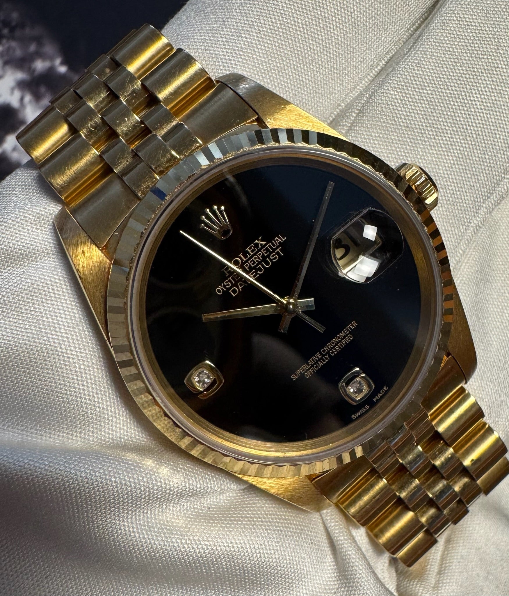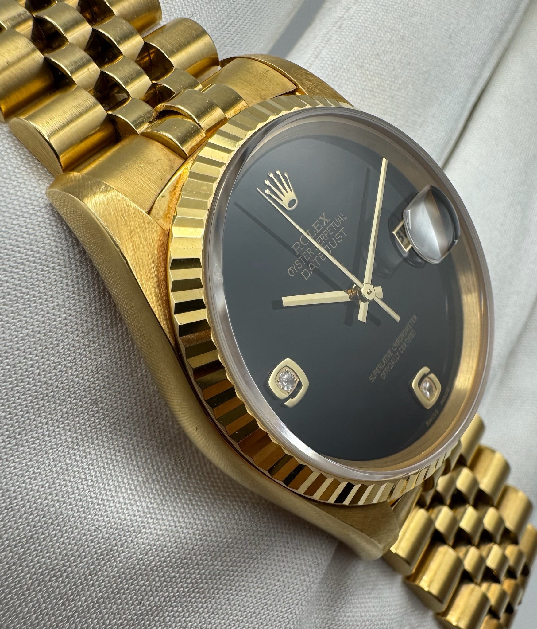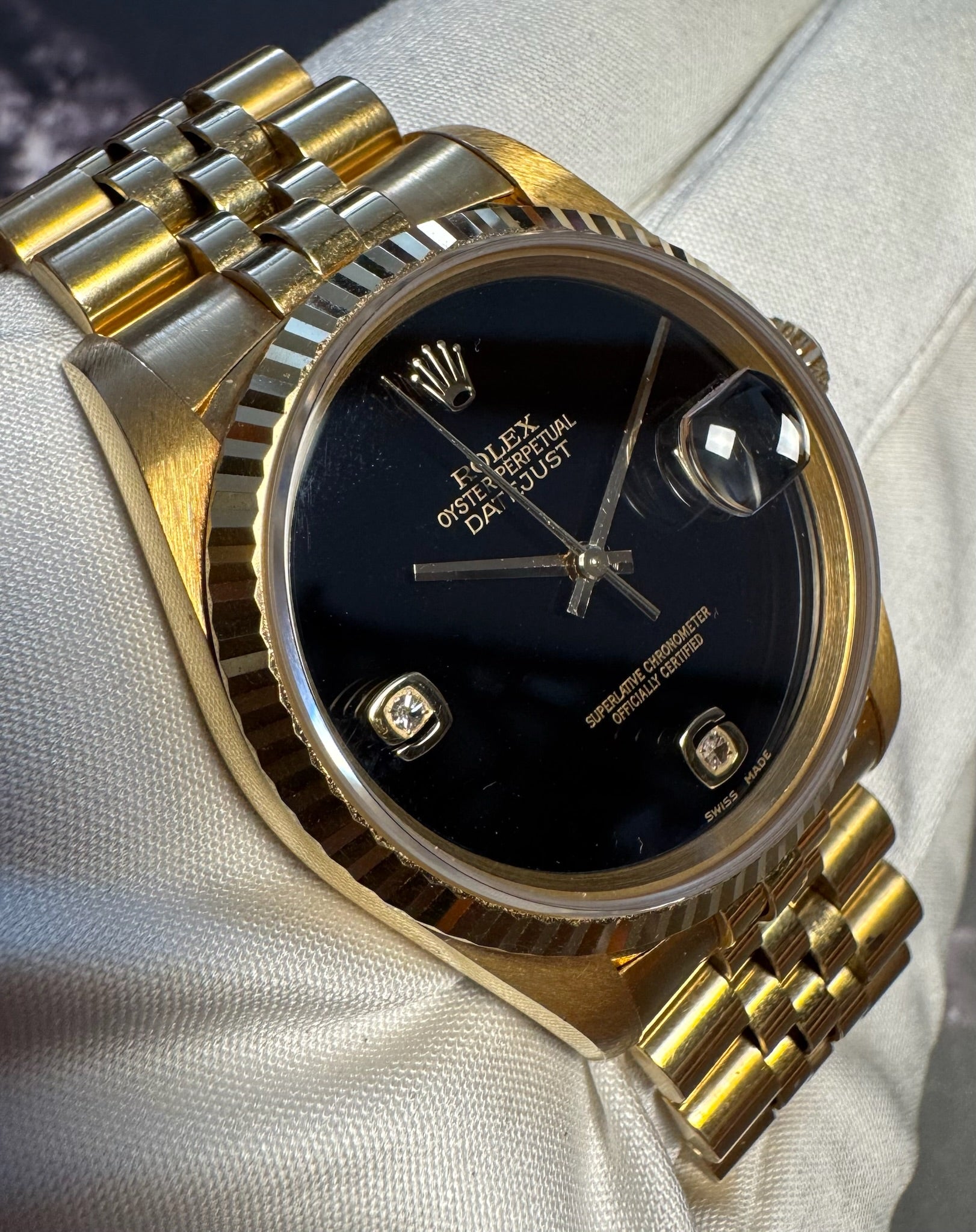 The original yellow gold Jubilee bracelet is exceptionally well-preserved, displaying minimal stretch and adding to the watch’s refined presence on the wrist. Powered by a recently serviced movement from the prior owner, this Datejust runs accurately and performs reliably.
