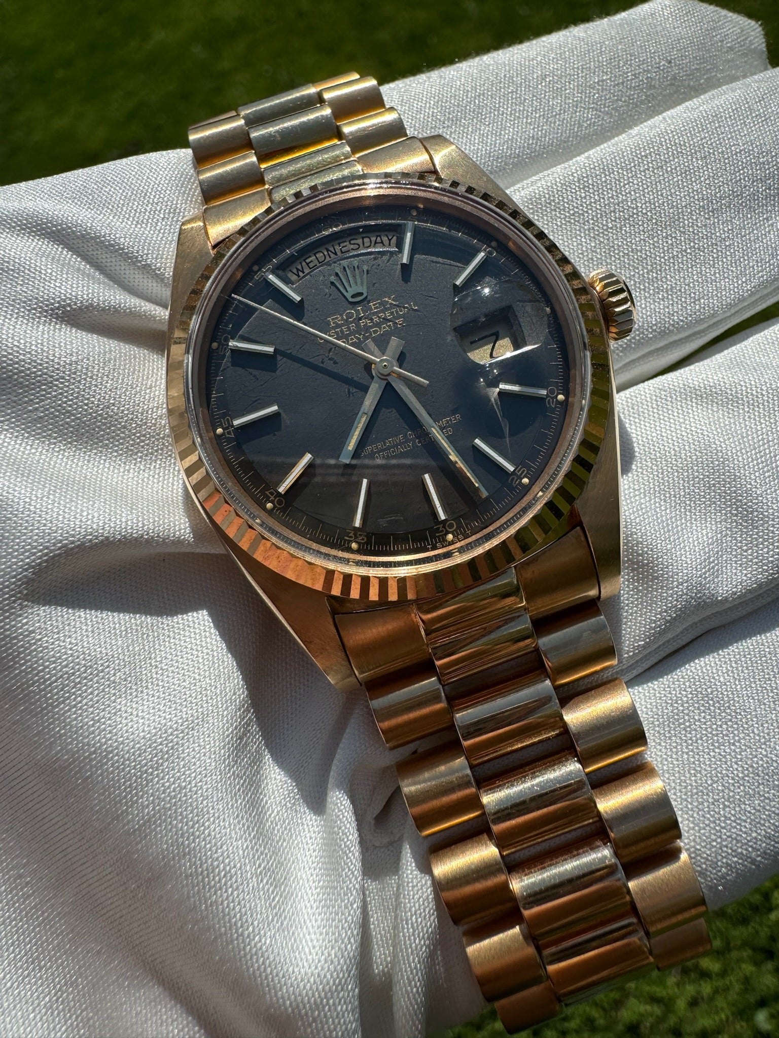 Presenting an immaculate Rolex Day-Date 1803, crafted in luxurious 18K rose gold and meticulously preserved in mint condition. The timepiece showcases a sophisticated grayish brown original dial complemented by matching rose gold hands, exuding timeless elegance.