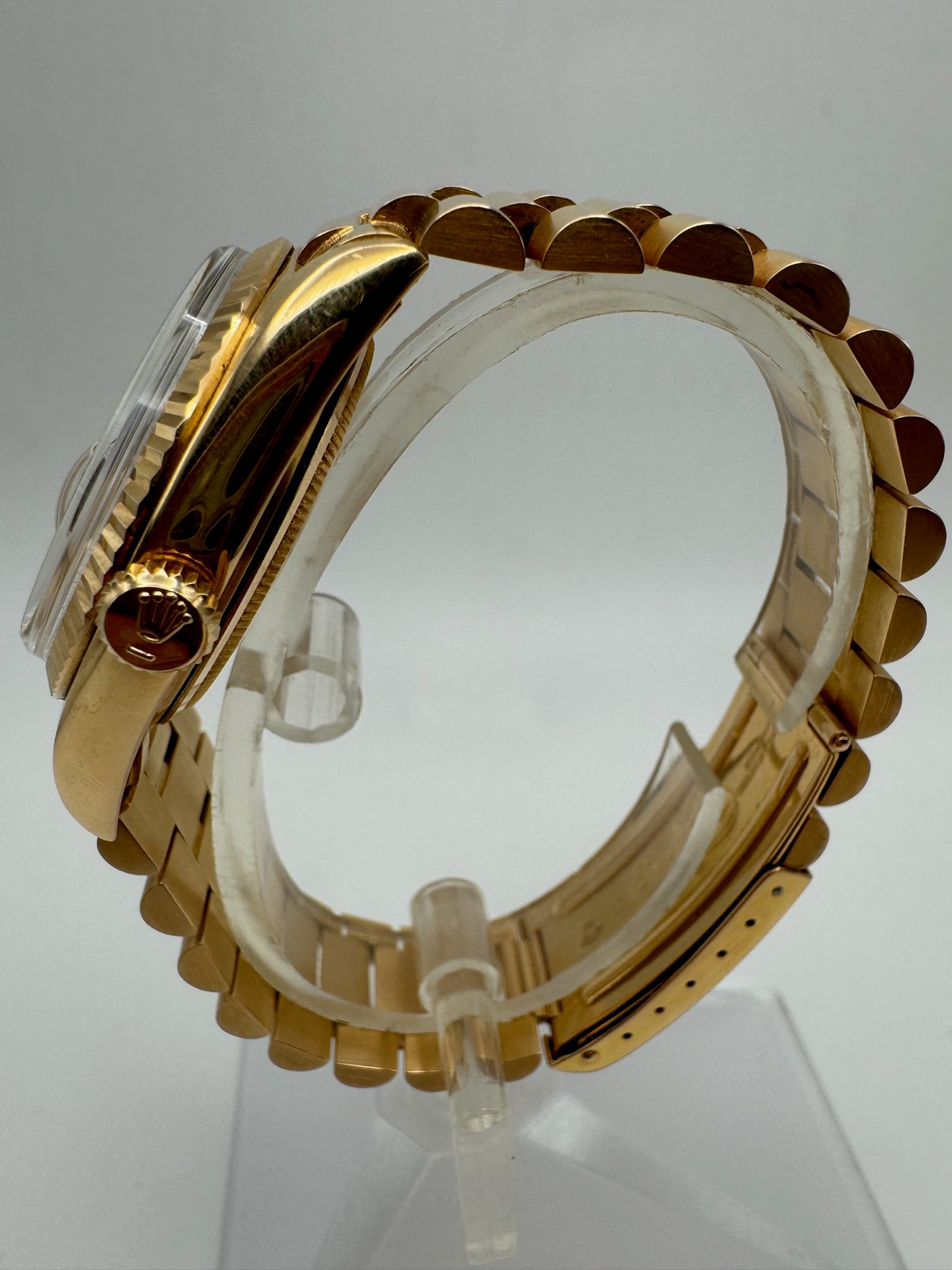 The Day-Date stands as a cornerstone timepiece within Rolex's collection, embodying notions of authority and achievement since its debut. Unveiled in 1956, it swiftly ascended to the ranks of coveted luxury watches, epitomizing sophistication and status.