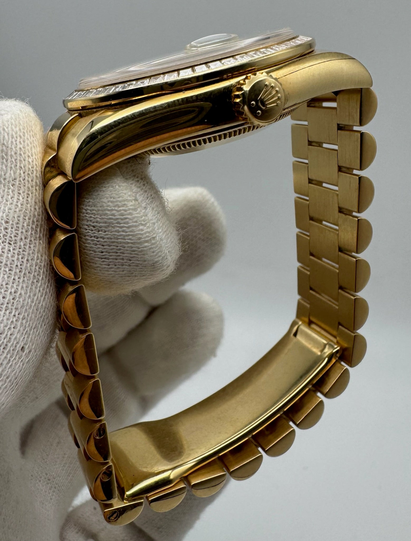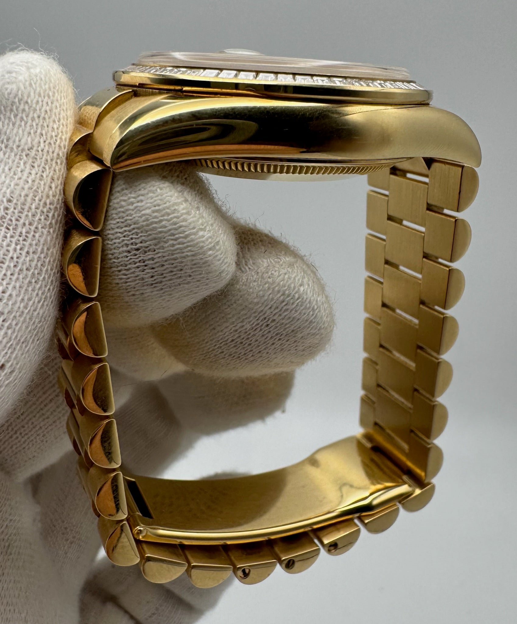 Complementing the dial is an equally rare factory-set baguette diamond bezel, preserved in pristine condition and adding a bold yet refined presence to the watch. According to provenance, this piece was purchased new by a VIP Rolex client and carefully worn, making it a single-owner example that is virtually impossible to source today. Its configuration suggests a special order or limited production run.