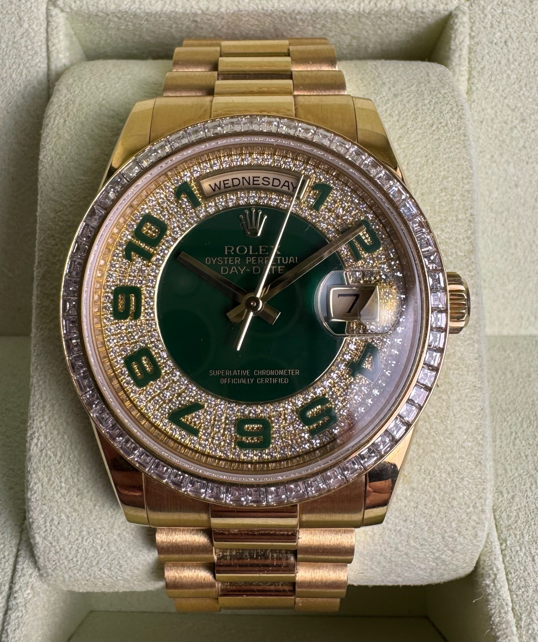 Rolex Day-Date 36 Extremely Rare Green Enamel Dial Factory Diamonds Baguette Bezel 2016 (Full-Set/Unpolished)