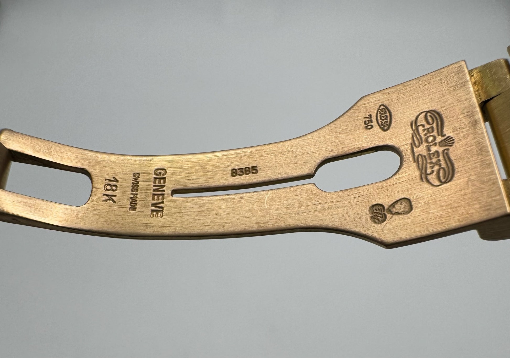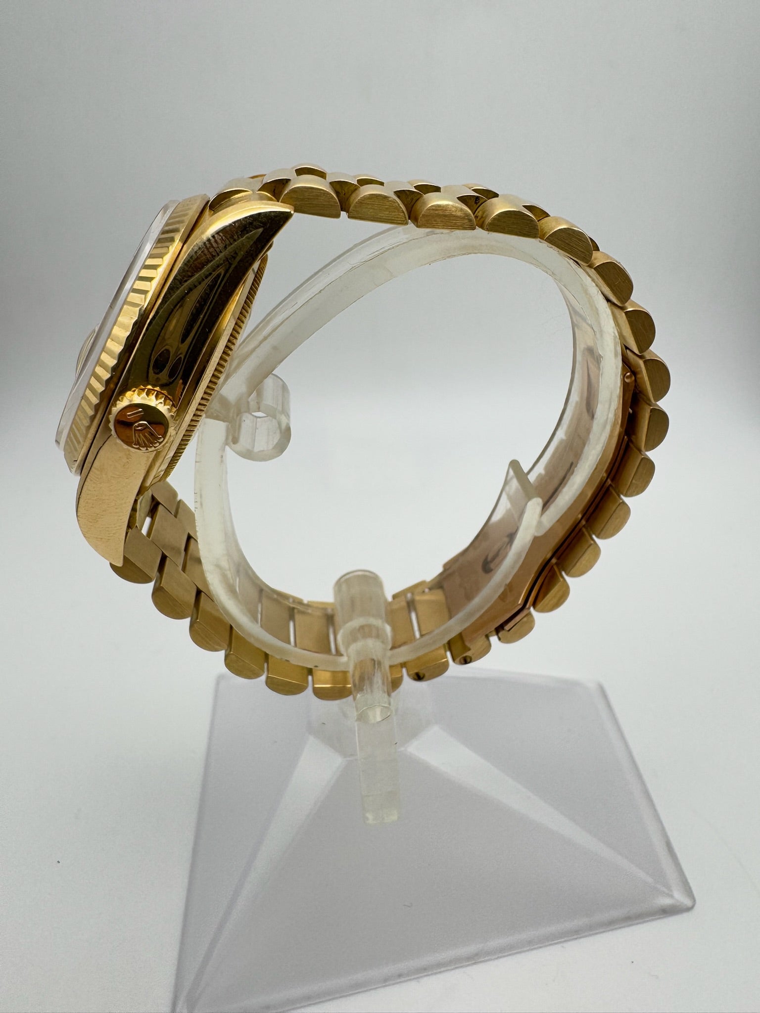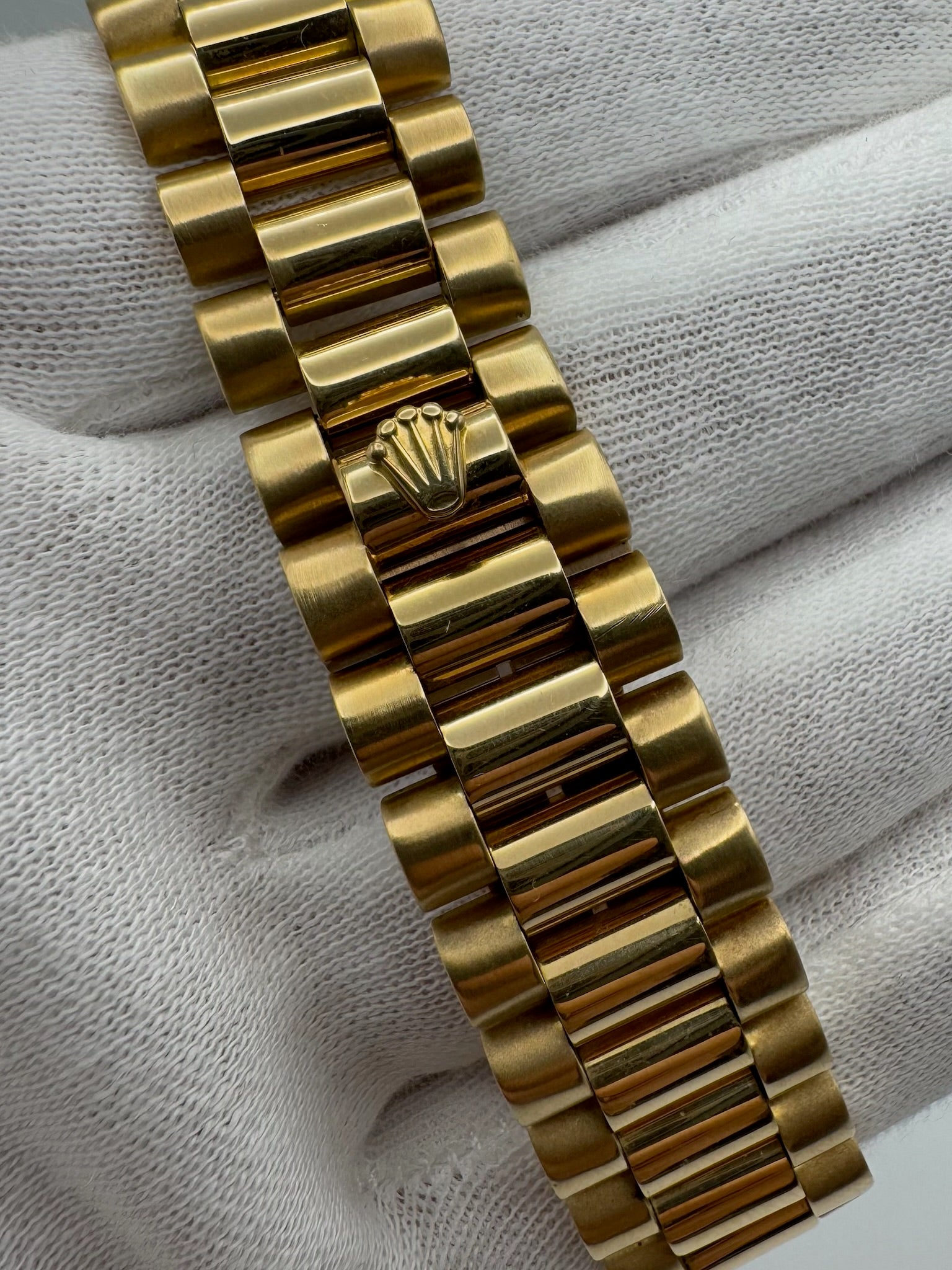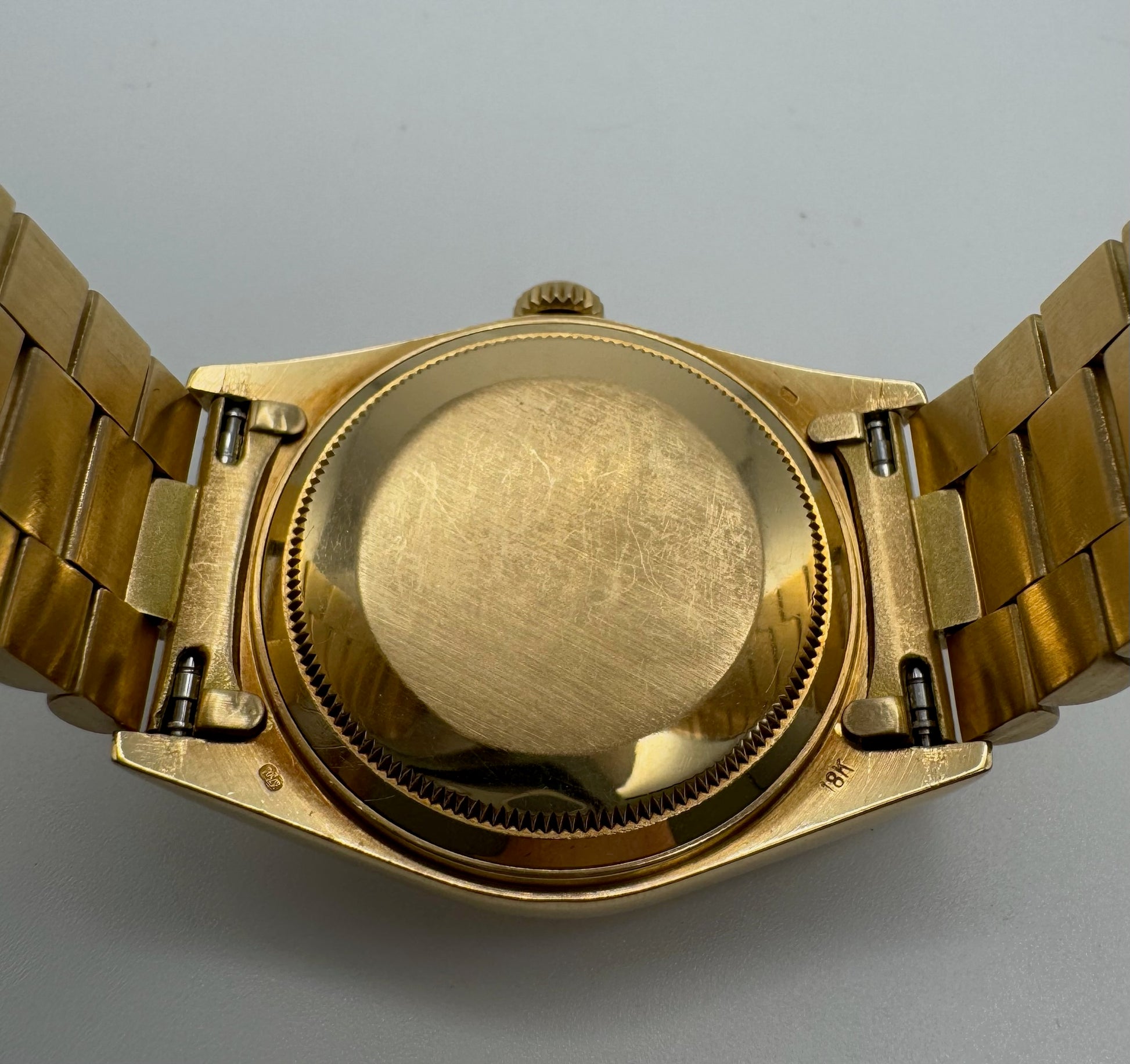 The reference 18038, produced during the late 1970s and 1980s, is a hallmark of this model’s evolution. Featuring an 18k yellow gold case, a fluted bezel, and Rolex’s innovative quickset feature for the date, the 18038 perfectly combines functionality with refined design. Its availability with rare dial variations, such as the champagne tapestry dial, further enhances its appeal among collectors and enthusiasts.