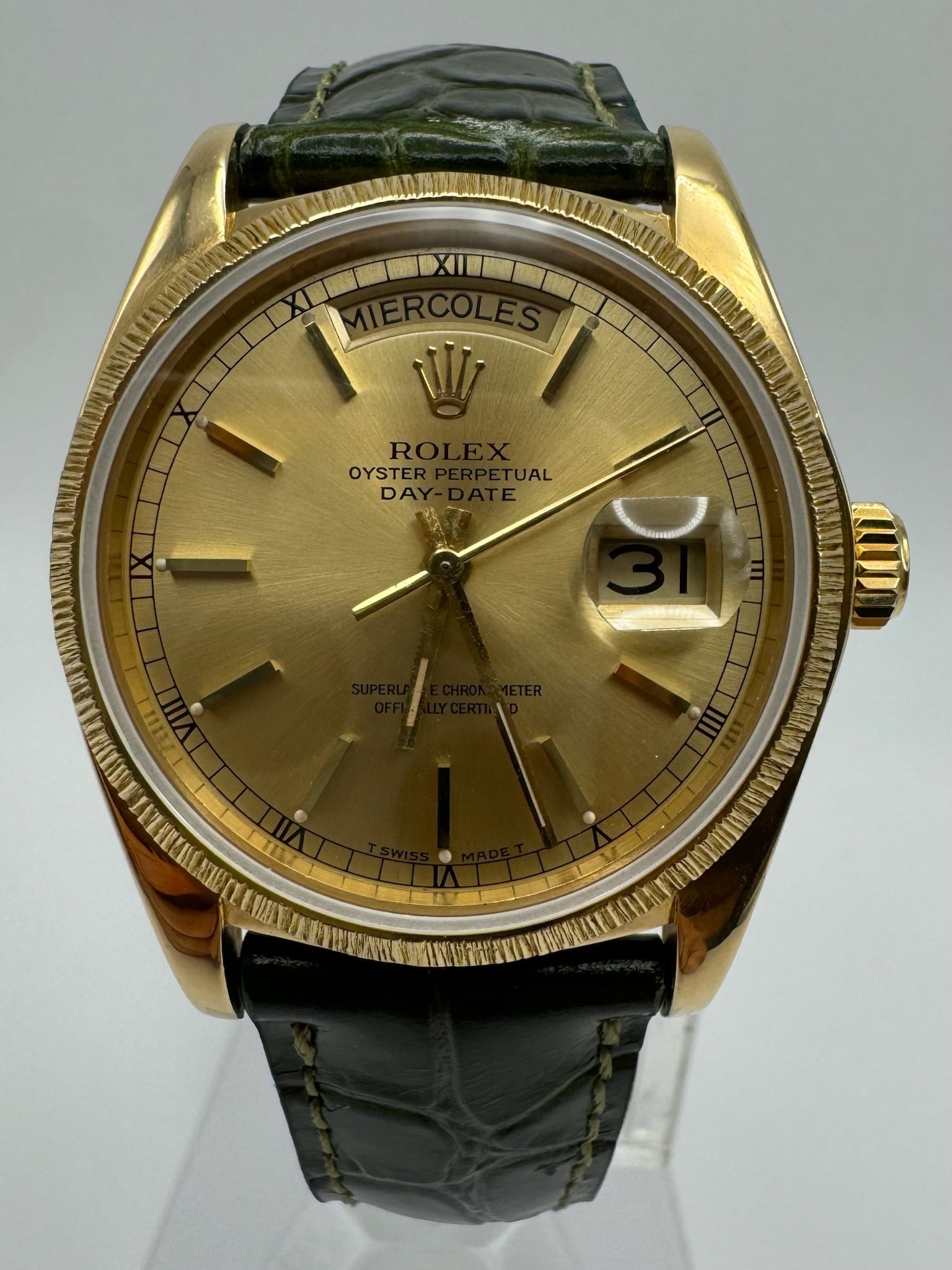 Rolex Day-Date 18078 - Yellow Gold with Bark Finish Bezel and Spanish Date