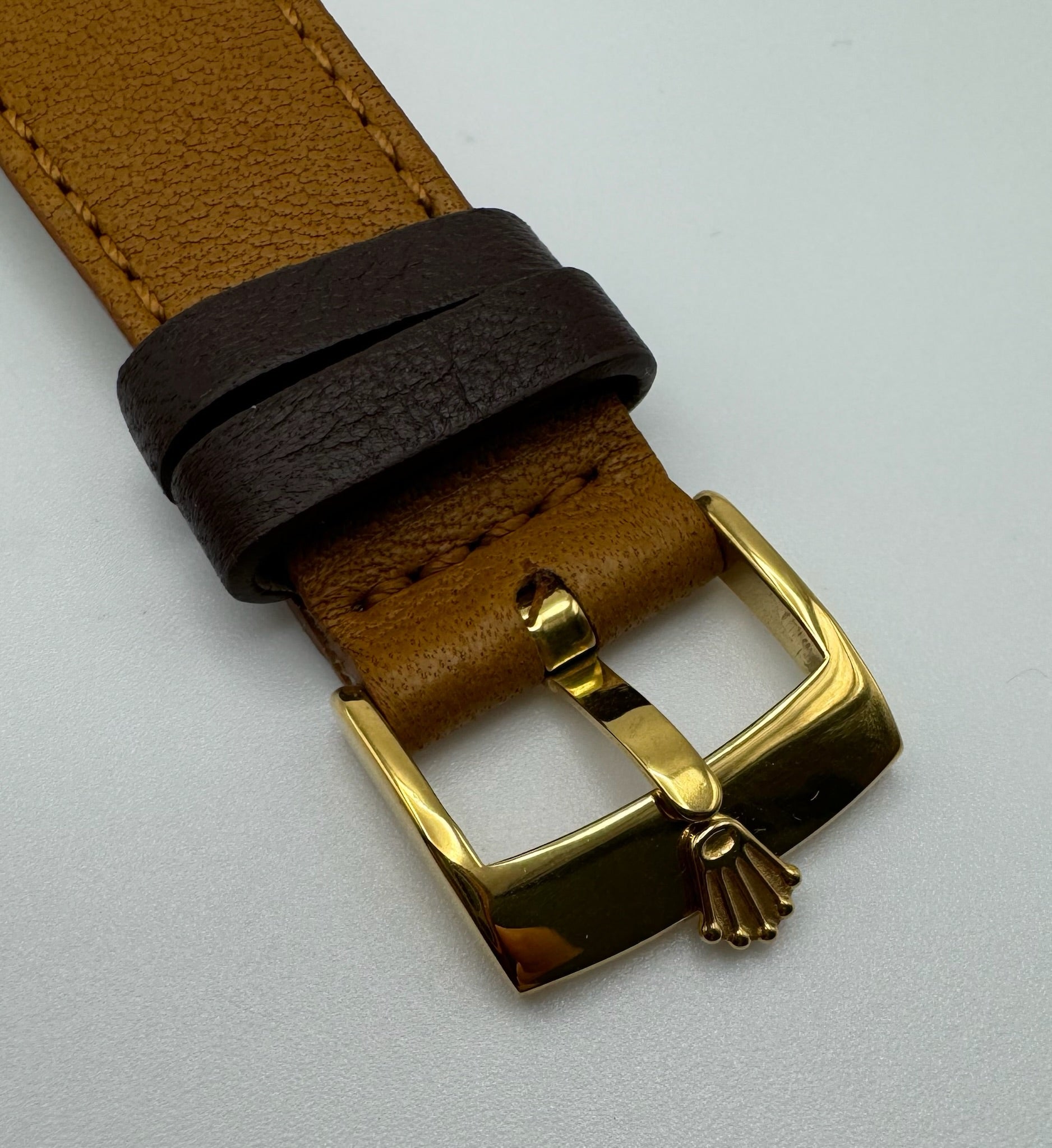 The original champagne dial is exceptionally well-preserved, featuring intact tritium plots and perfectly matching tritium hands. The reference and serial numbers on the case are clearly visible, ensuring authenticity. Powered by a movement serviced in May 2024, this watch runs smoothly. It comes fitted with a new high-quality handmade leather strap, complemented by a gold-plated Rolex pin buckle.