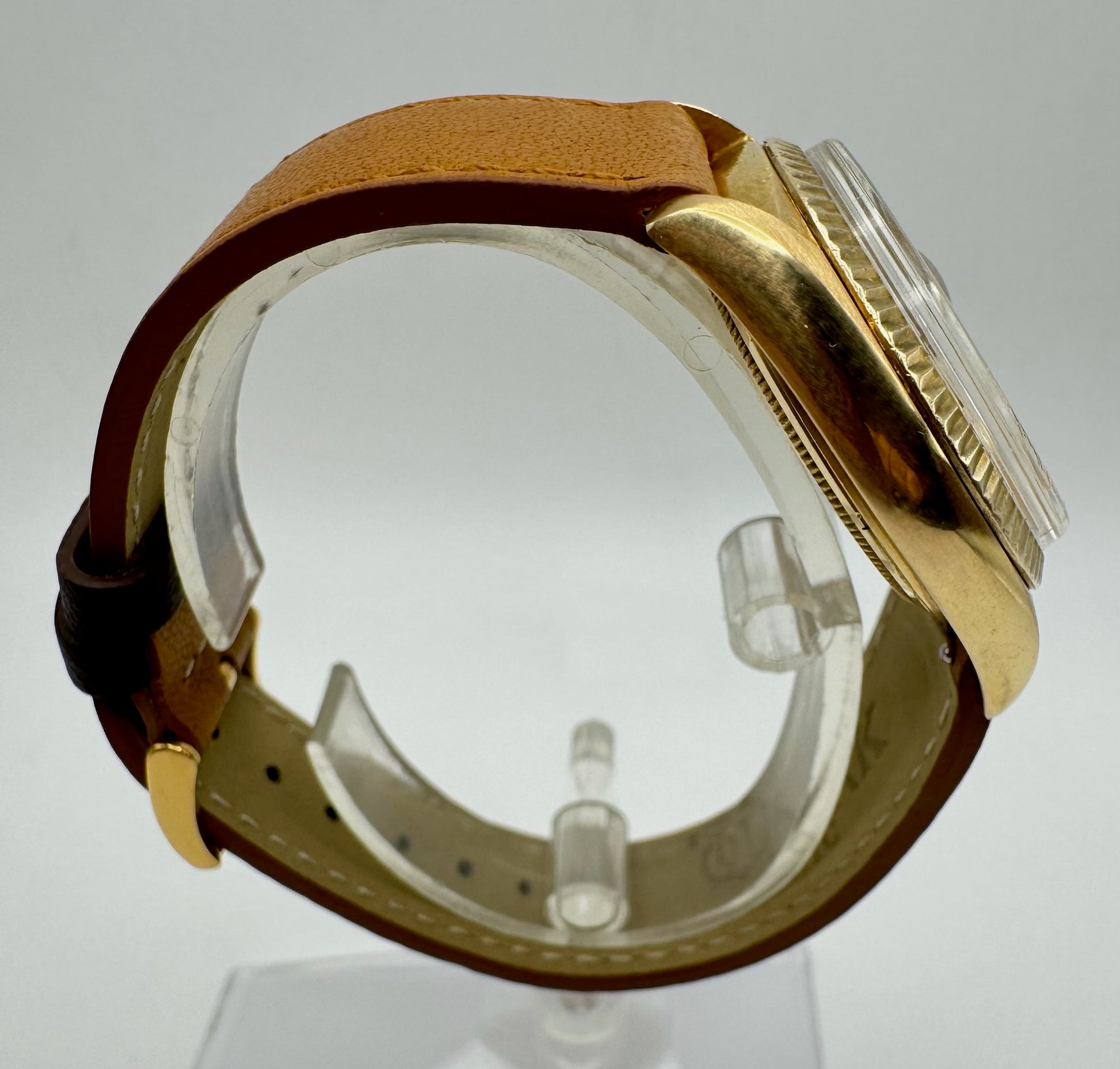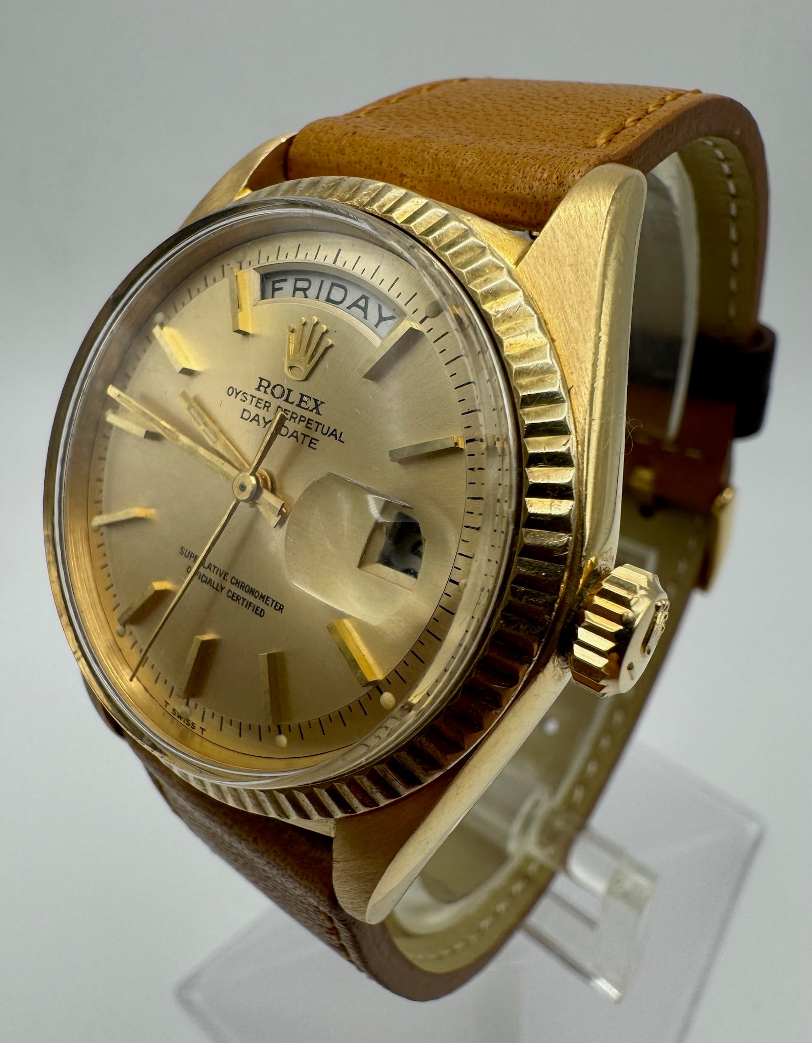 This Rolex Day-Date 1803 in 18k yellow gold is a striking vintage piece in very nice condition. The case showcases thick, sharp lugs with visible signs of wear that give it a distinctive character, while maintaining its refined appearance. The bezel, though showing wear, remains sharp and adds to the vintage appeal of this timepiece.