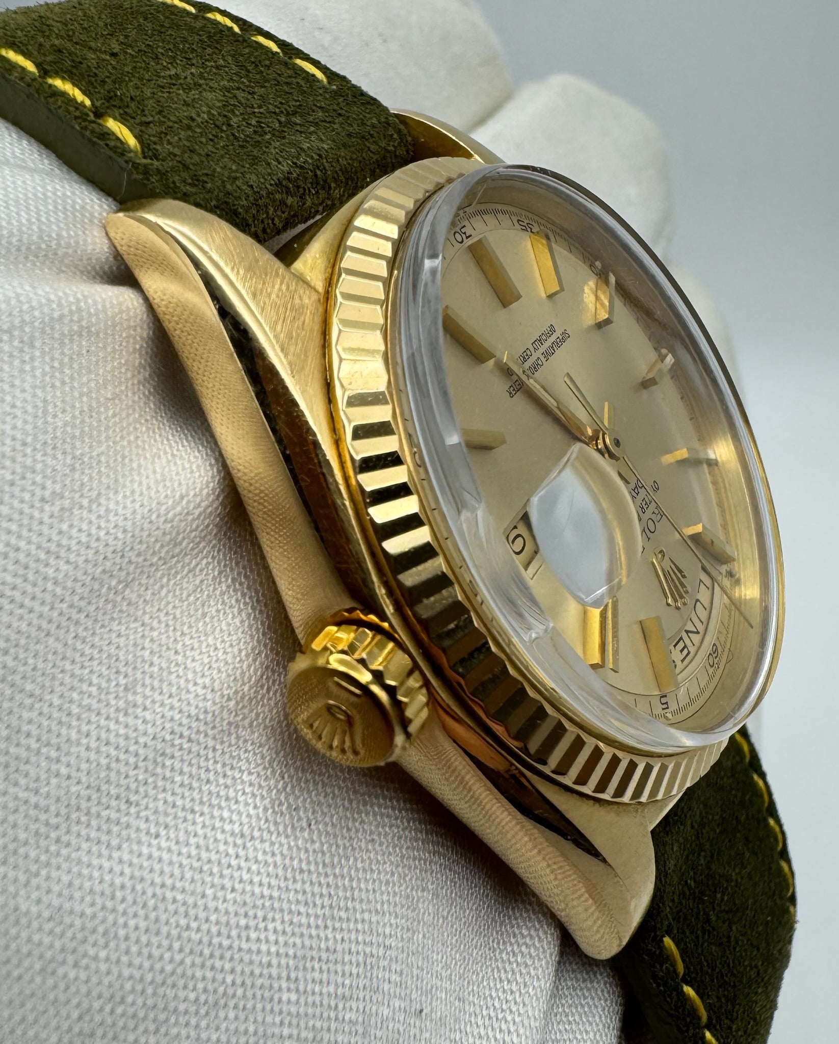 This original Rolex Day-Date 1803 in yellow gold is a classic and highly collectible piece, presented in excellent overall condition. The case features thick lugs and has naturally retained signs of wear, reflecting its vintage charm. Its gold fluted bezel remains remarkably sharp, showing only minimal signs of wear and avoiding the heavy polishing commonly seen on other 1803 models.