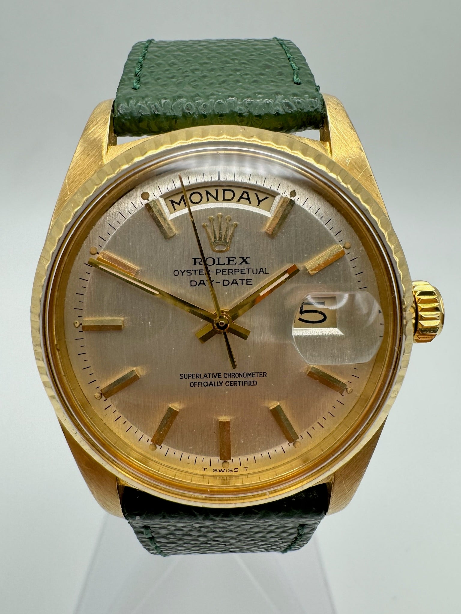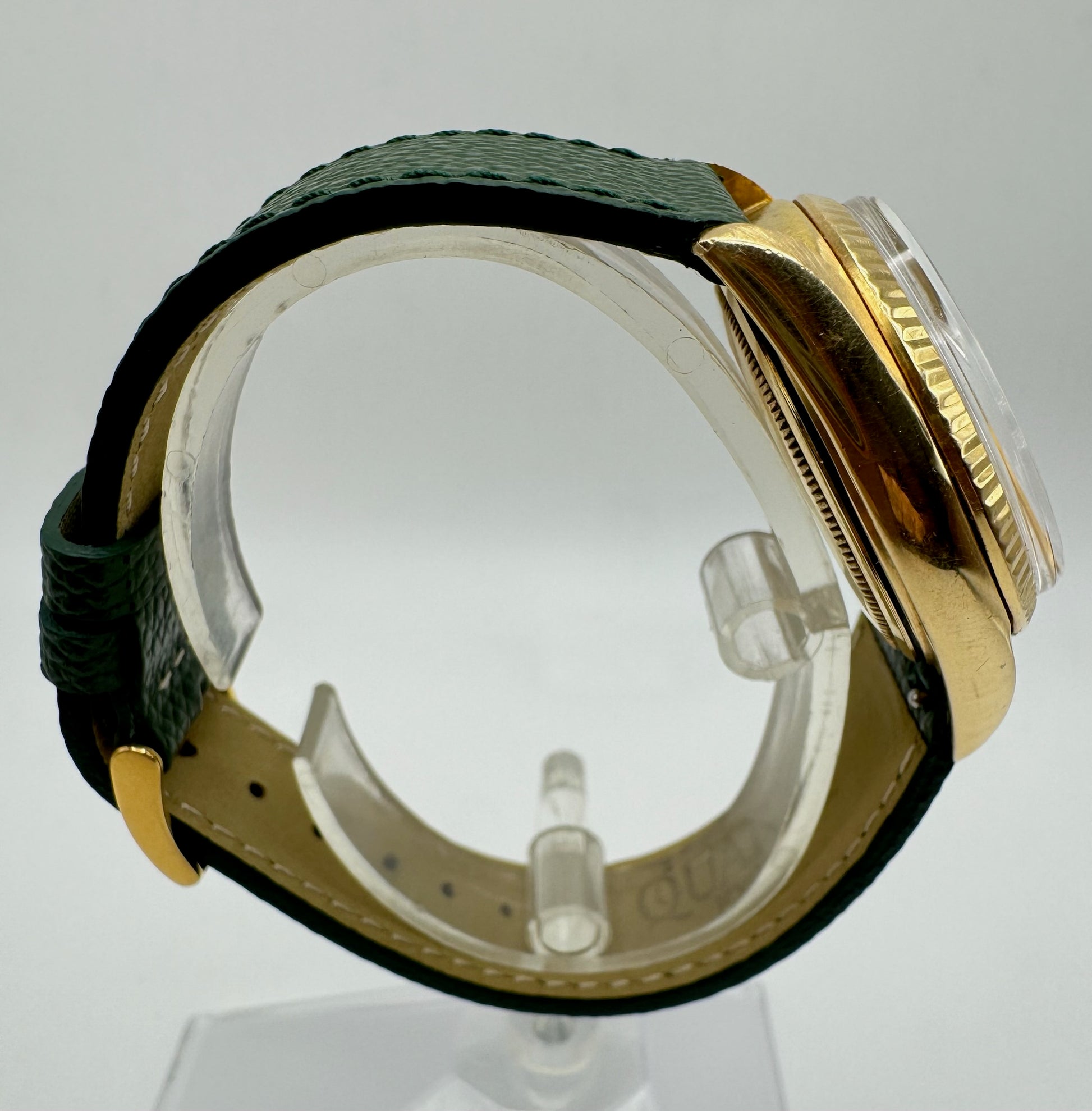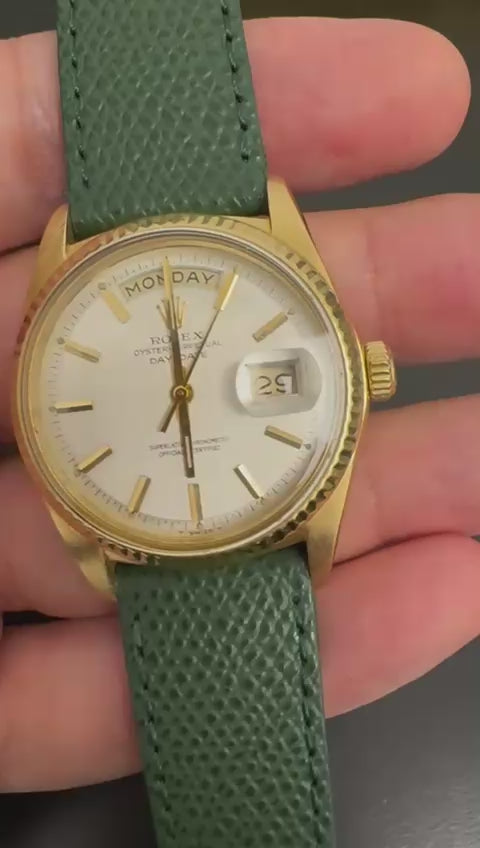 The movement has been serviced in July 2024, ensuring it runs accurately. It is paired with a handmade green Italian leather strap (20mm) and finished with a 16mm gold-plated Rolex pin buckle. With a serial number of 2.6 million, this watch dates back to 1969, making it a true collector's item.