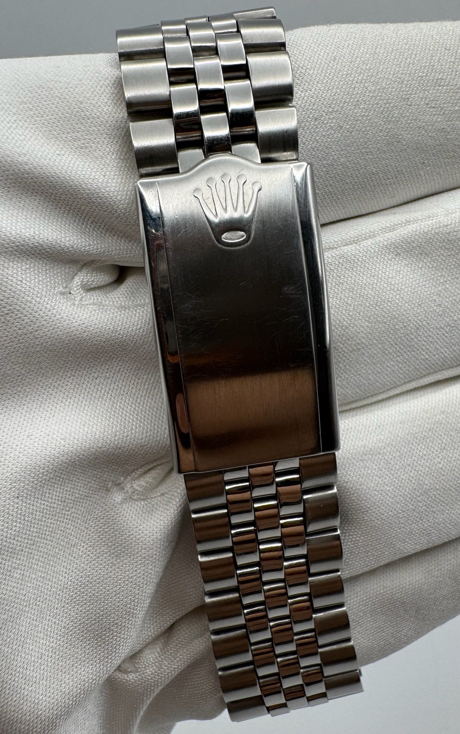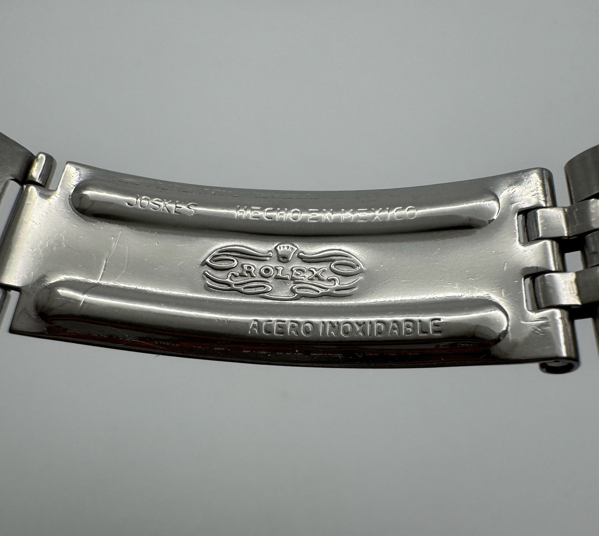 The watch also features an early service blue-back Pepsi insert, slightly faded, and in excellent condition. One of the standout features is the rare Mexican Jubilee bracelet, marked “Hecho En Mexico.” This highly desirable bracelet shows minimal to no stretch and boasts a large Rolex logo on the clasp, adding to its collectibility.